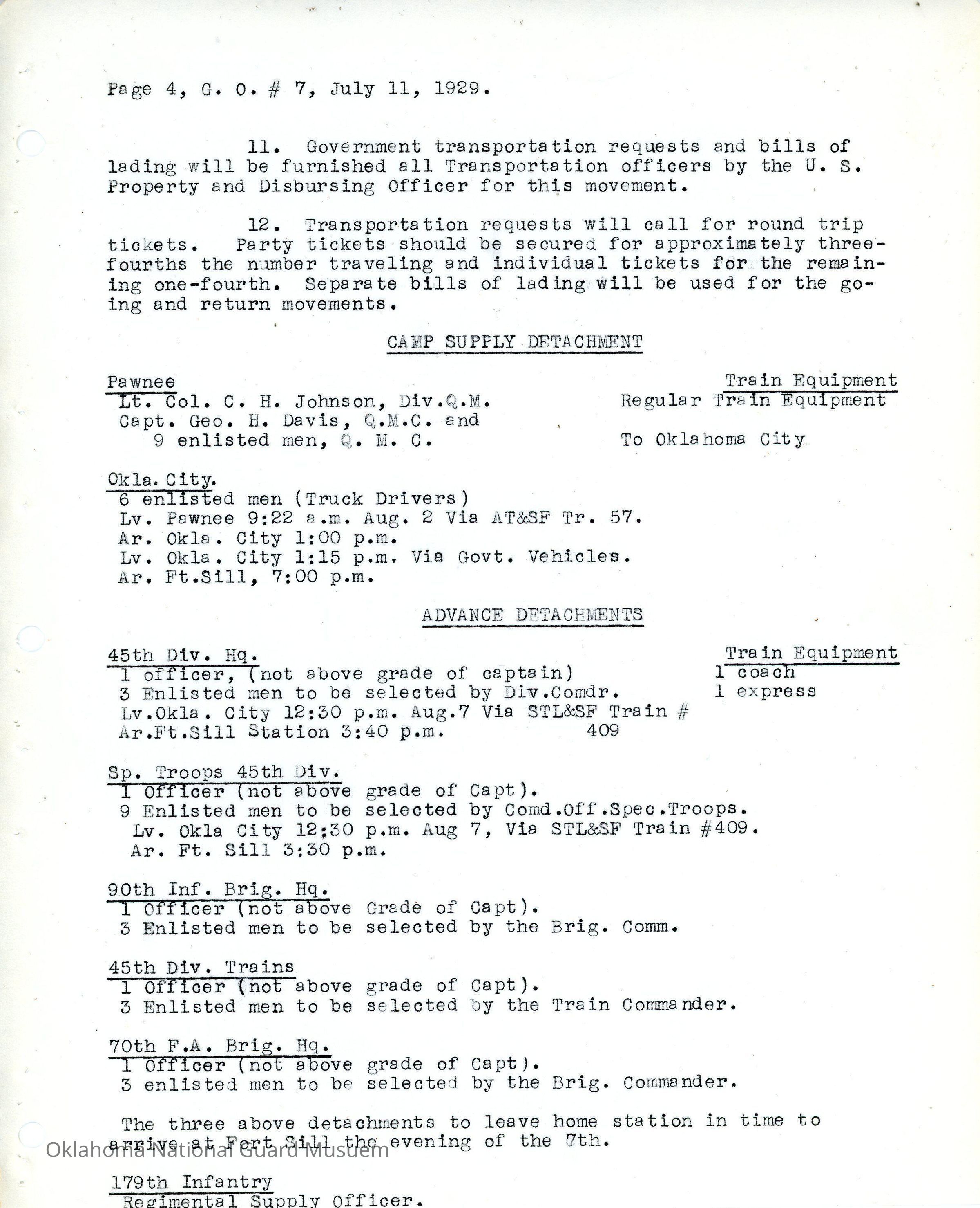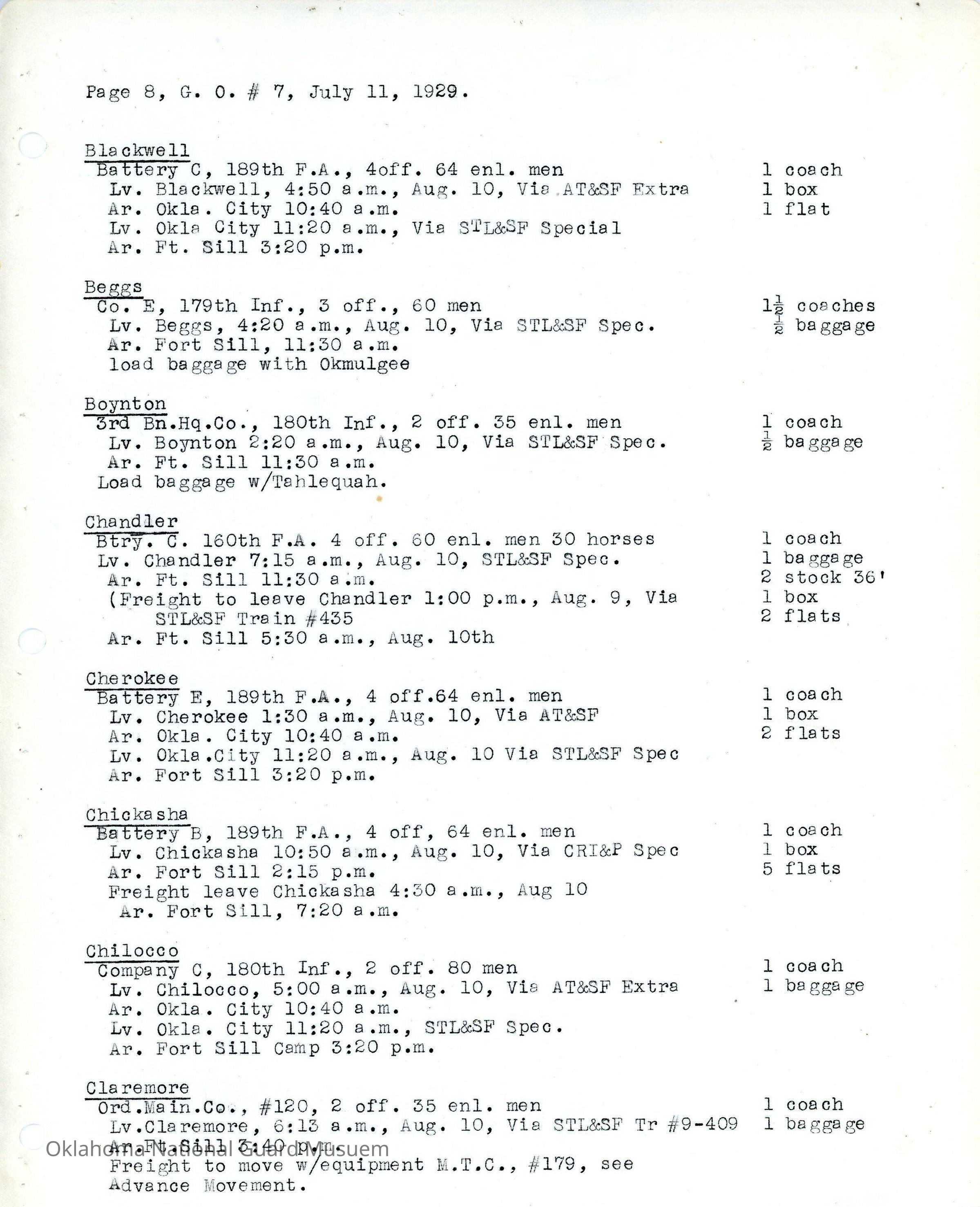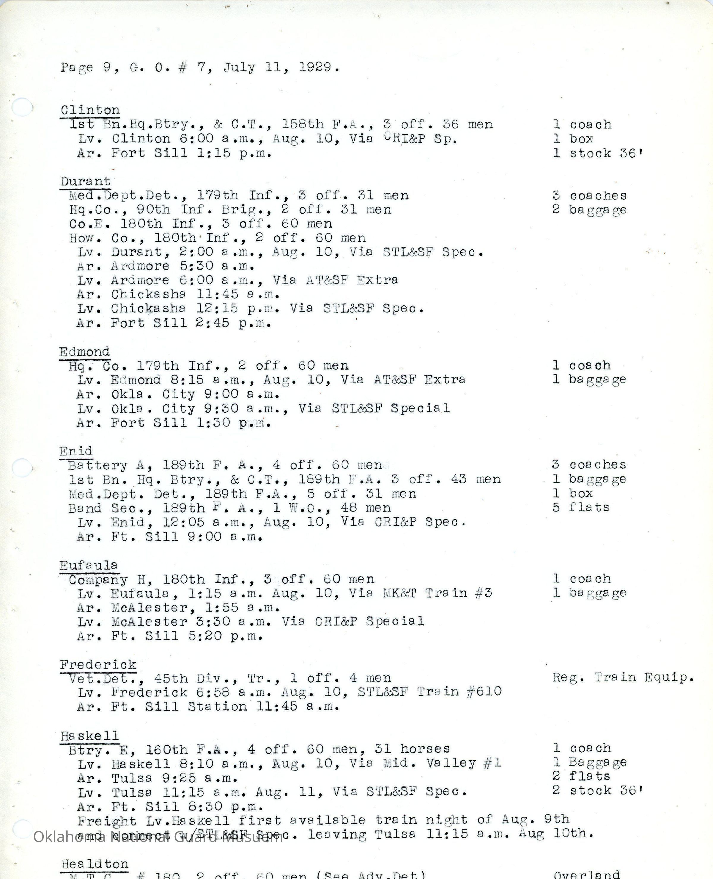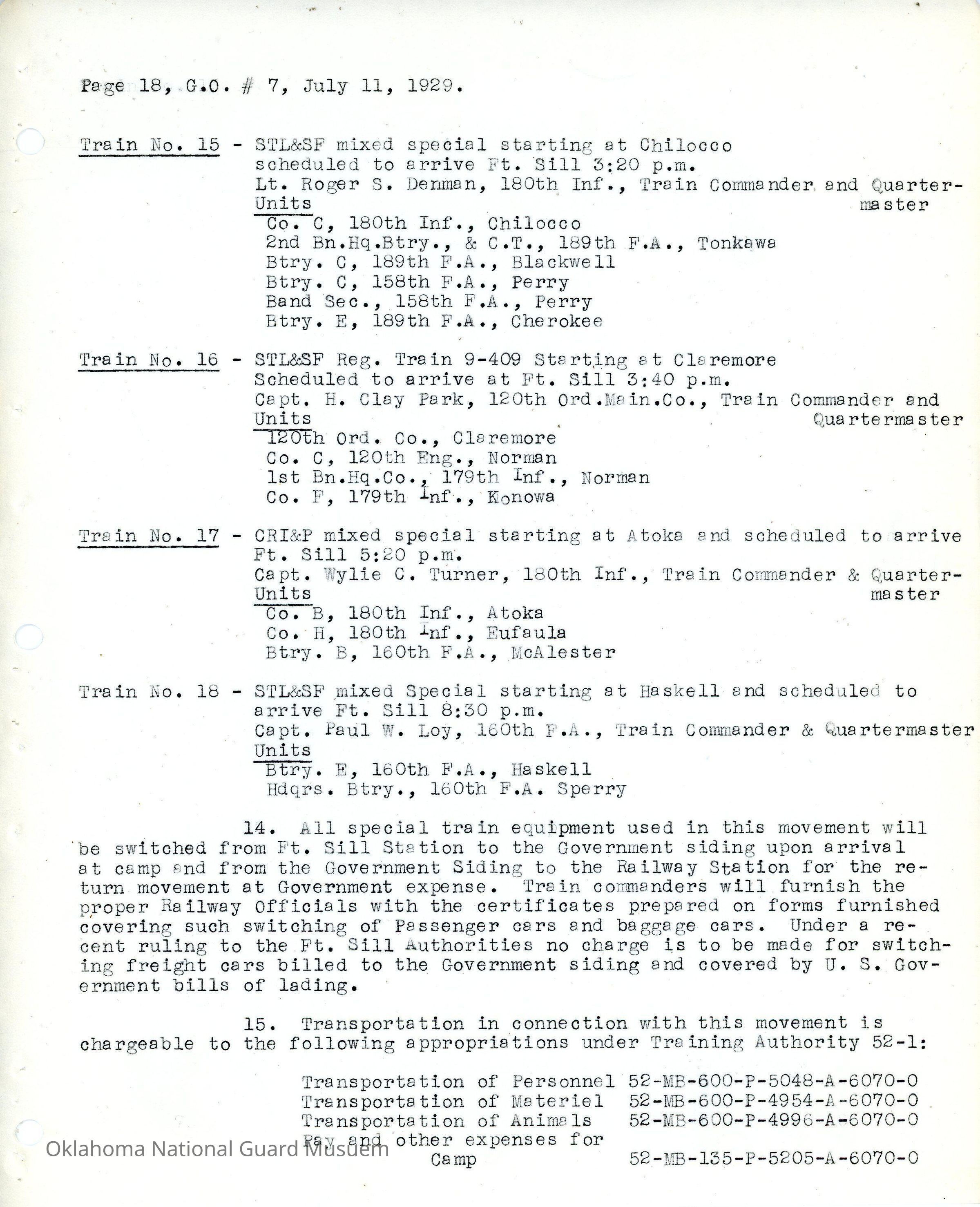 General Order #7 from Headquarters Adjutant General's Office in Oklahoma City. The order details the schedule of transportation from home stations to Fort Sill for the Camp of Instruction.Date(s) of Creation