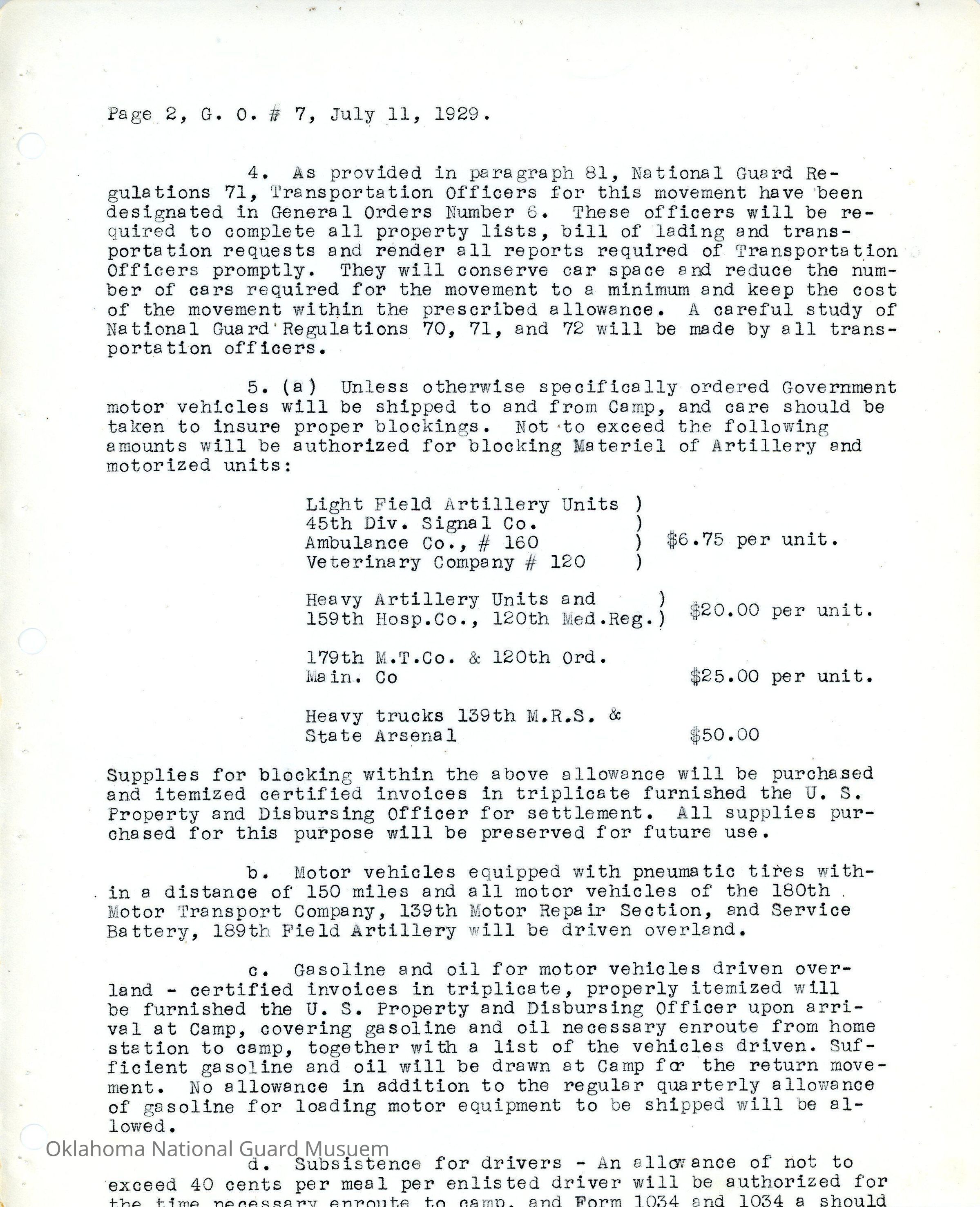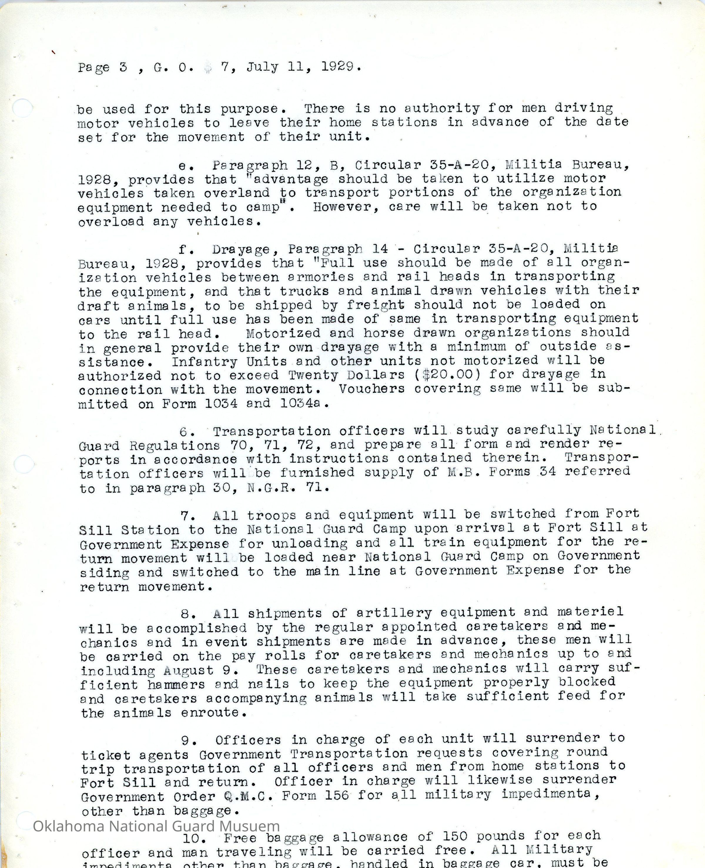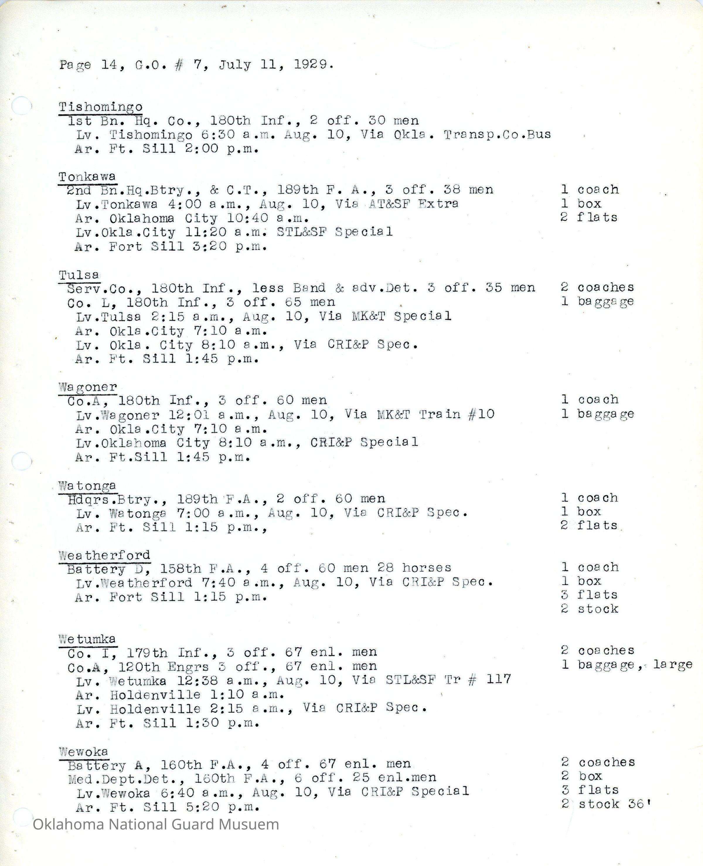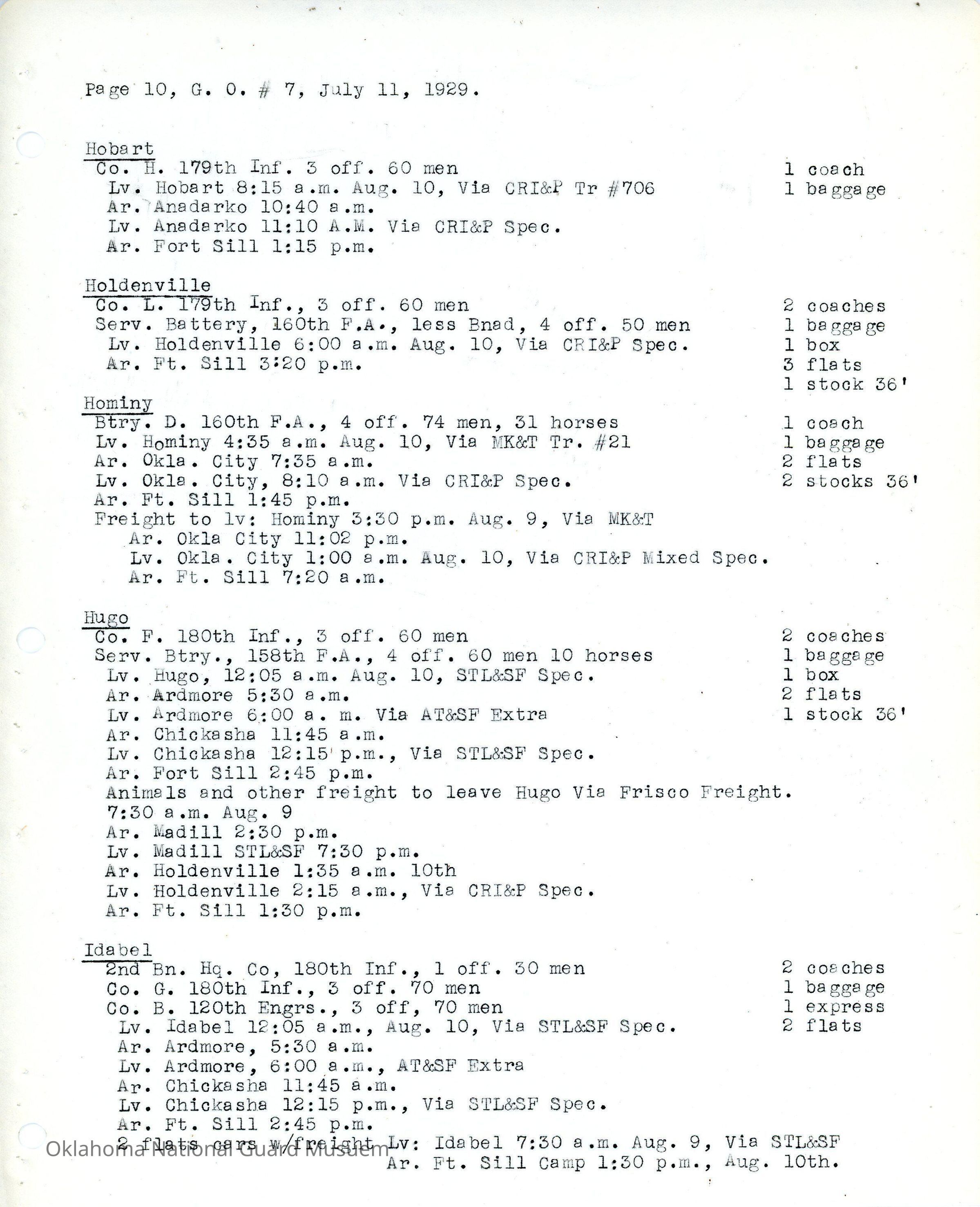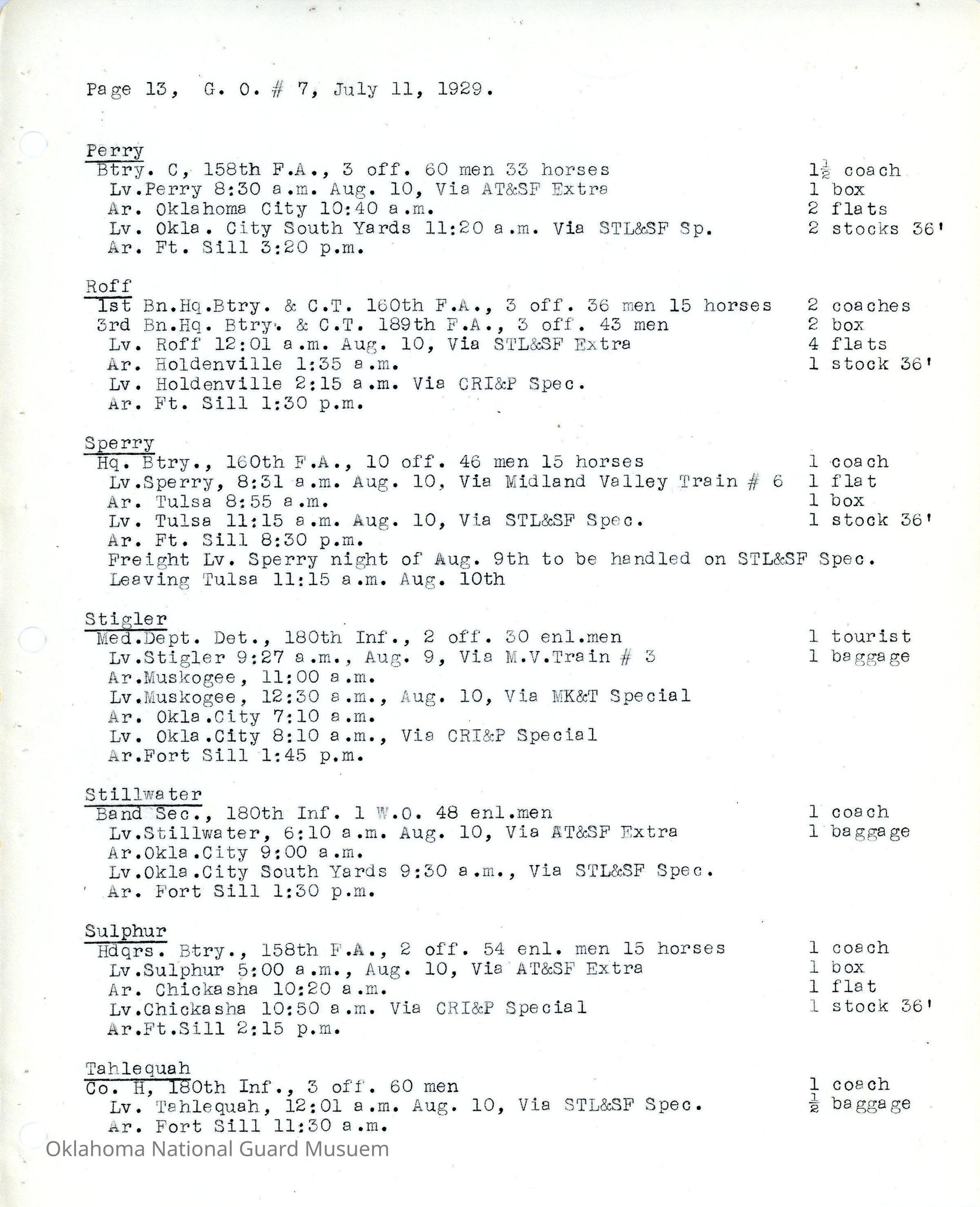 General Order #7 from Headquarters Adjutant General's Office in Oklahoma City. The order details the schedule of transportation from home stations to Fort Sill for the Camp of Instruction.Date(s) of Creation