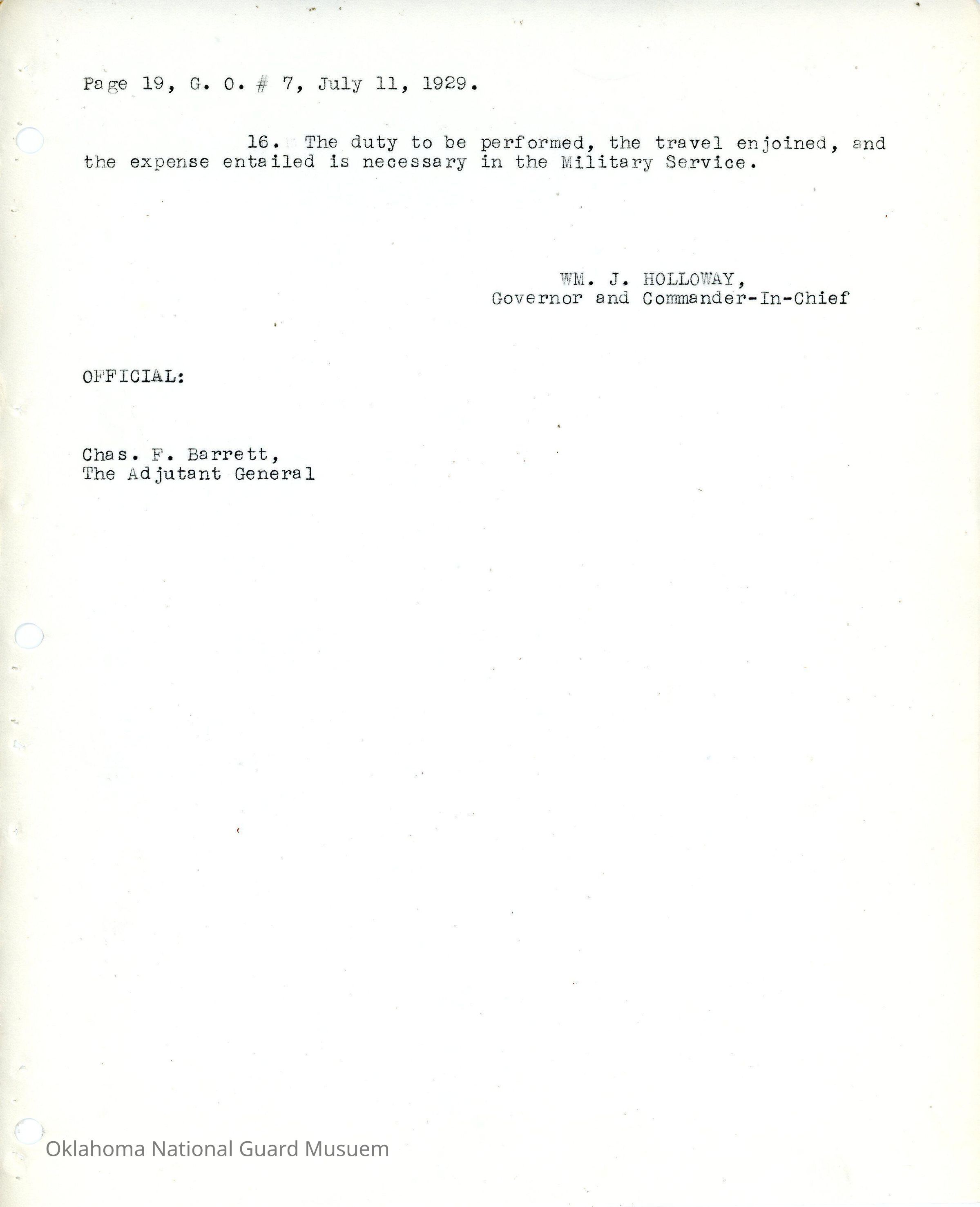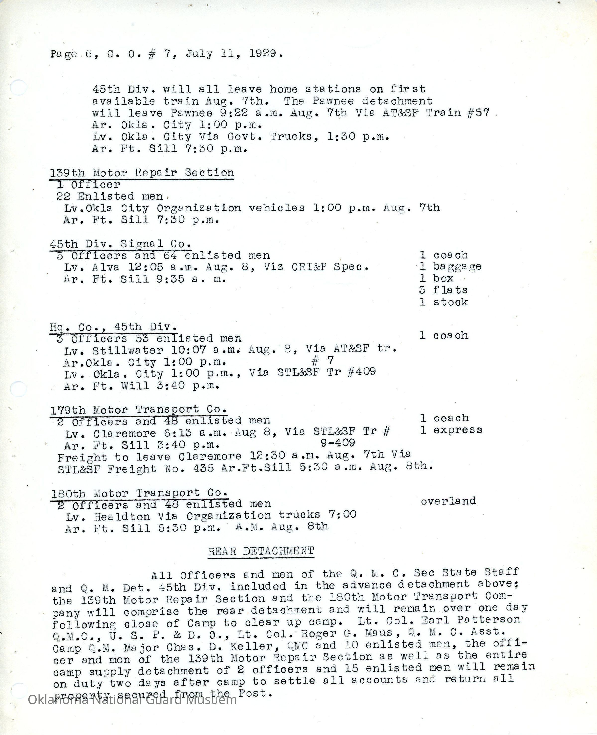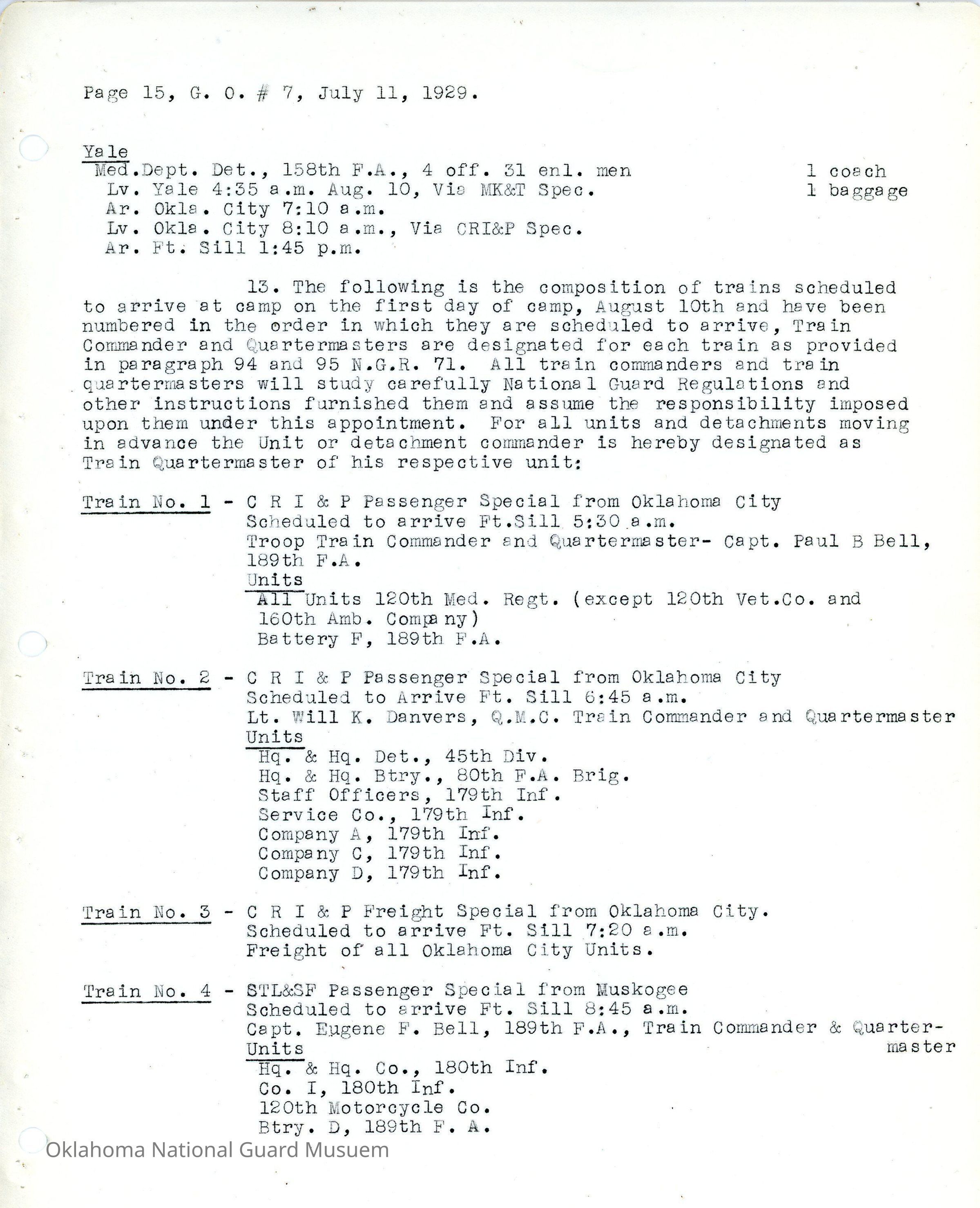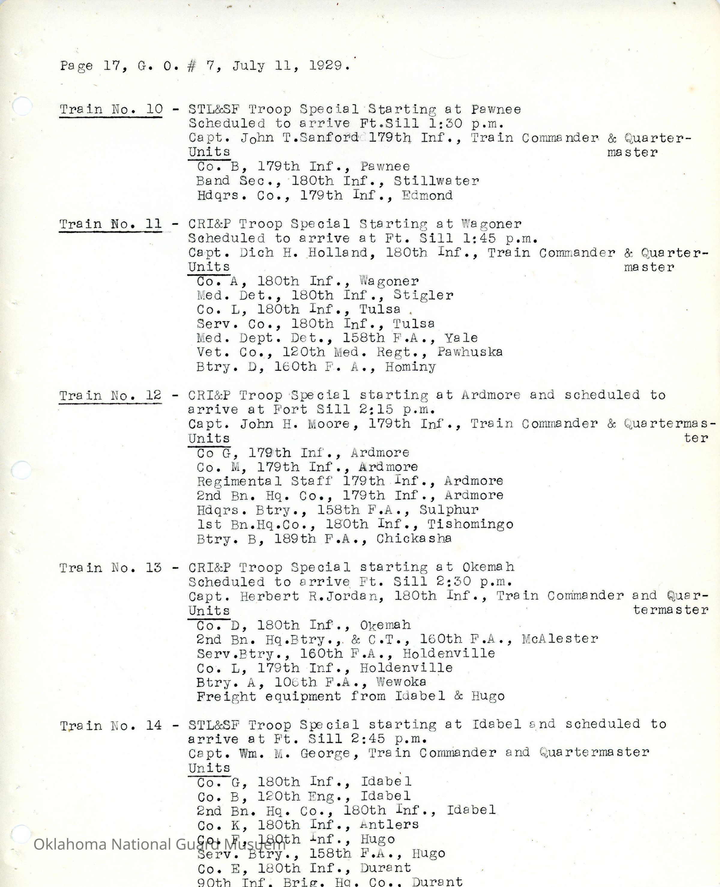 General Order #7 from Headquarters Adjutant General's Office in Oklahoma City. The order details the schedule of transportation from home stations to Fort Sill for the Camp of Instruction.Date(s) of Creation