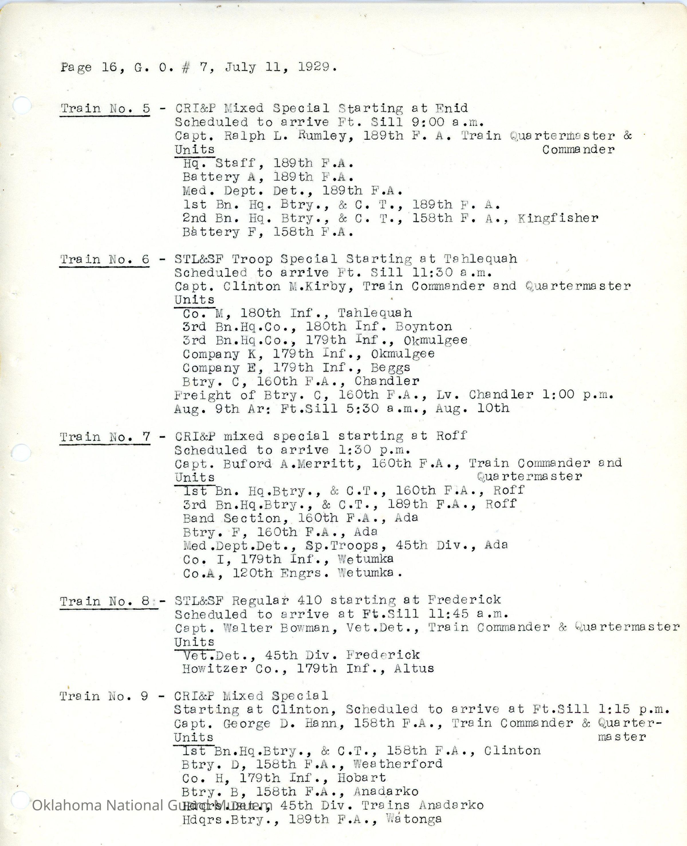 Adjutant General, Oklahoma City, Charles F. Barrett, William J. Holloway, Fort Sill, Camp of Instruction, Transportation, Train, Equipment, 45th Division Signal Corps, 160th Ambulance Company, 120th Veterinary Company, 120th Medical Regiment, 189th Field Artillery, Camp Supply Detachment, Pawnee, George H. Davis, Charles H. Johnson, Trucks, Advance Detachments, Special Troops, 90th Infantry Brigade, 45th Division Trains, 70th Field Artillery Brigade, 179th Infantry, 180th Infantry, 158th Field Artillery Regiment, Hugo, Tulsa, Lawton, 160th Field Artillery, Holdenville, 189th Field Artillery, Minco, 120th Engineers, Norman, Earl Patterson, Roger G. Maus, Charles D. Keller, F.M. Wood, Leo Rundstein, Ponca City, Alva, Stillwater, Claremore, Healdton, Rear Detachment, Ada, Altus, Anadarko, Antlers, Chickasha, Ardmore, Atoka, McAlester, Blackwell, Beggs, Boynton, Chandler, Cherokee, Chilocco, Clinton, Durant, Edmond, Enid, Eufaula, Frederick, Haskell, Hobart, Hominy, Madill, Idabel, Kingfisher, Konowa, Marlow, Muskogee, Norman, Okemah, Okmulgee, Pawhuska, Perry, Roff, Sperry, Stigler, Stillwater, Sulphur, Tahlequah, Tishomingo, Tonkawa, Wagoner, Watonga, Weatherford, Wetumka, Wewoka, Yale, Paul B. Bell, Will. K. Danvers, Eugene F. Bell, Ralph L. Rumley, Clinton M. Kirby, Buford A. Merritt, Walter Bowman, George D. Hann, John T. Sanford, Dick H. Holland, John H. Moore, Herbert R. Jordan, William M. George, Roger S. Denman, H. Clay Park, Wylie C. Turner, Paul W. Loy