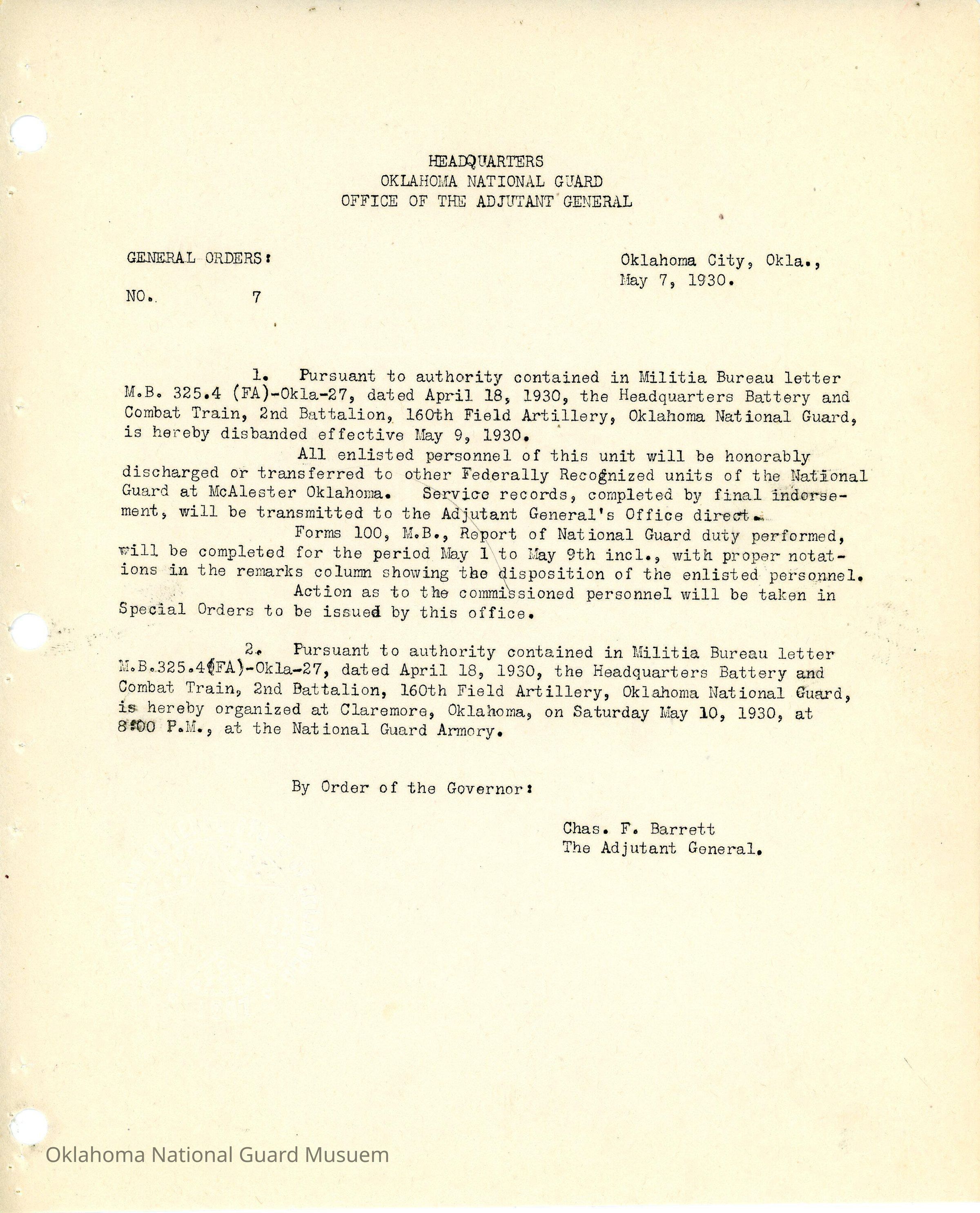 General Order #7 from Headquarters Adjutant General's Office in Oklahoma City. The order disbands the Headquarters Battery and Combat Train 2nd Battalion 160th Field Artillery and reorganizes them at ClaremoreDate(s) of Creation