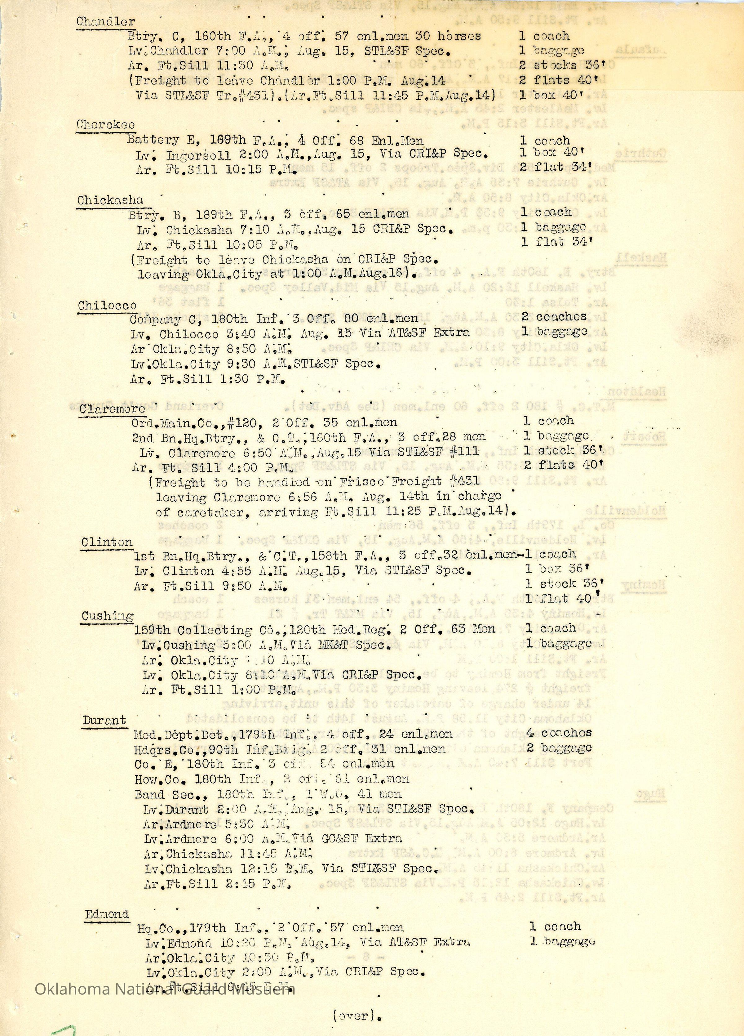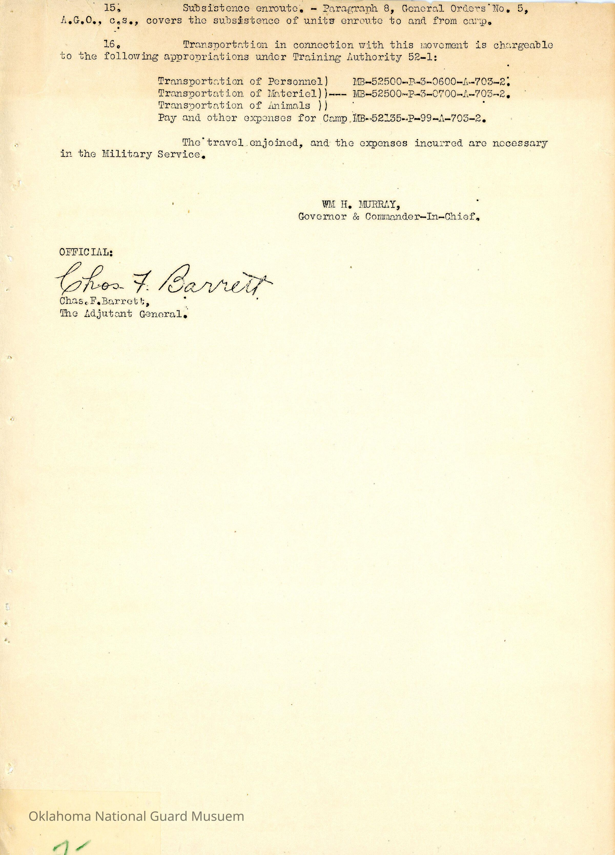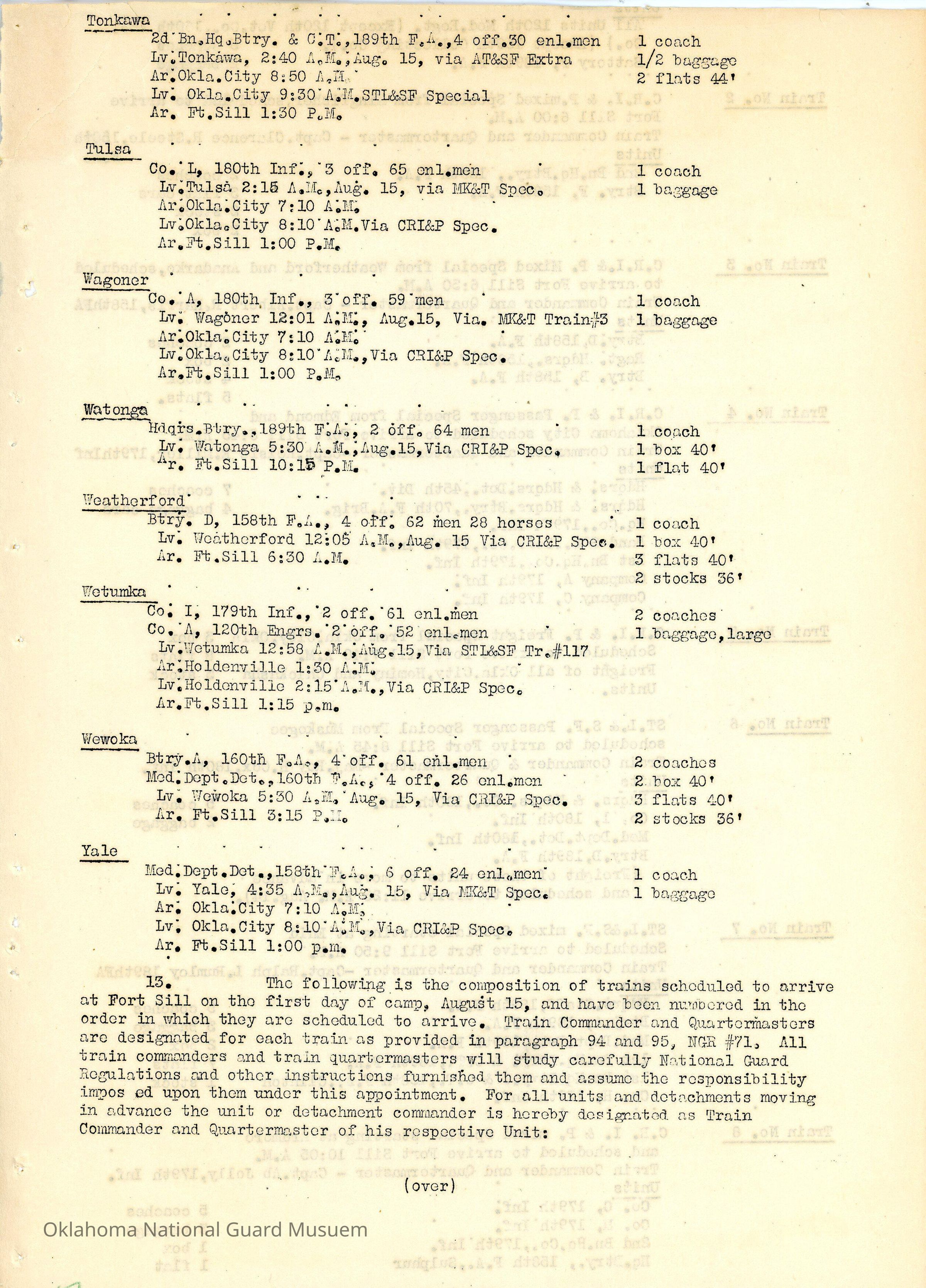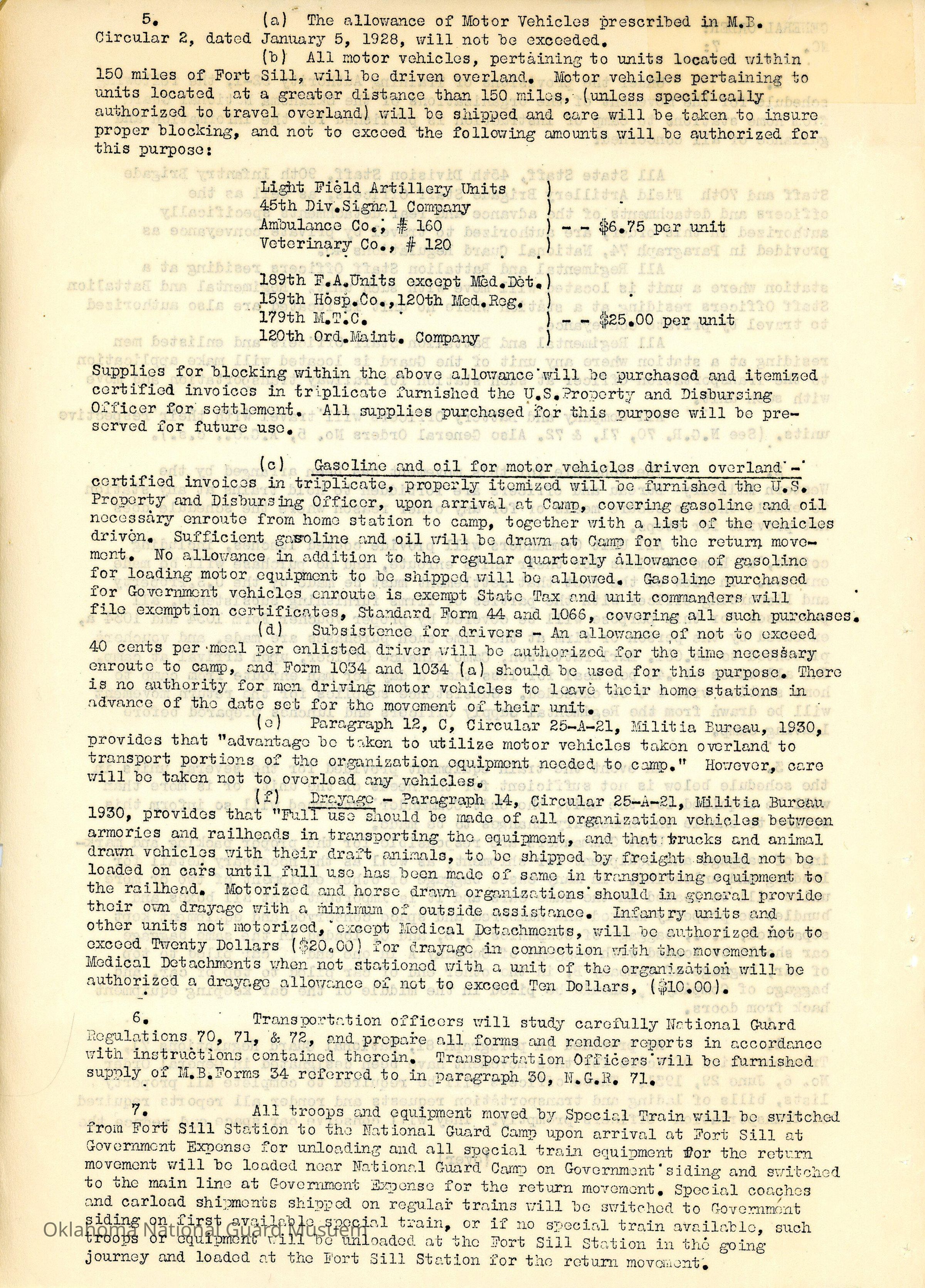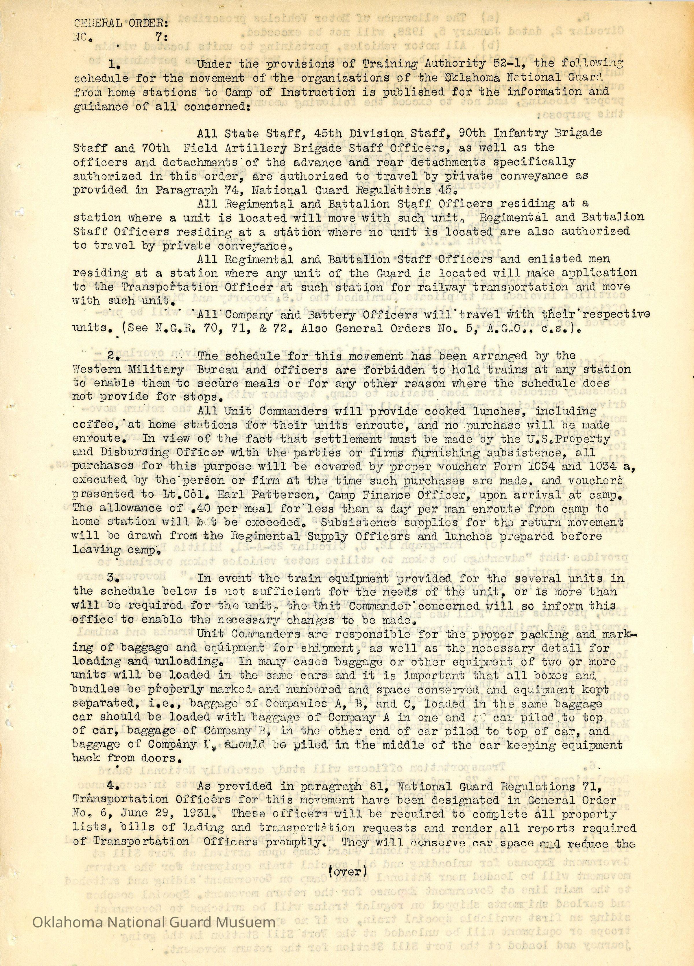 General Order #7 from Headquarters Adjutant General's Office in Oklahoma City. The order details the schedule of transportation from home stations to Fort Sill for the Camp of Instruction.Date(s) of Creation