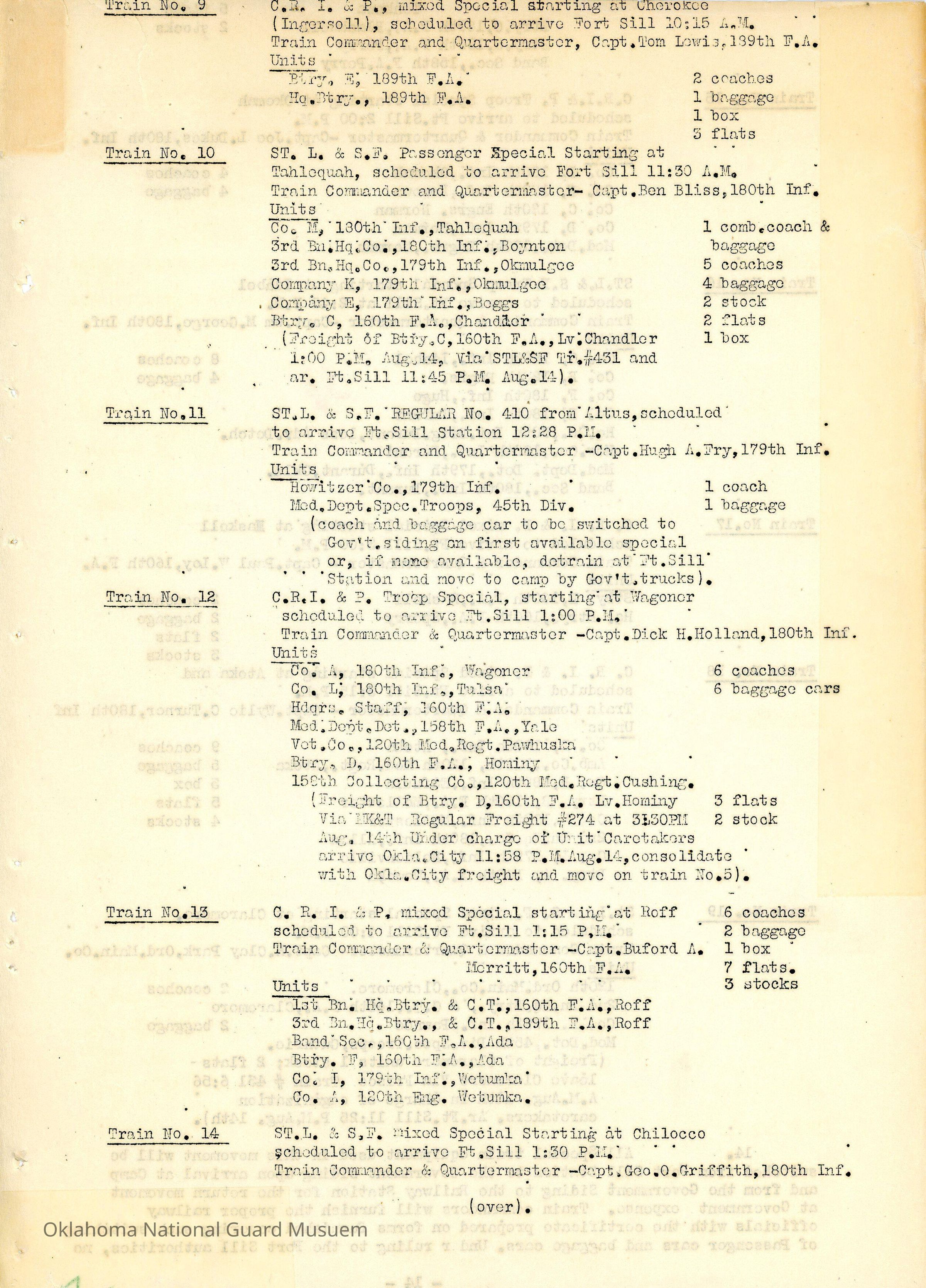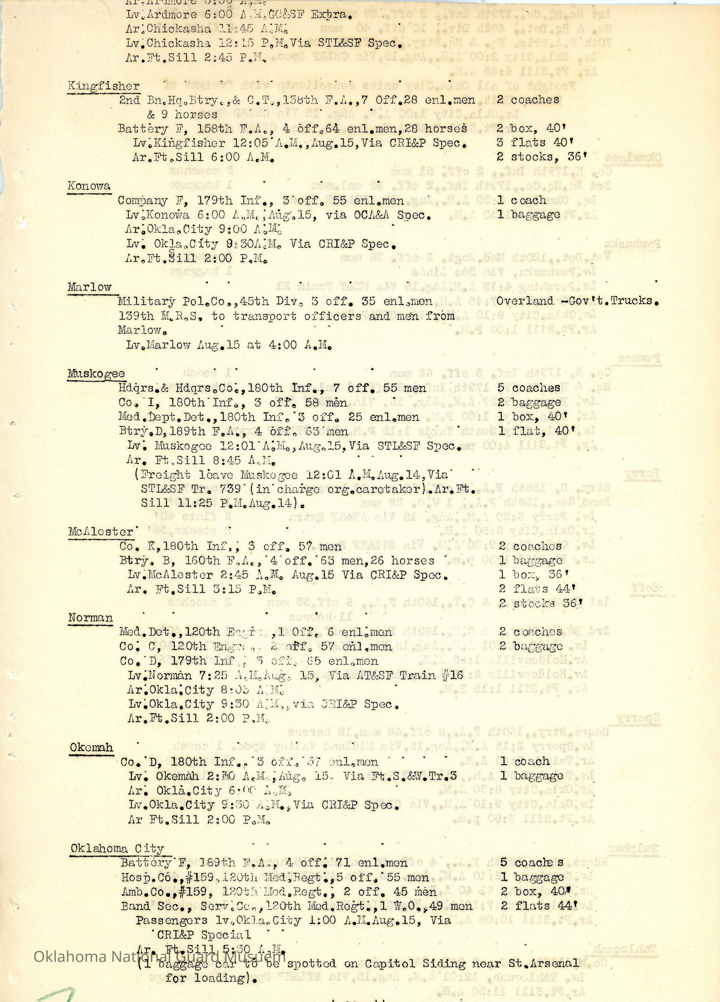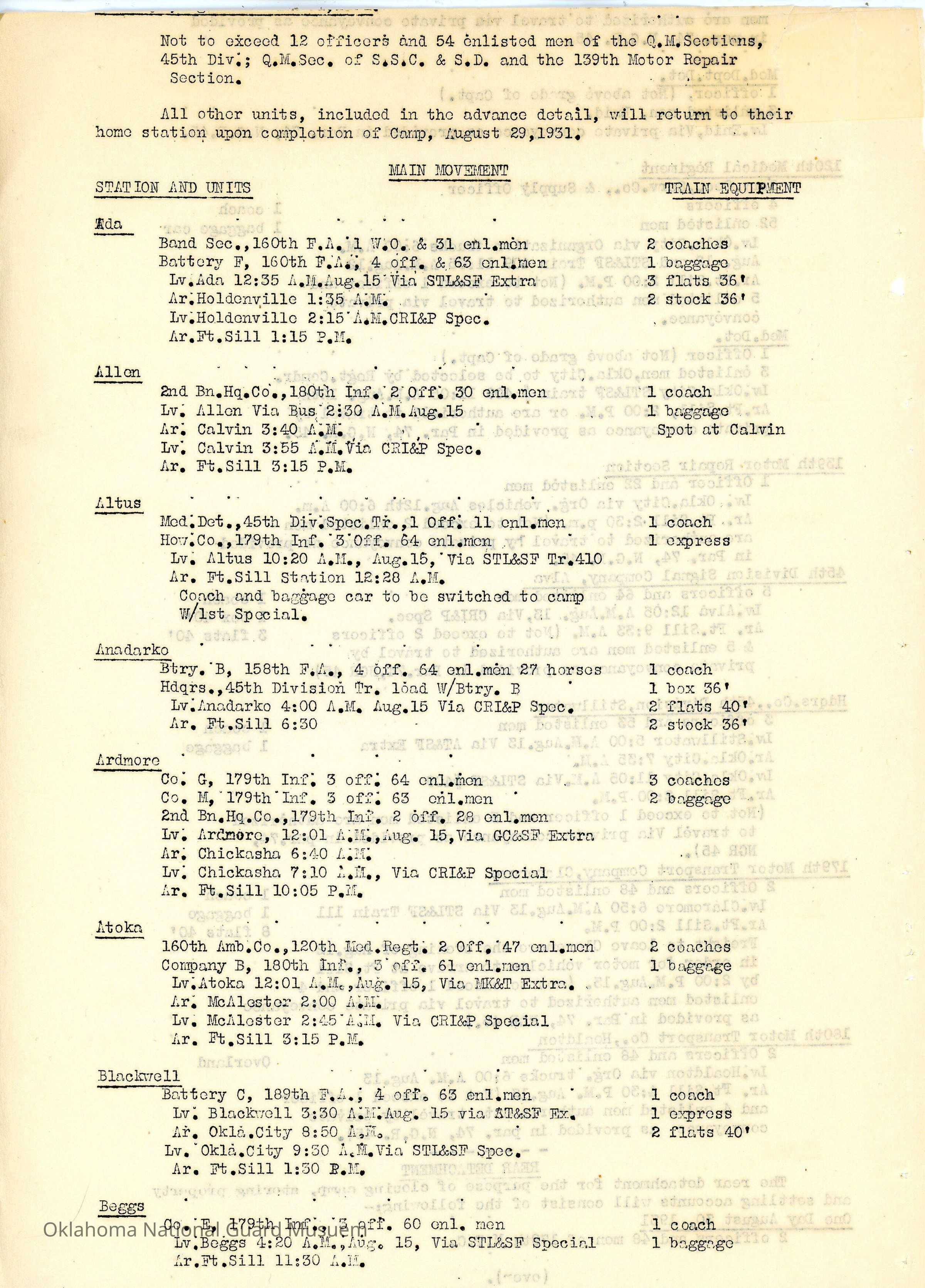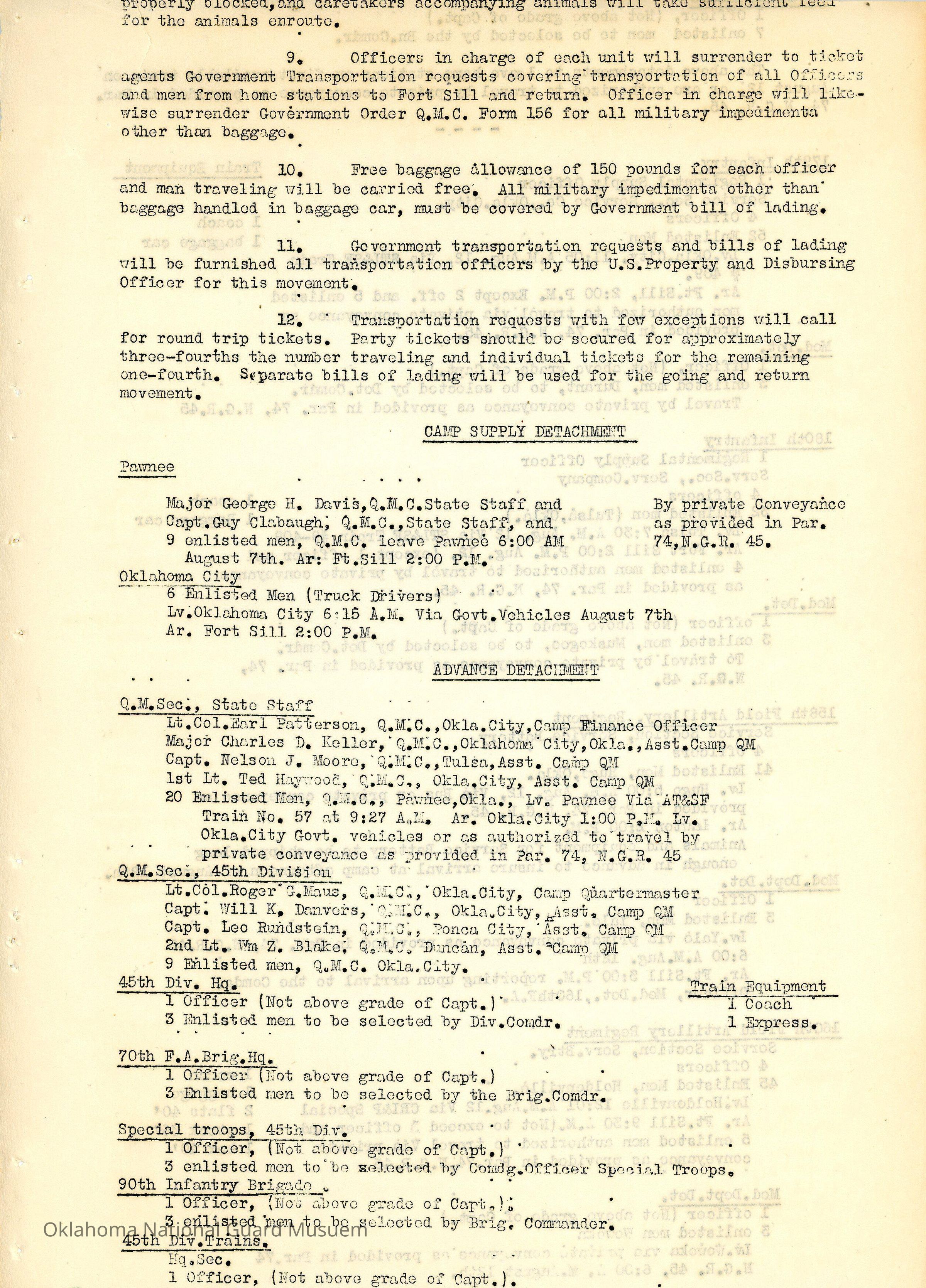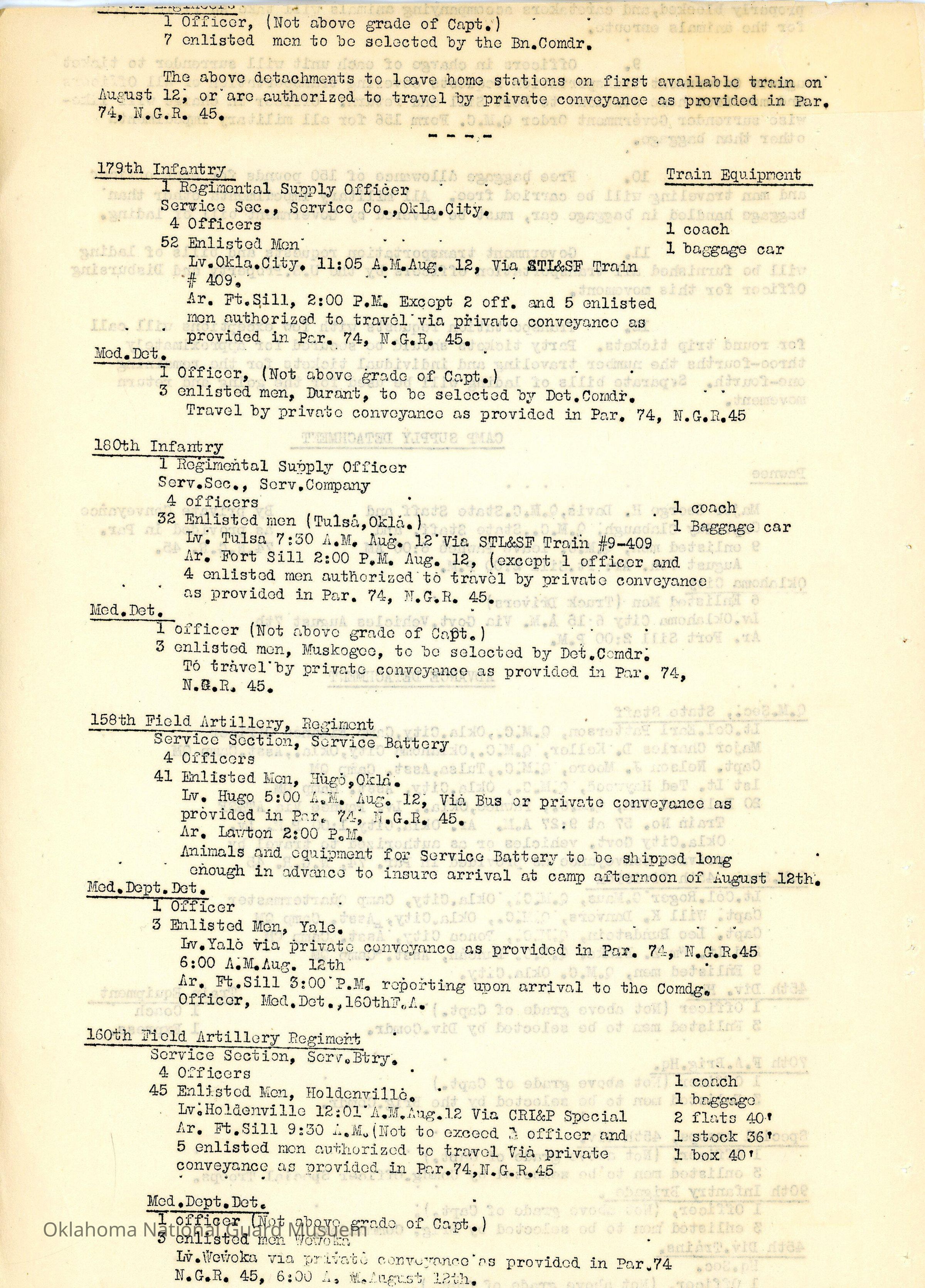 Adjutant General, Oklahoma City, Charles F. Barrett, William H. Murray, Fort Sill, Camp of Instruction, Transportation, Train, Equipment, 45th Division Signal Corps, 160th Ambulance Company, 120th Veterinary Company, 120th Medical Regiment, 189th Field Artillery, Camp Supply Detachment, Pawnee, George H. Davis, Guy Clabaugh, Trucks, Advance Detachments, Special Troops, 90th Infantry Brigade, 45th Division Trains, 70th Field Artillery Brigade, 179th Infantry, 180th Infantry, 158th Field Artillery Regiment, Hugo, Tulsa, Lawton, 160th Field Artillery, Holdenville, 189th Field Artillery, Minco, 120th Engineers, Norman, Earl Patterson, Ted Haywood, Charles D. Keller, F.M. Wood, Leo Rundstein, Ponca City, Alva, Stillwater, Claremore, Healdton, Rear Detachment, Ada, Altus, Anadarko, Antlers, Chickasha, Ardmore, Atoka, McAlester, Blackwell, Beggs, Boynton, Chandler, Cherokee, Chilocco, Clinton, Durant, Edmond, Enid, Eufaula, Frederick, Haskell, Hobart, Hominy, Madill, Idabel, Kingfisher, Konowa, Marlow, Muskogee, Norman, Okemah, Okmulgee, Pawhuska, Perry, Roff, Sperry, Stigler, Stillwater, Sulphur, Tahlequah, Tishomingo, Tonkawa, Wagoner, Watonga, Weatherford, Wetumka, Wewoka, Yale, Paul B. Bell, Will. K. Danvers, Eugene F. Bell, Ralph L. Rumley, W.Z. Blake, Kelsie E. Miller, Roy H. Cox, Benjamin Bliss, W.W. Bowman, Buford A. Merritt, George D. Hann, Dick H. Holland, Joe L. Dukes, Ab Jolly, William M. George, Paul W. Loy, Roger S. Denman, H. Clay Park, Wylie C. Turner, Roger G. Maus, Allen, Calvin, Guthrie, Clarence R. Steele, Albert R. Harris, Tom Lewis, George Griffith