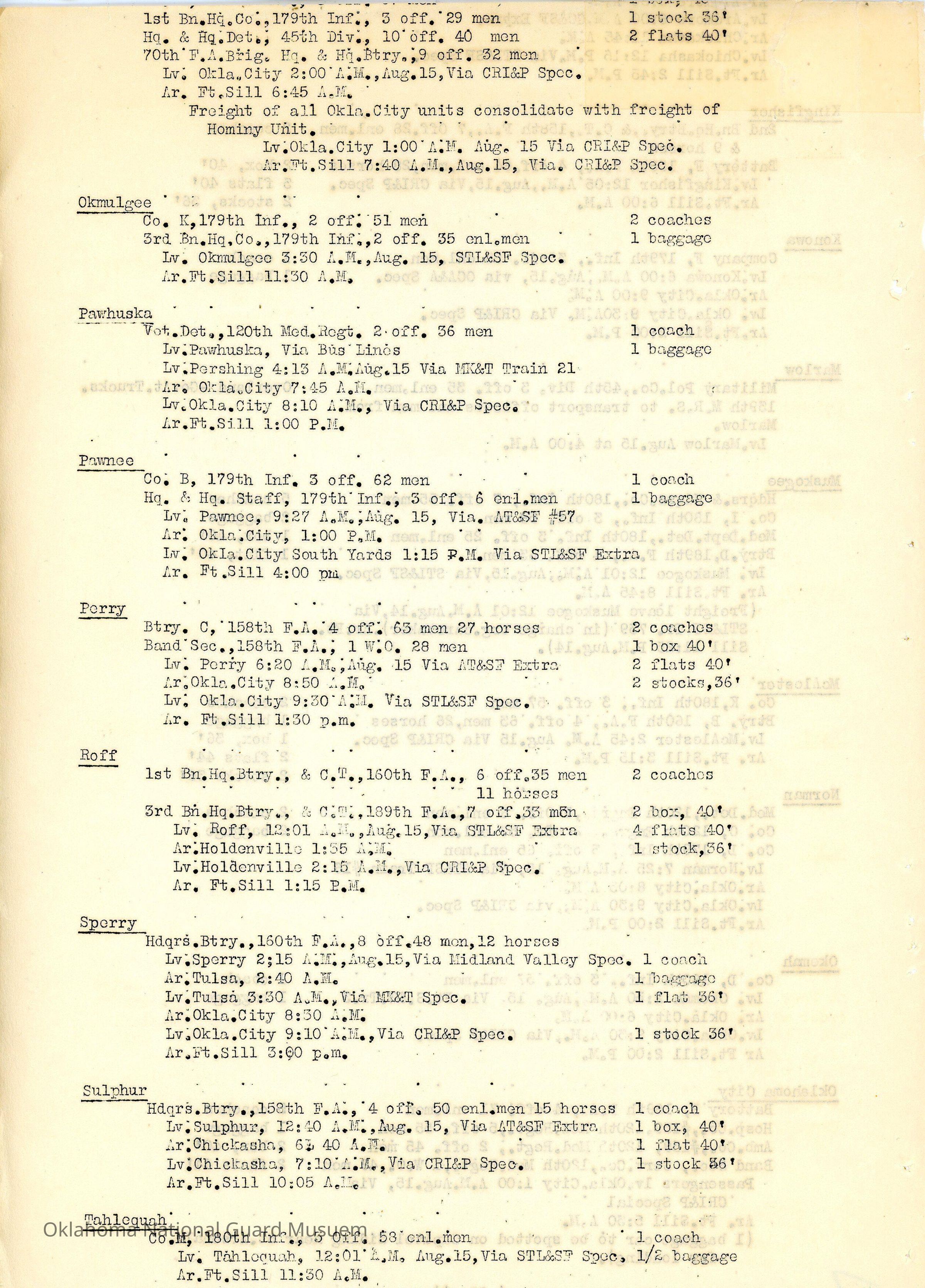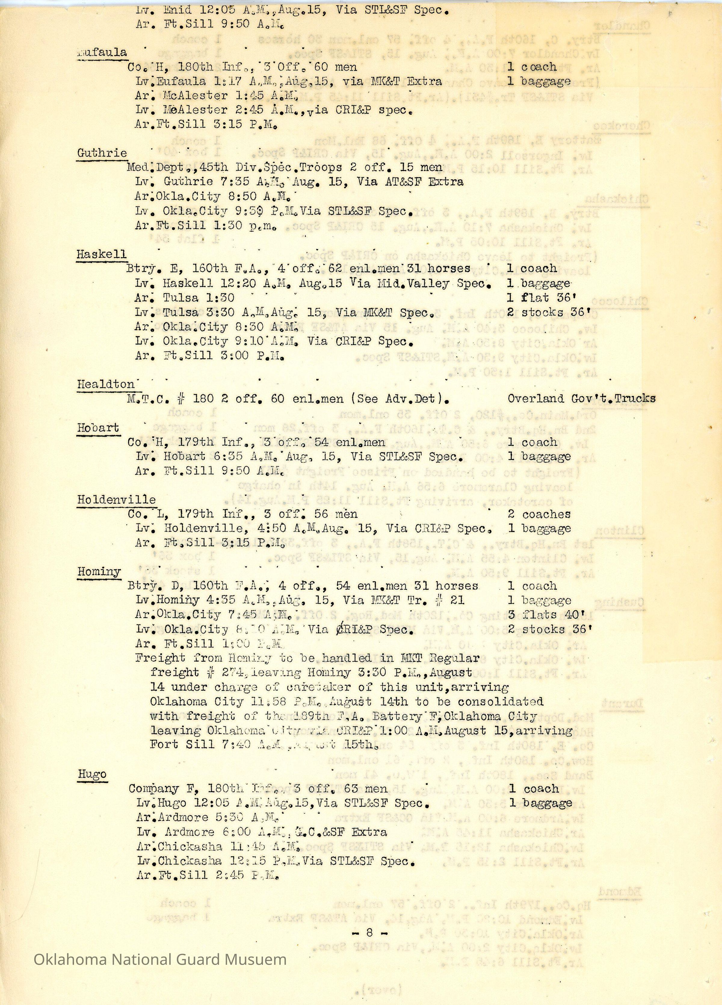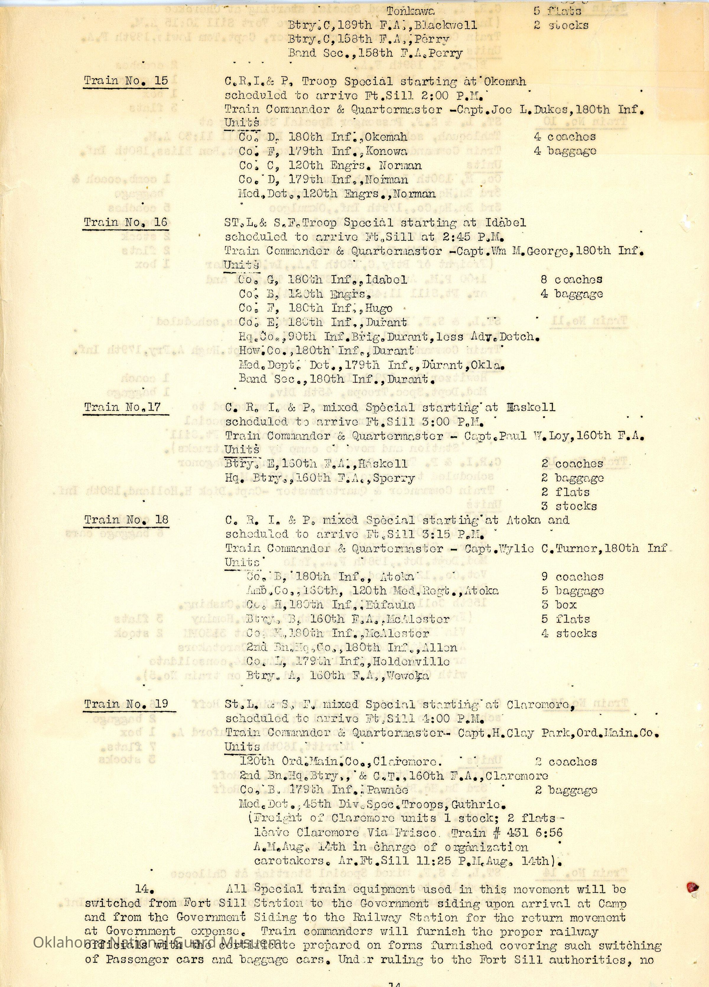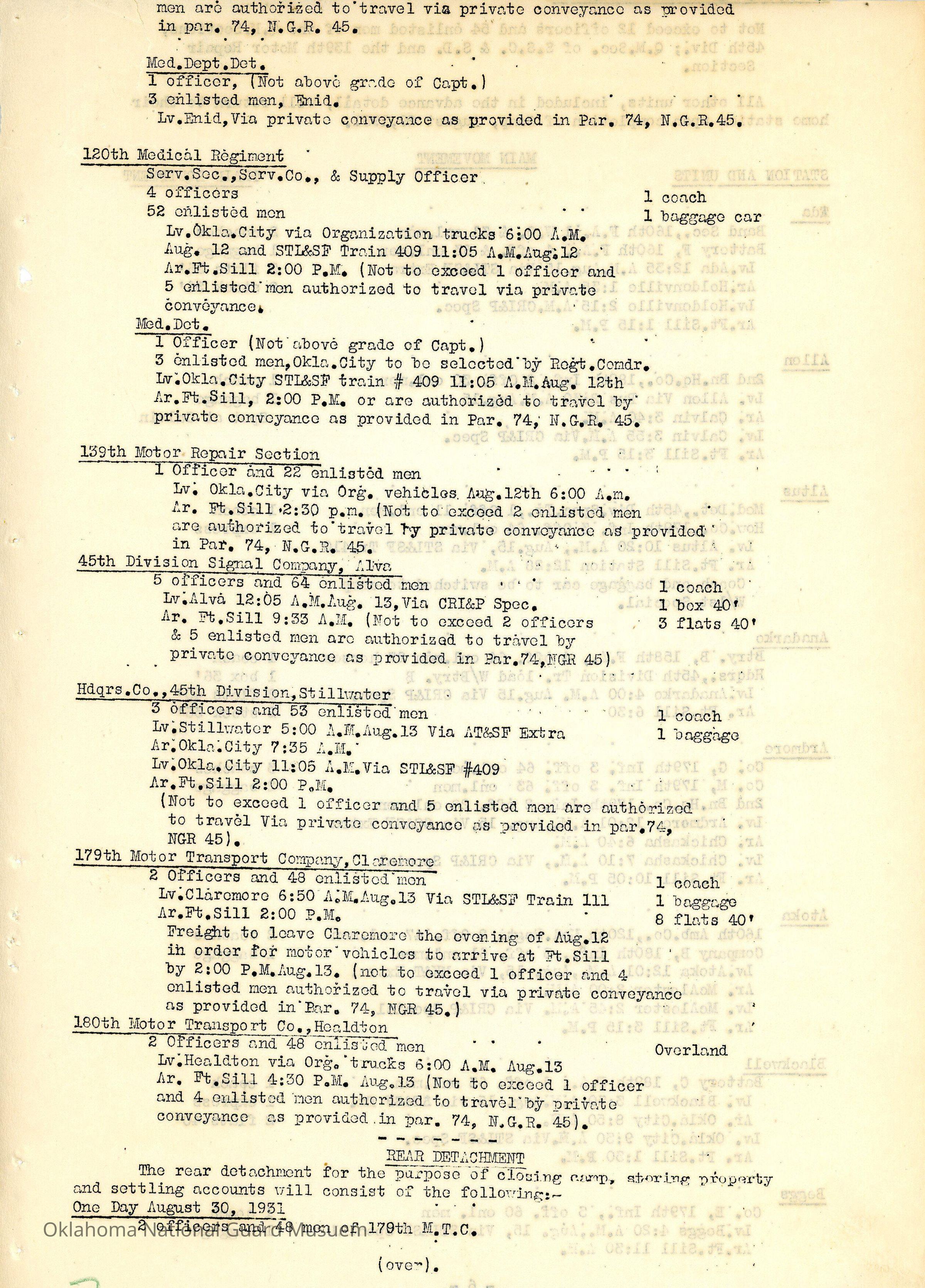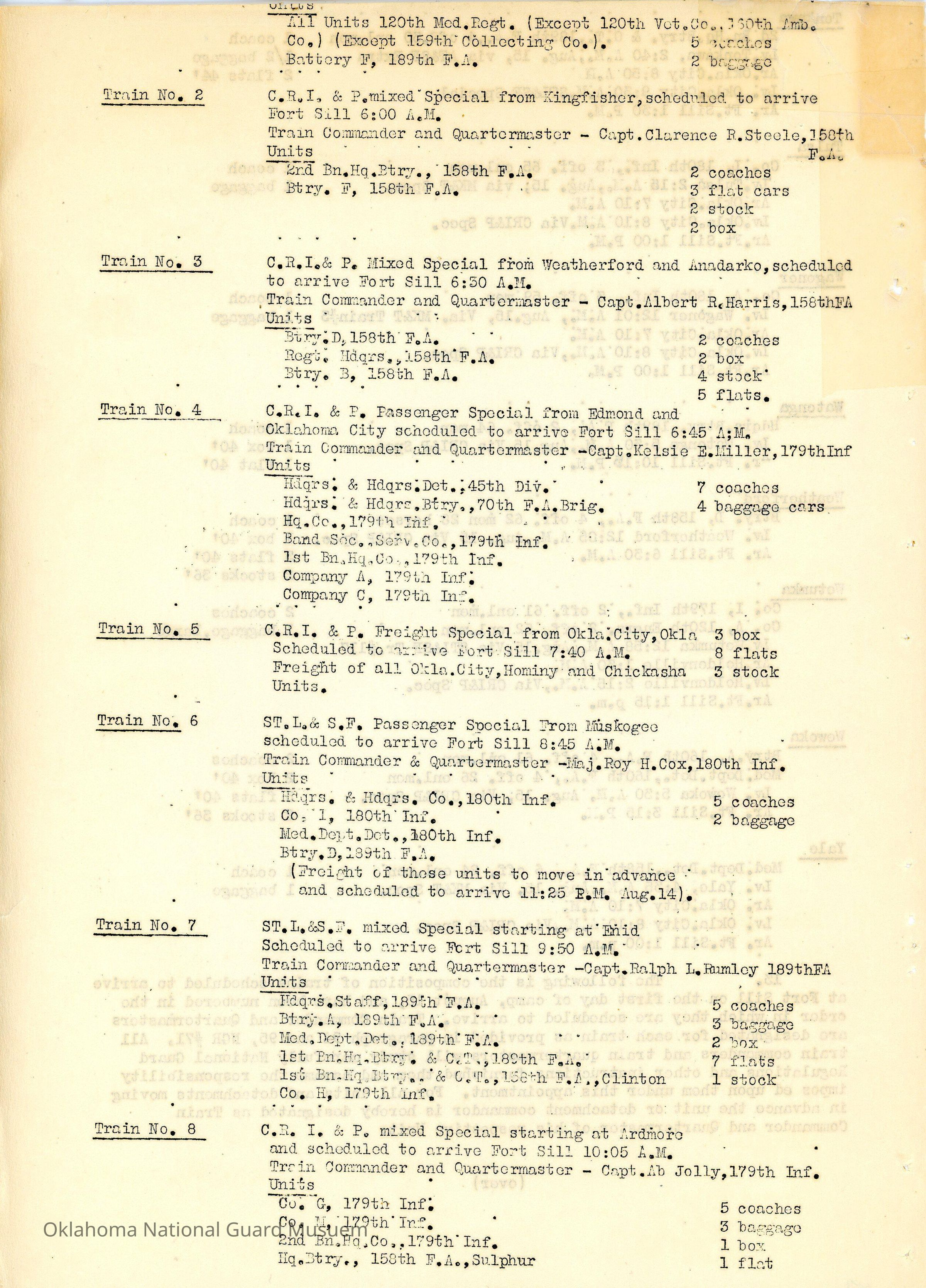 Adjutant General, Oklahoma City, Charles F. Barrett, William H. Murray, Fort Sill, Camp of Instruction, Transportation, Train, Equipment, 45th Division Signal Corps, 160th Ambulance Company, 120th Veterinary Company, 120th Medical Regiment, 189th Field Artillery, Camp Supply Detachment, Pawnee, George H. Davis, Guy Clabaugh, Trucks, Advance Detachments, Special Troops, 90th Infantry Brigade, 45th Division Trains, 70th Field Artillery Brigade, 179th Infantry, 180th Infantry, 158th Field Artillery Regiment, Hugo, Tulsa, Lawton, 160th Field Artillery, Holdenville, 189th Field Artillery, Minco, 120th Engineers, Norman, Earl Patterson, Ted Haywood, Charles D. Keller, F.M. Wood, Leo Rundstein, Ponca City, Alva, Stillwater, Claremore, Healdton, Rear Detachment, Ada, Altus, Anadarko, Antlers, Chickasha, Ardmore, Atoka, McAlester, Blackwell, Beggs, Boynton, Chandler, Cherokee, Chilocco, Clinton, Durant, Edmond, Enid, Eufaula, Frederick, Haskell, Hobart, Hominy, Madill, Idabel, Kingfisher, Konowa, Marlow, Muskogee, Norman, Okemah, Okmulgee, Pawhuska, Perry, Roff, Sperry, Stigler, Stillwater, Sulphur, Tahlequah, Tishomingo, Tonkawa, Wagoner, Watonga, Weatherford, Wetumka, Wewoka, Yale, Paul B. Bell, Will. K. Danvers, Eugene F. Bell, Ralph L. Rumley, W.Z. Blake, Kelsie E. Miller, Roy H. Cox, Benjamin Bliss, W.W. Bowman, Buford A. Merritt, George D. Hann, Dick H. Holland, Joe L. Dukes, Ab Jolly, William M. George, Paul W. Loy, Roger S. Denman, H. Clay Park, Wylie C. Turner, Roger G. Maus, Allen, Calvin, Guthrie, Clarence R. Steele, Albert R. Harris, Tom Lewis, George Griffith