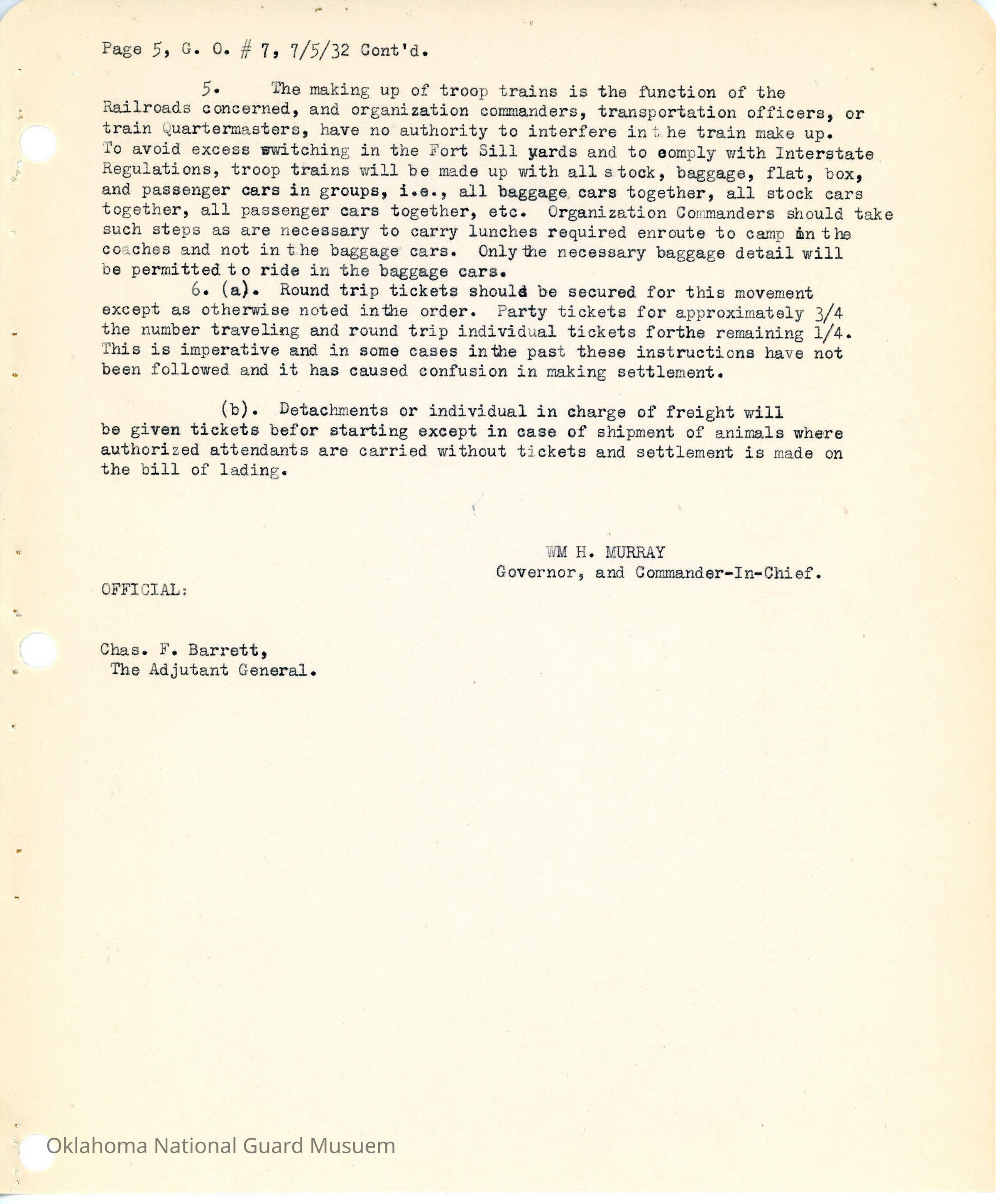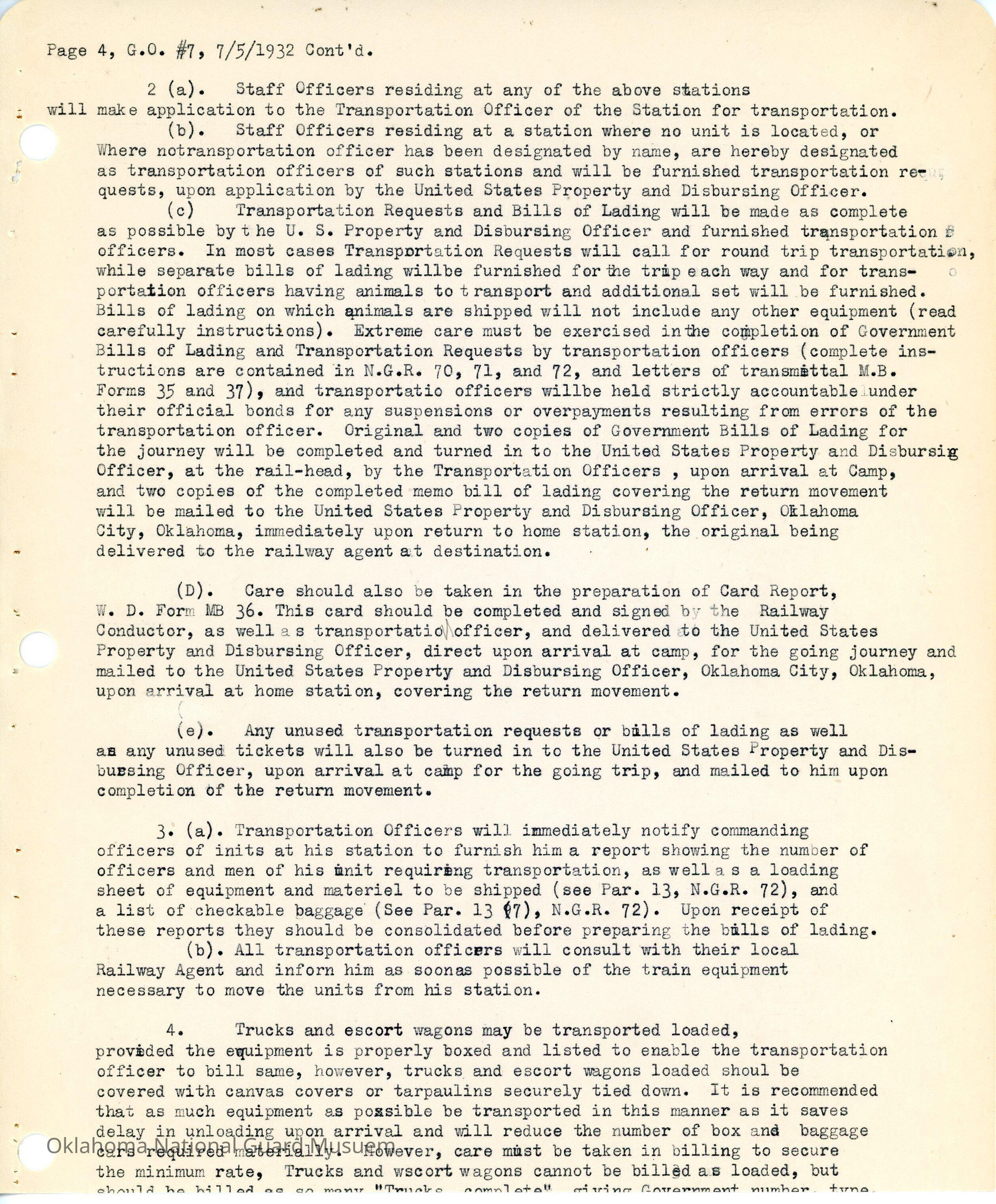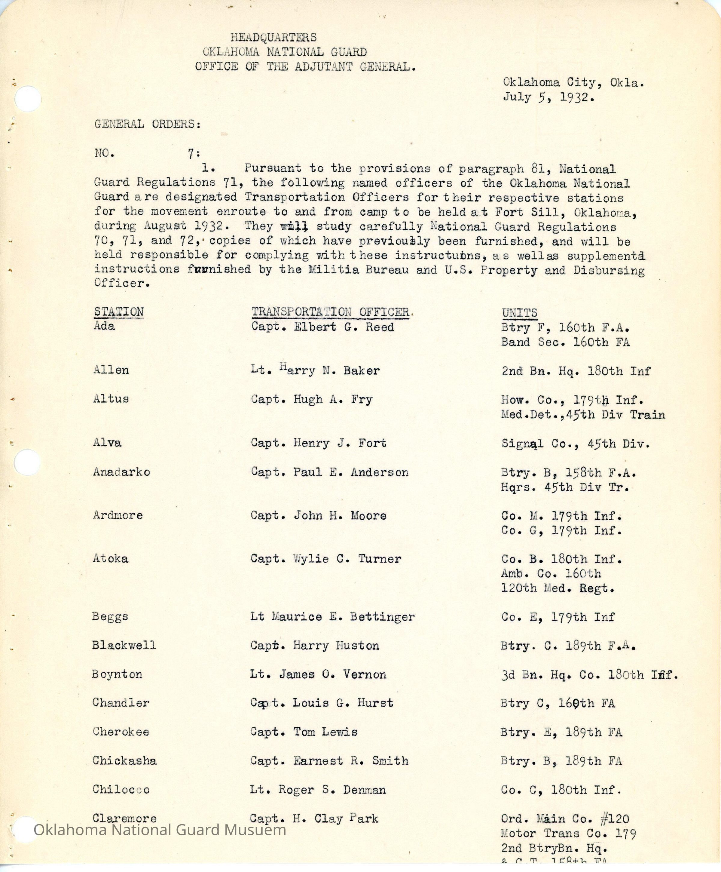 General Order #7 from Headquarters Adjutant General's Office in Oklahoma City. The order designates transportation officers and their respective units and stationsDate(s) of Creation