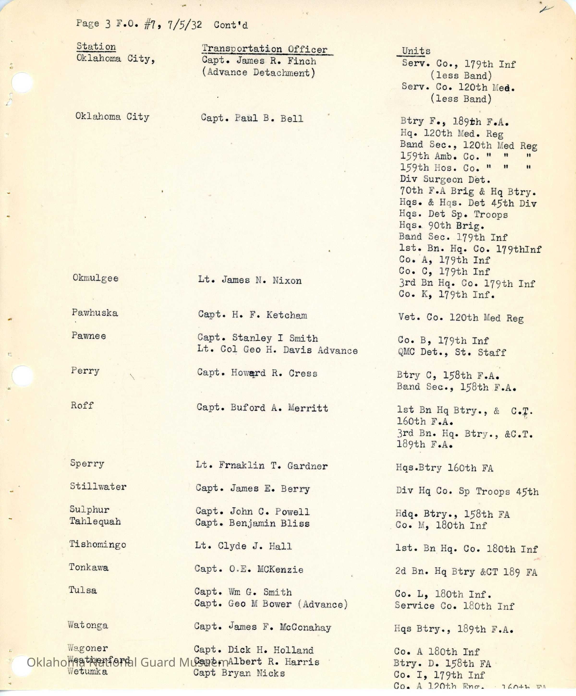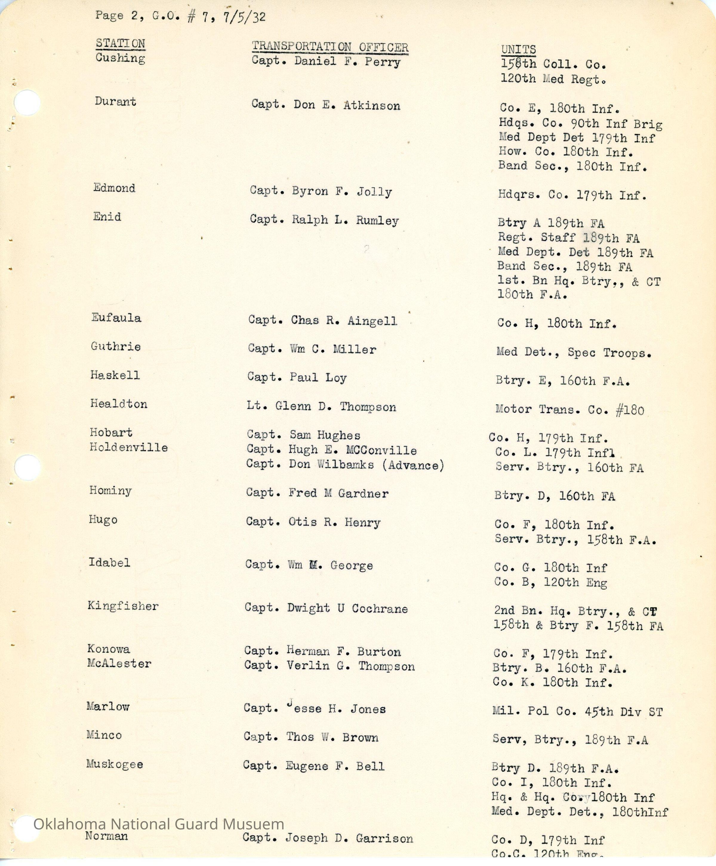 Adjutant General, Oklahoma City, Charles F. Barrett, Transportation officers, William H. Murray, Ada, Elbert G. Reed, 160th Field Artillery, Allen, Harry N. Baker, 180th Infantry, Alva, Henry J. Fort, 45th Signal Company, Anadarko, Paul E. Anderson, 158th Field Artillery, Ardmore, John H. Moore, Atoka, Wylie C. Turner, 120th Medical Regiment, 160th Ambulance Company, Beggs, Maurice E. Bettinger, Blackwell, Harry Huston, 189th Field Artillery, Boynton, James O. Vernon, Chandler, Louis G. Hurst, 160th Field Artillery, Cherokee, Tom Lewis, Chickasha, Earnest R. Smith, Chilocco, Roger S. Denman, Claremore, H. Clay Park, Cushing, Daniel F. Perry, Durant, Don E. Atkinson, 90th Infantry Brigade, Edmond, Byron F. Jolly, Enid, Ralph L. Rumley, Eufaula, Charles A. Aingell, Guthrie, William C. Miller, Special Troops, Haskell, Paul Loy, Healdton, Glenn D. Thompson, Hobart, Sam Hughes, Holdenville, Hugh E. McConville, Don Wilbanks, Hominy, Fred M. Gardner, Hugo, Otis R. Henry, Idabel, William M. George, 120th Engineers, Kingfisher, Dwight U. Cochrane, Konawa, Herman F. Burton, McAlester, Verlin G. Thompson, Marlow, Jesse H. Jones, Minco, Thomas W. Brown, Muskogee, Eugene F. Bell, Norman, Joseph D. Garrison, James R. Finch, Paul B. Bell, Okmulgee, James N. Nixon, 70th Field Artillery Brigade, Pawhuska, H.F. Ketcham, Pawnee, Stanley I. Smith, George H. Davis, Perry, Howard R. Cress, Roff, Buford A. Merritt, Sperry, Franklin T. Gardner, Stillwater, James E. Berry, Sulphur, John C. Powell, Tahlequah, Benjamin Bliss, Tishomingo, Clyde J. Hall, Tonkawa, O.E. McKenzie, Tulsa, William G. Smith, George M. Bower, Watonga, James F. McConahay, Wagoner, Dick H. Holland, Weatherford, Albert R. Harris, Wetumka, Byron Nicks