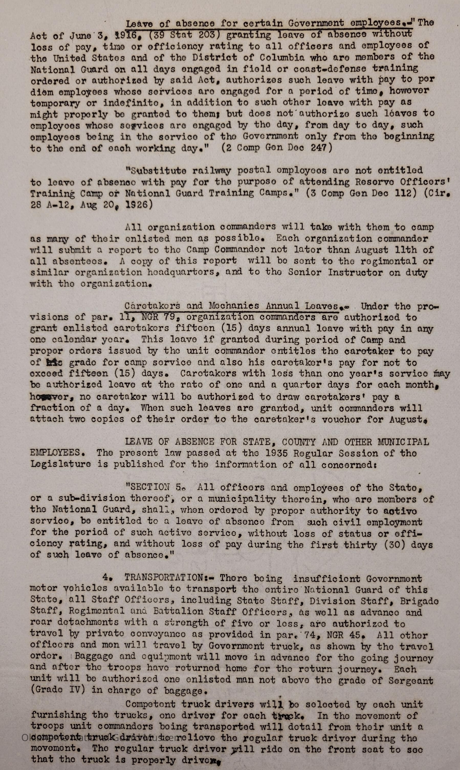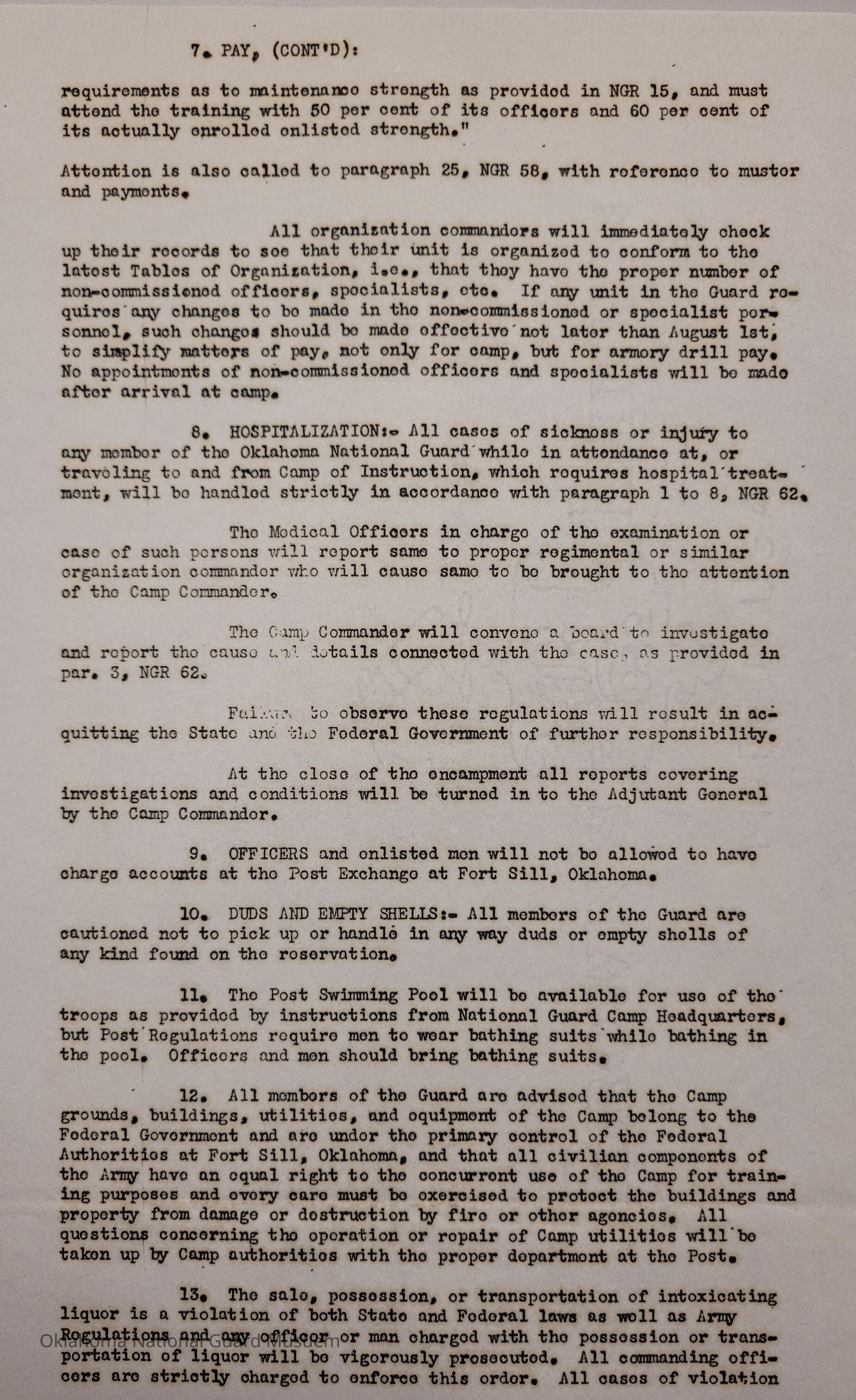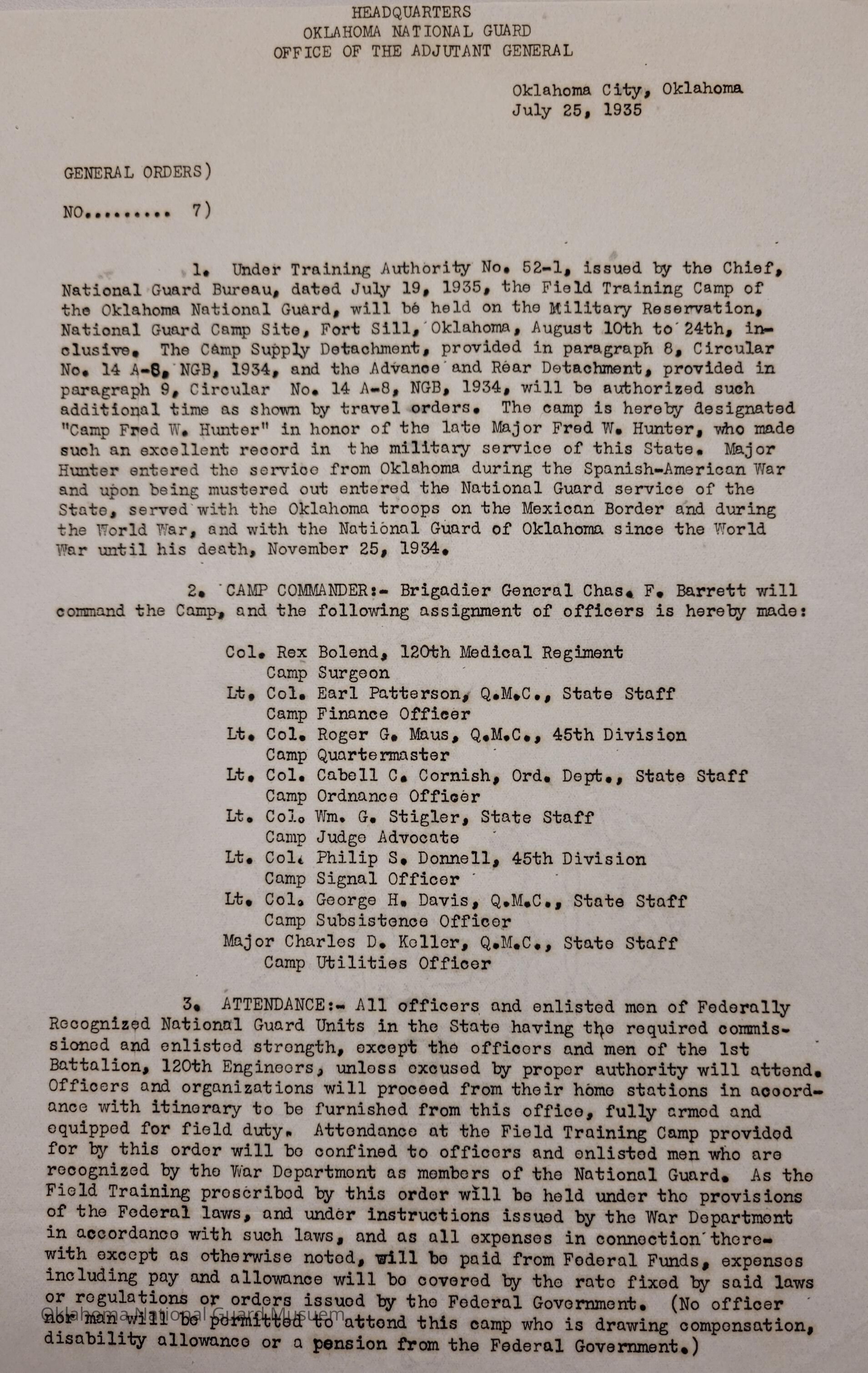 General Order #7 from Headquarters Adjutant General's Office in Oklahoma City. The order details the equipment, attendance, transportation, and pay for the Annual Camp of Instruction at Camp Fred W. HunterDate(s) of Creation