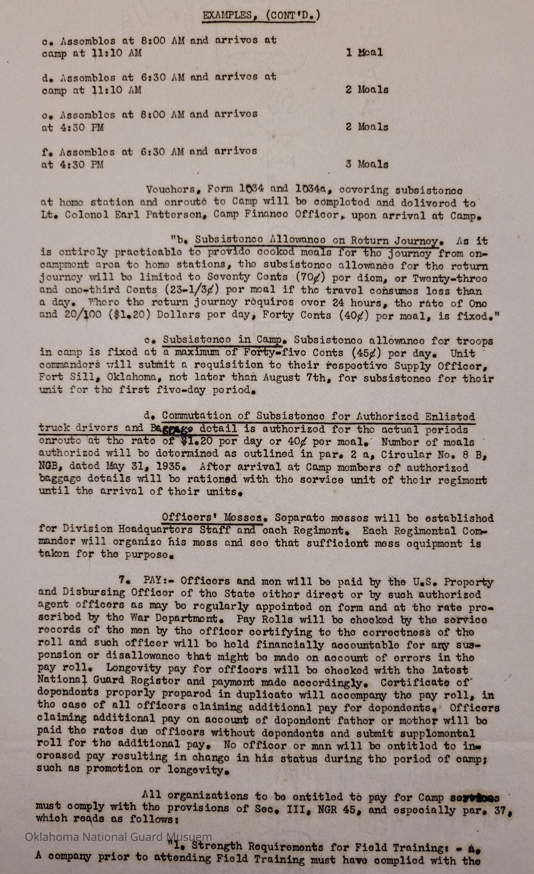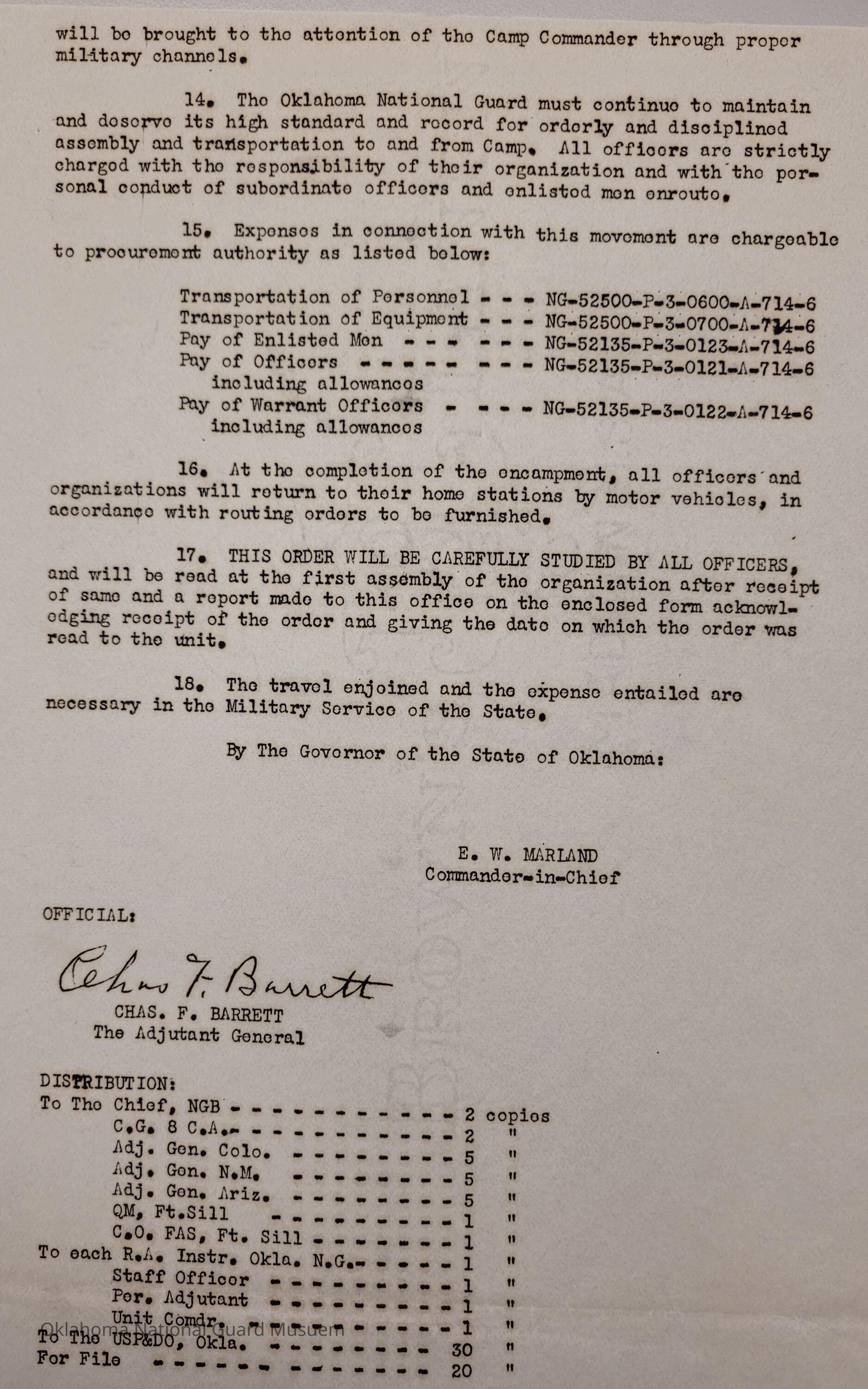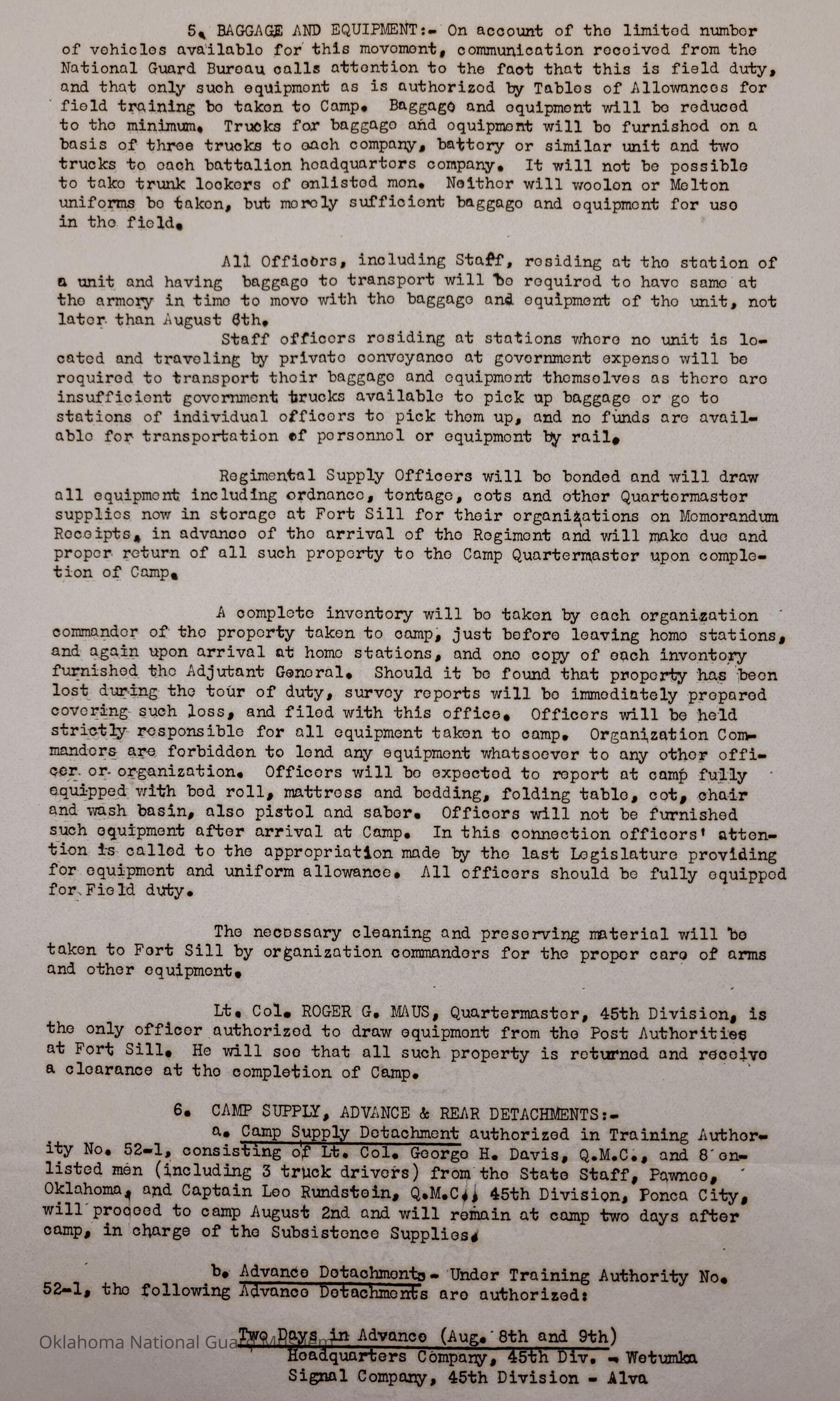 Adjutant General, Oklahoma City, Charles F. Barrett, 45th Division, Camp of Instruction, Fort Sill, Attendance, Pay, Transportation, E.W. Marland, Roger G. Maus, Camp Fred W. Hunter, Fred W. Hunter, 120th Medical Regiment, Earl Patterson, Cabell C. Cornish, William G. Stigler, Phillip C. Donnell, 45th Signal Officer, George H. Davis, Charles D. Keller, Rex Bolend, Subsistence