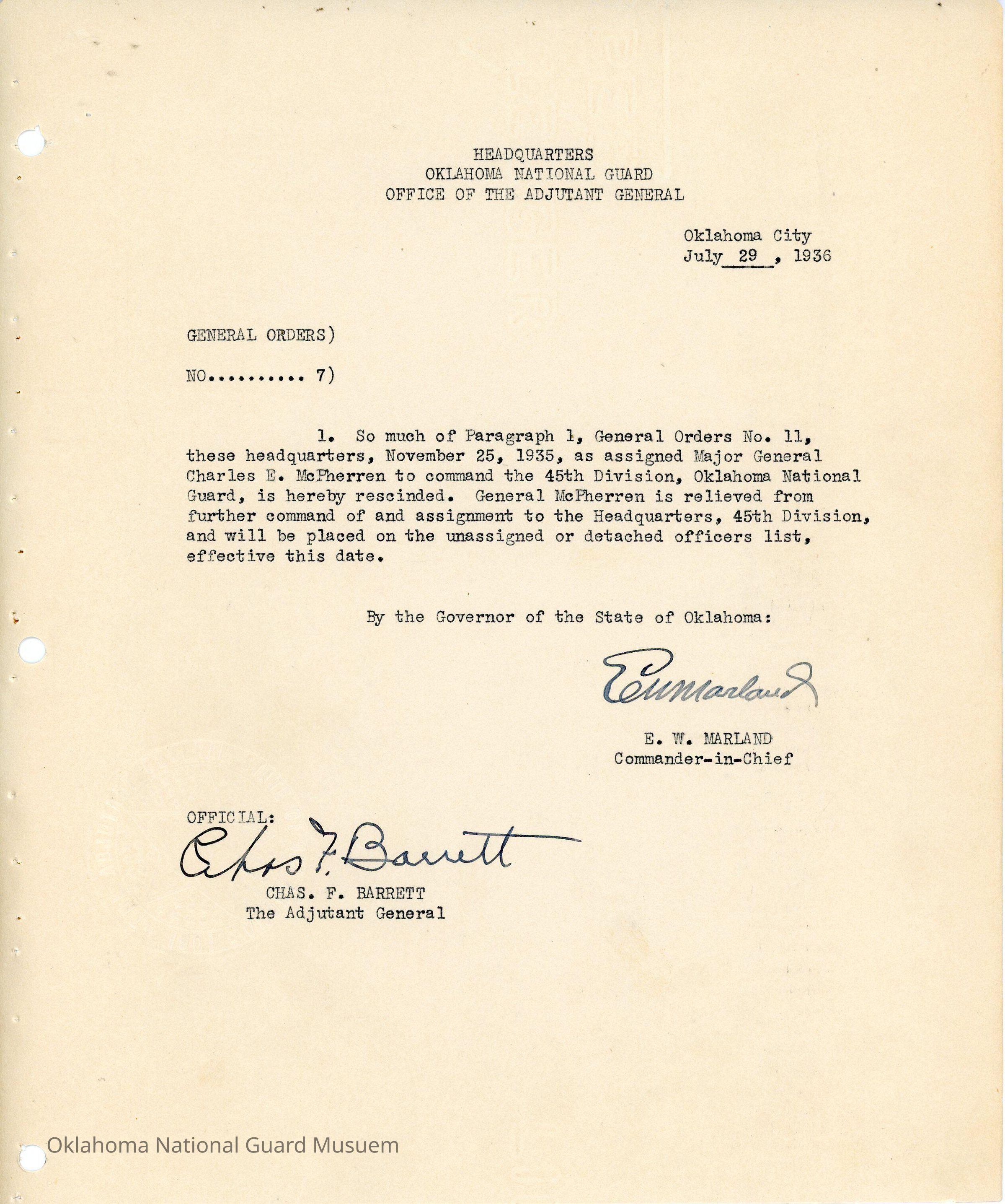 General Order #7 from Headquarters Adjutant General's Office in Oklahoma City. The order rescinds General Order #11 1935 and relieves Charles E. McPherren from command of the 45th DivisionDate(s) of Creation