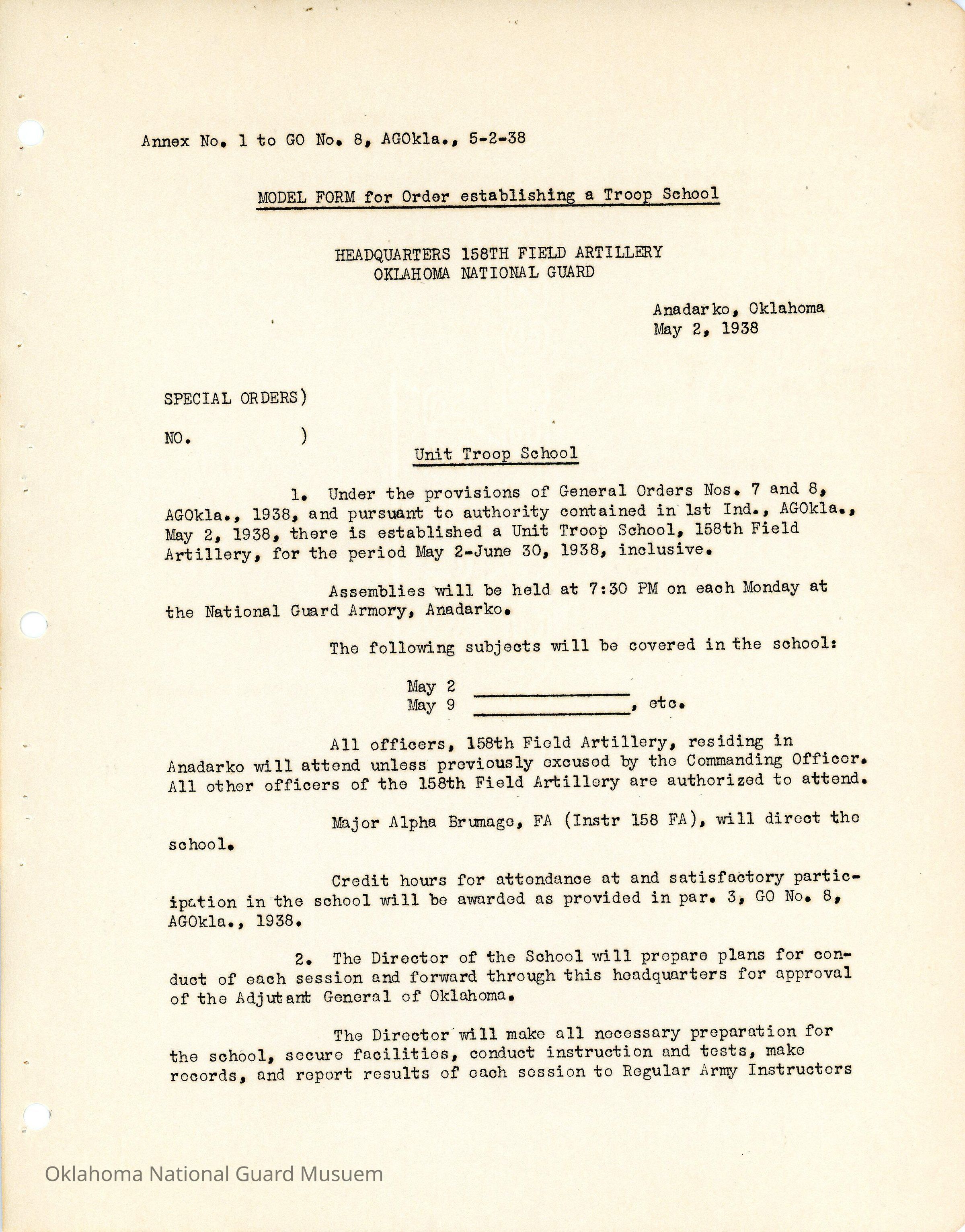 General Order #8 Annex 1 from Headquarters Adjutant General's Office in Oklahoma City. The order is a model form for an order establishing a Troop SchoolDate(s) of Creation