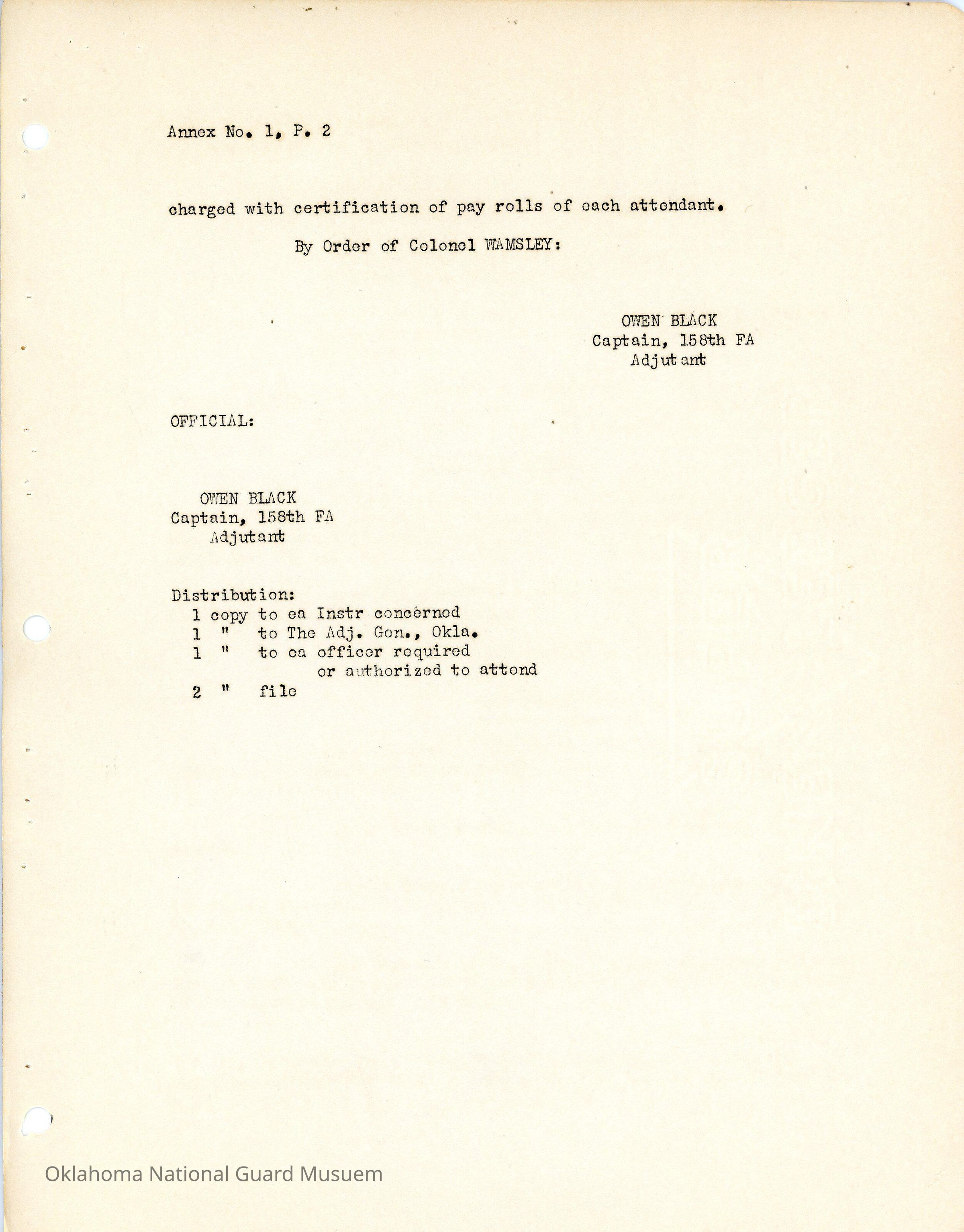 Adjutant General, Anadarko, 158th Field Artillery, Troop Schools, Model form, Owen Black