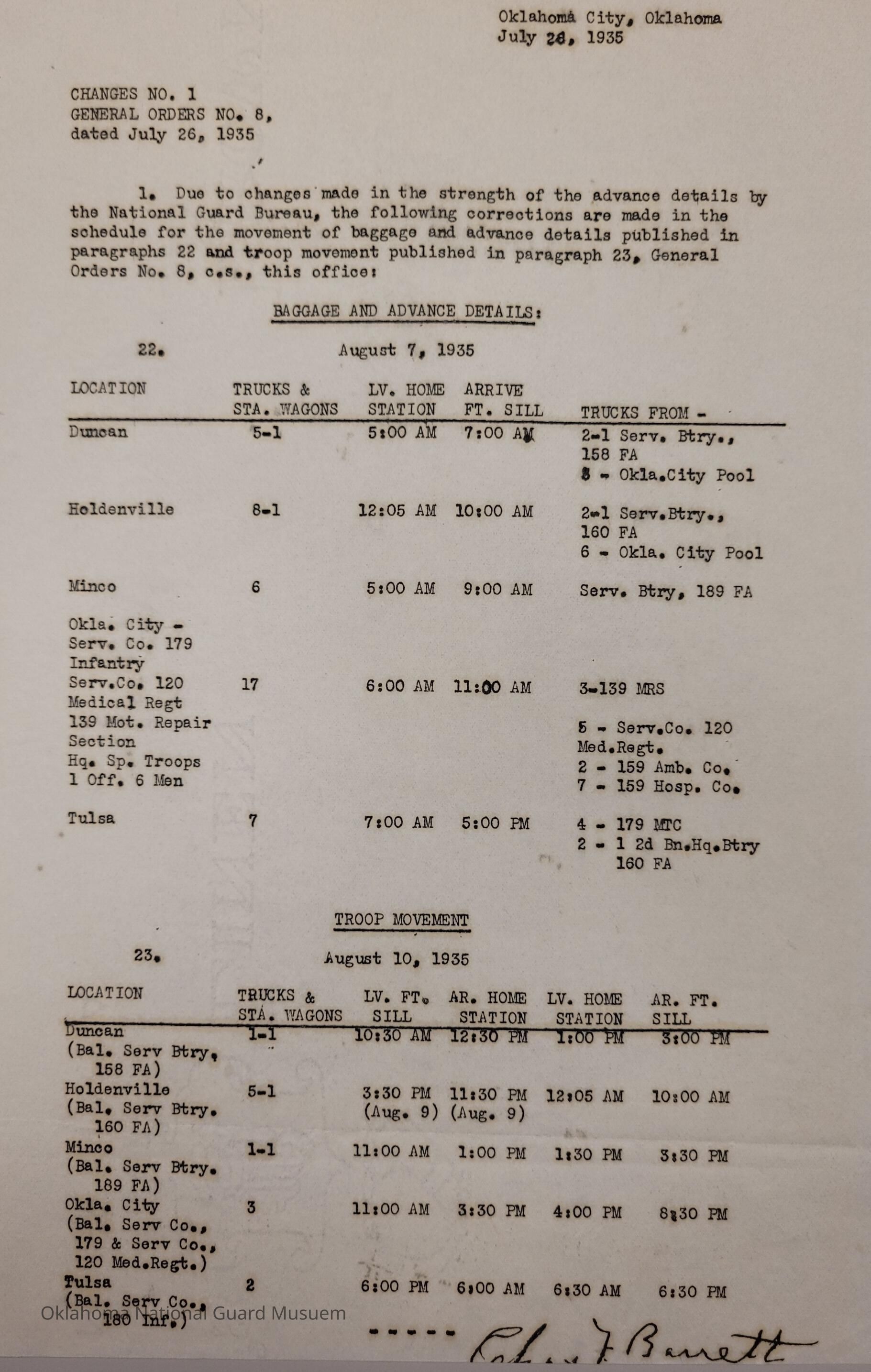 Adjutant General, Oklahoma City, Charles F. Barrett, Transportation, Fort Sill, Camp of Instruction, Baggage, National Guard Bureau, Corrections, Duncan, 158th Field Artillery, Holdenville, 160th Field Artillery, Minco, 189th Field Artillery, Movement, Tulsa, 120th Medical Regiment, 180th Infantry