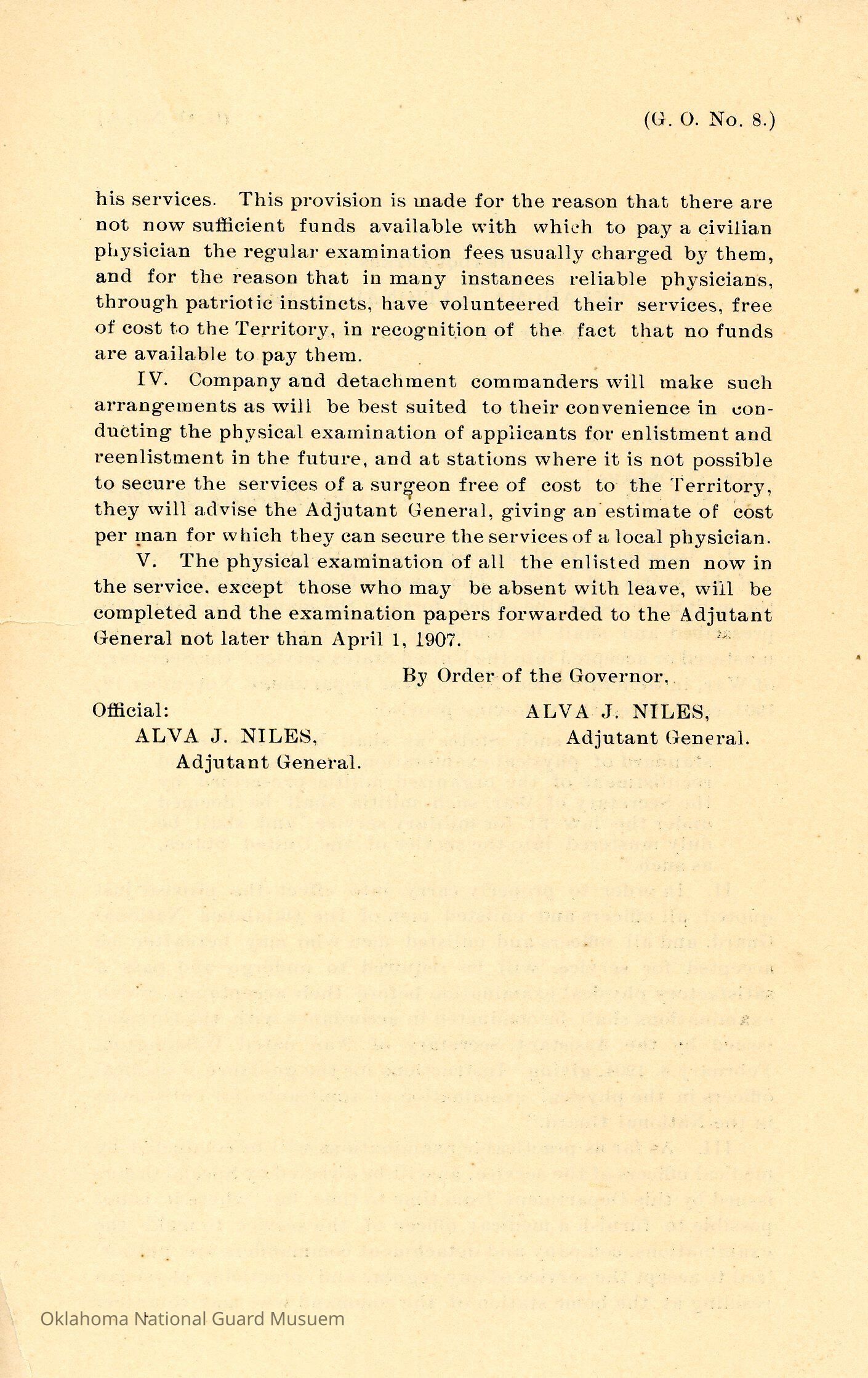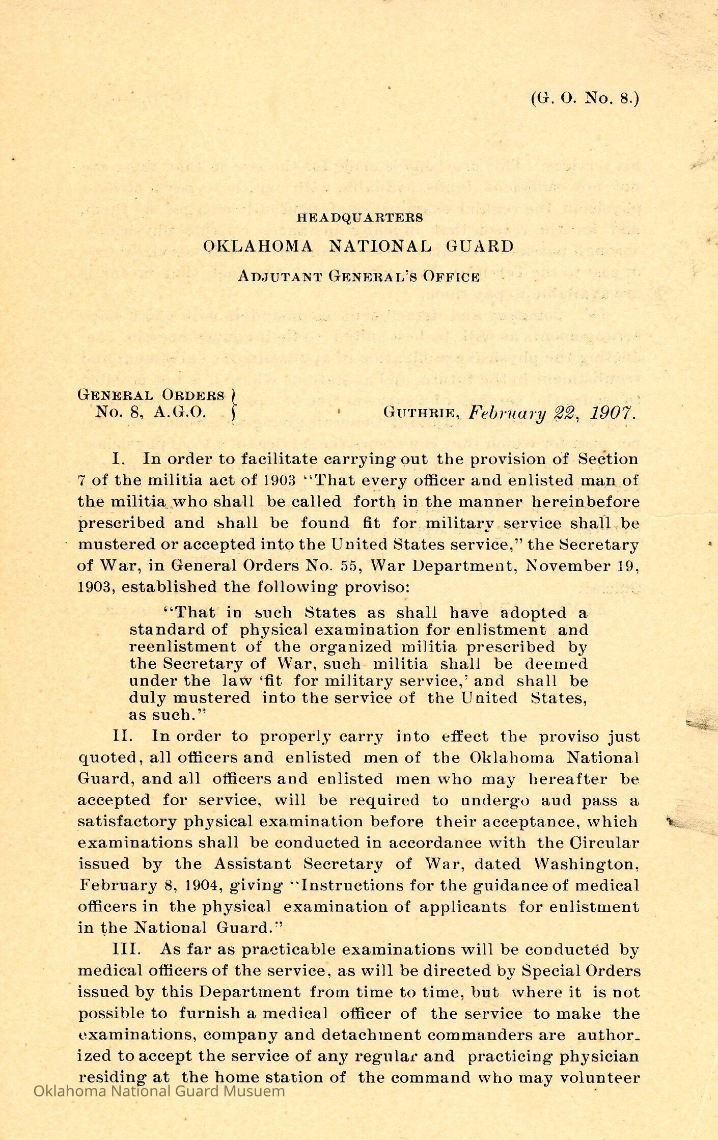 General Order #8 from Headquarters Adjutant General's Office in Guthrie. The order requires all officers and enlisted men of the Oklahoma National Guard to pass a physical examinationDate(s) of Creation