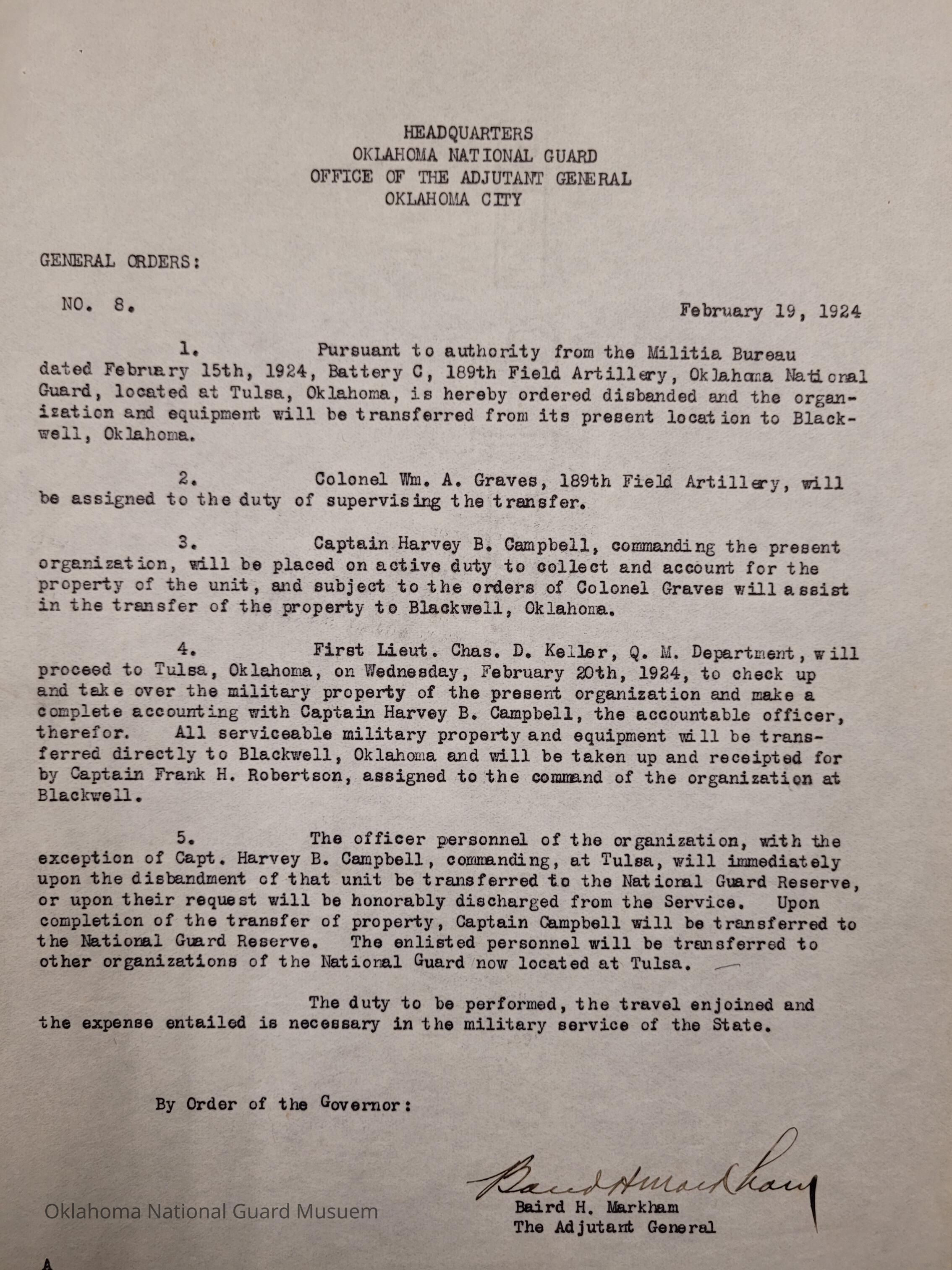 General Order #8 from Headquarters Adjutant General's Office in Oklahoma City. The order disbands Battery C 189th Field Artillery located in Tulsa. The organization and equipment moved to BlackwellDate(s) of Creation