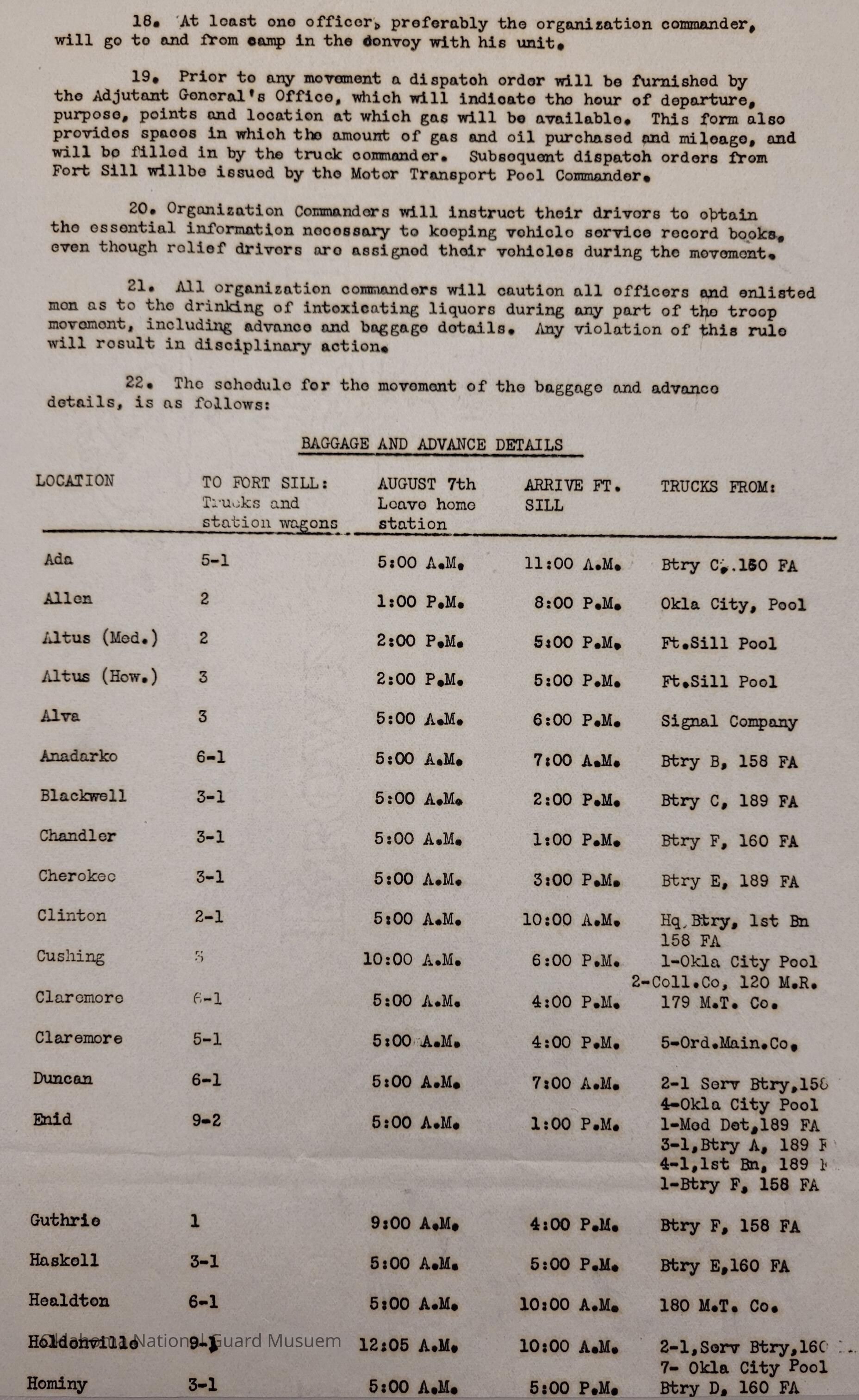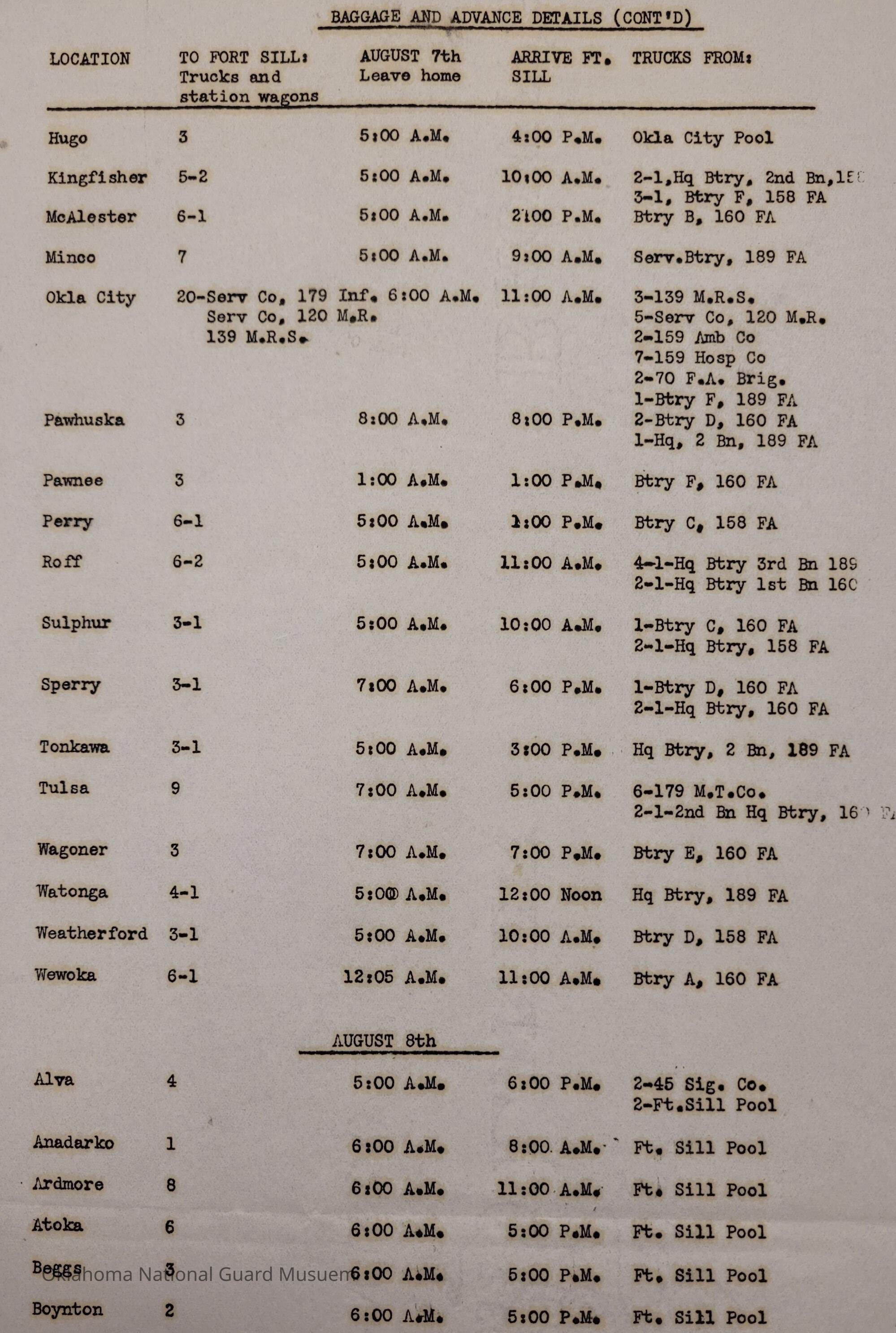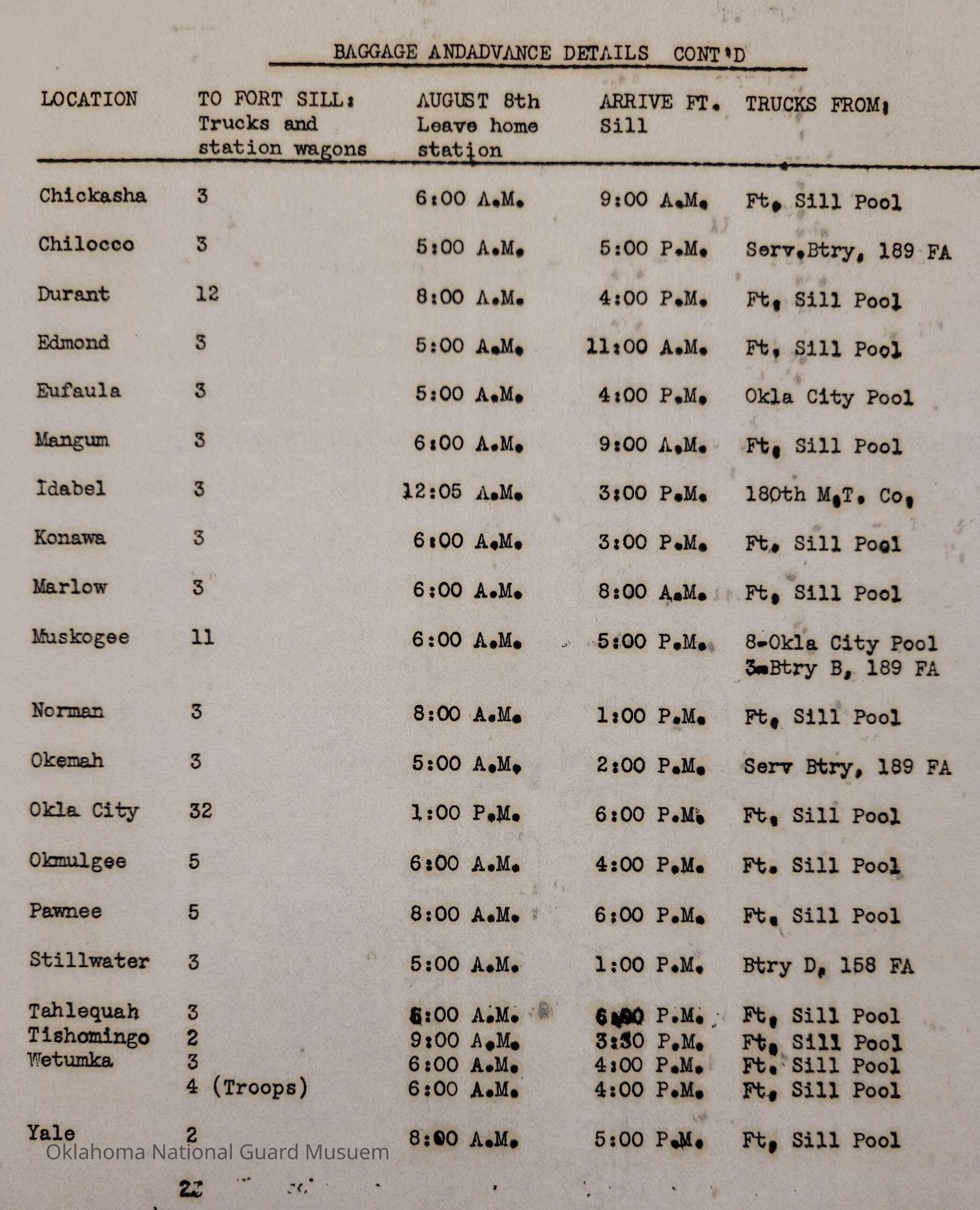 Adjutant General, Oklahoma City, Charles F. Barrett, Transportation, Fort Sill, Camp of Instruction, Rations, Trucks, Baggage, Ada, Allen, Altus, Alva, Anadarko, Blackwell, Chandler, Cherokee, Clinton, Cushing, Claremore, Duncan, Enid, Guthrie, Haskell, Healdton, Holdenville, Hominy, Hugo, Kingfisher, McAlester, Minco, Pawhuska, Pawnee, Perry, Roff, Sulphur, Sperry, Tonkawa, Tulsa, Wagoner, Watonga, Weatherford, Wewoka, Ardmore, Atoka, Beggs, Boynton, Chickasha, Chilocco, Edmond, Eufaula, Mangum, Idabel, Marlow, Muskogee, Norman, Okemah, Okmulgee, Stillwater, Tahlequah, Tishomingo, Wetumka, Yale, 160th Field Artillery, Signal Company, 158th Field Artillery, 189th Field Artillery, 120th Medical Regiment, 70th Field Artillery Brigade