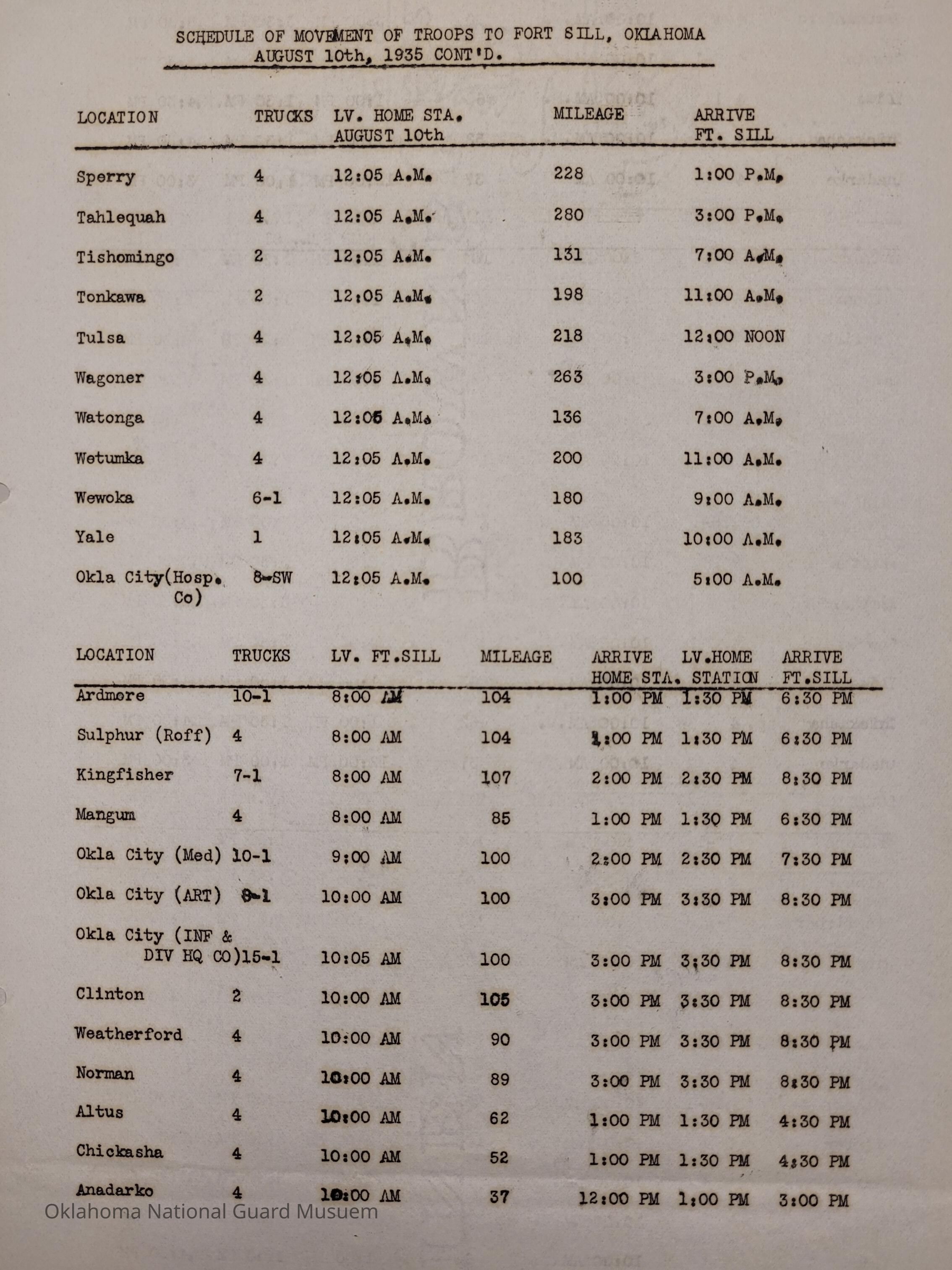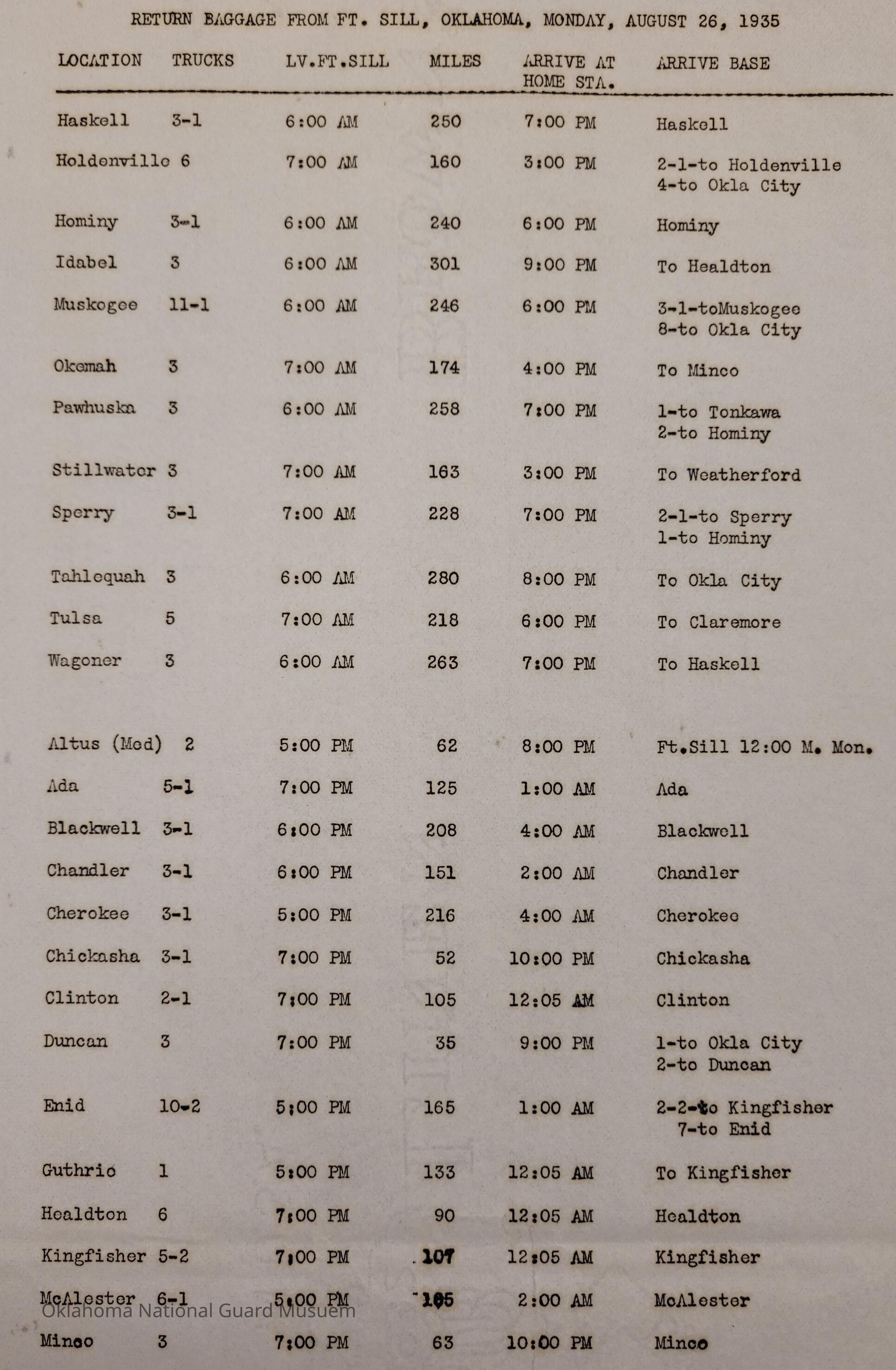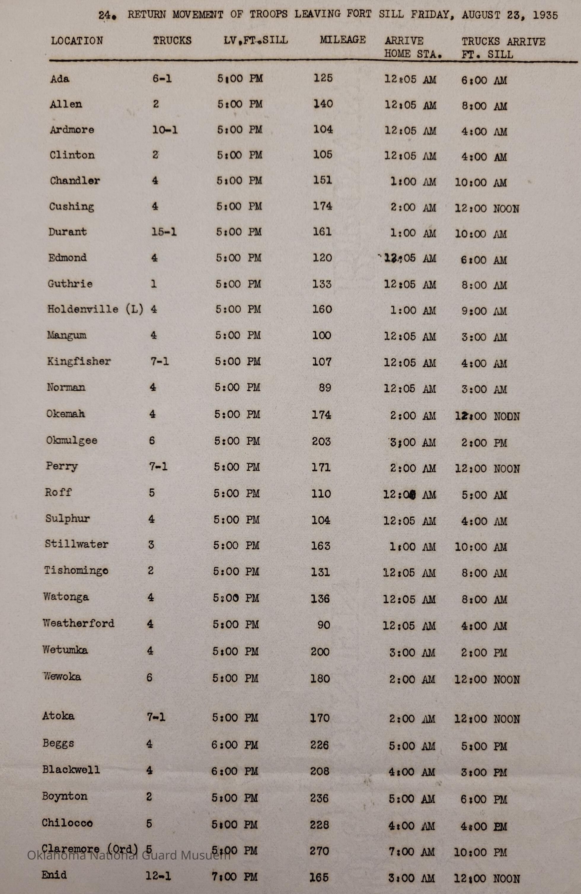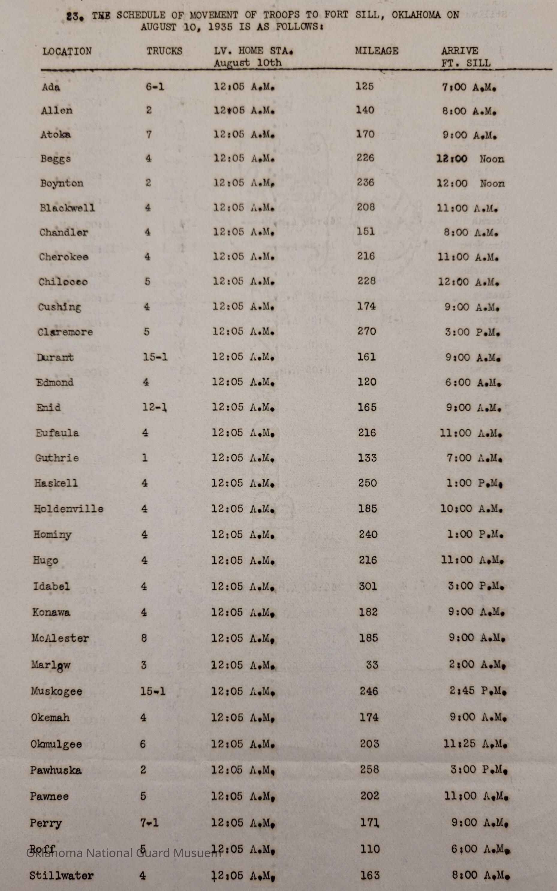 Adjutant General, Oklahoma City, Charles F. Barrett, Transportation, Fort Sill, Camp of Instruction, Rations, Trucks, Baggage, Ada, Allen, Altus, Alva, Anadarko, Blackwell, Chandler, Cherokee, Clinton, Cushing, Claremore, Duncan, Enid, Guthrie, Haskell, Healdton, Holdenville, Hominy, Hugo, Kingfisher, McAlester, Minco, Pawhuska, Pawnee, Perry, Roff, Sulphur, Sperry, Tonkawa, Tulsa, Wagoner, Watonga, Weatherford, Wewoka, Ardmore, Atoka, Beggs, Boynton, Chickasha, Chilocco, Edmond, Eufaula, Mangum, Idabel, Marlow, Muskogee, Norman, Okemah, Okmulgee, Stillwater, Tahlequah, Tishomingo, Wetumka, Yale, 160th Field Artillery, Signal Company, 158th Field Artillery, 189th Field Artillery, 120th Medical Regiment, 70th Field Artillery Brigade