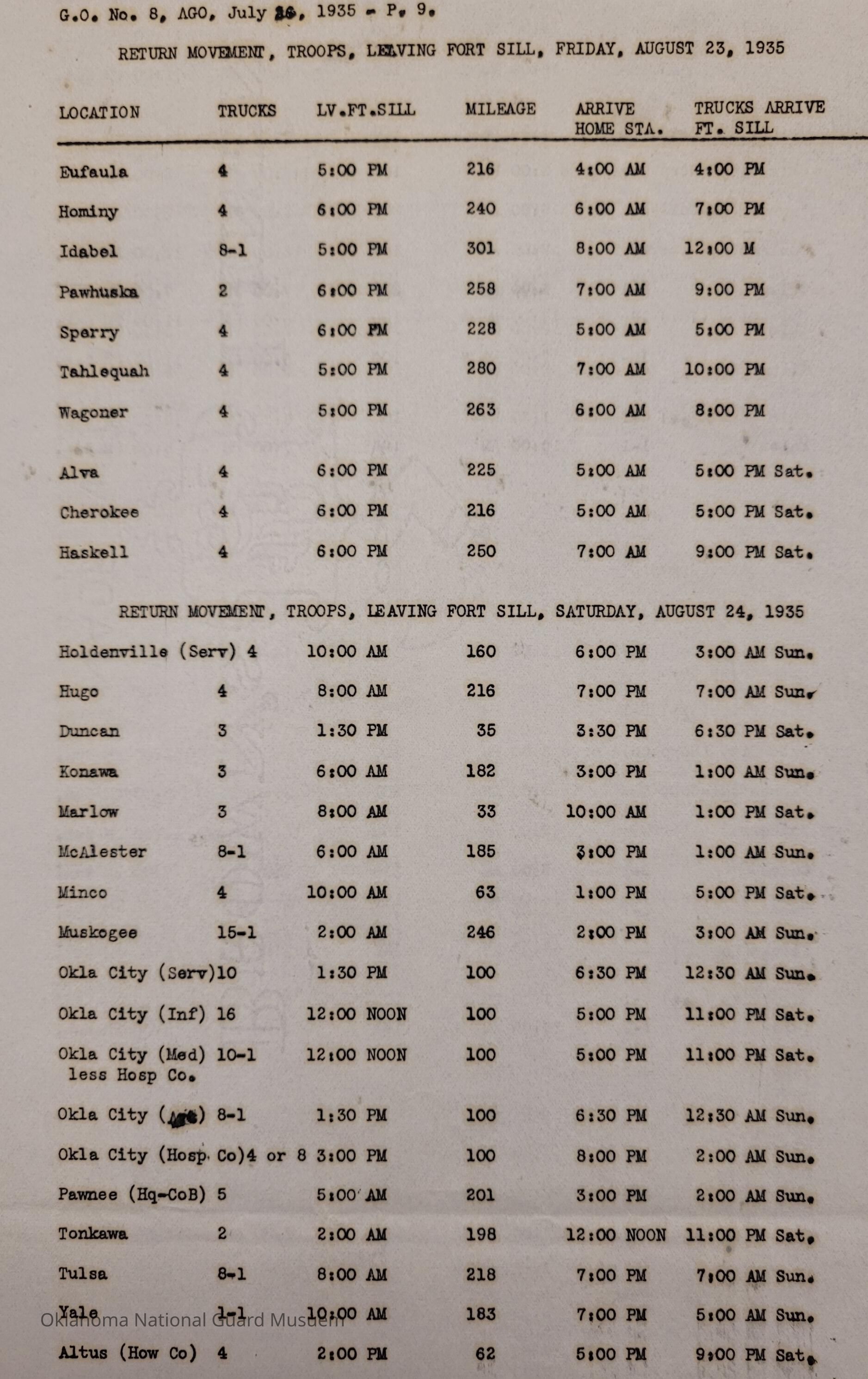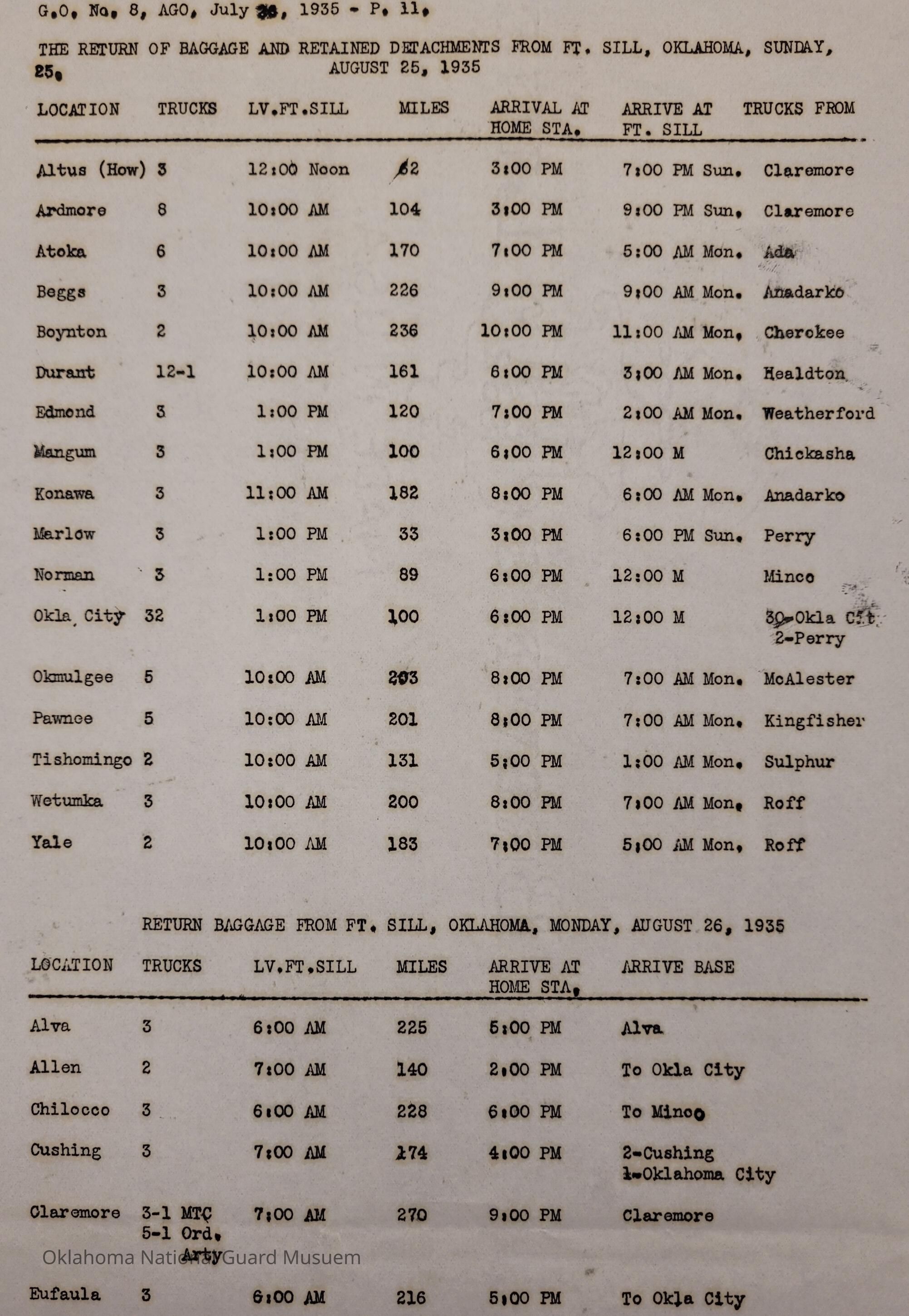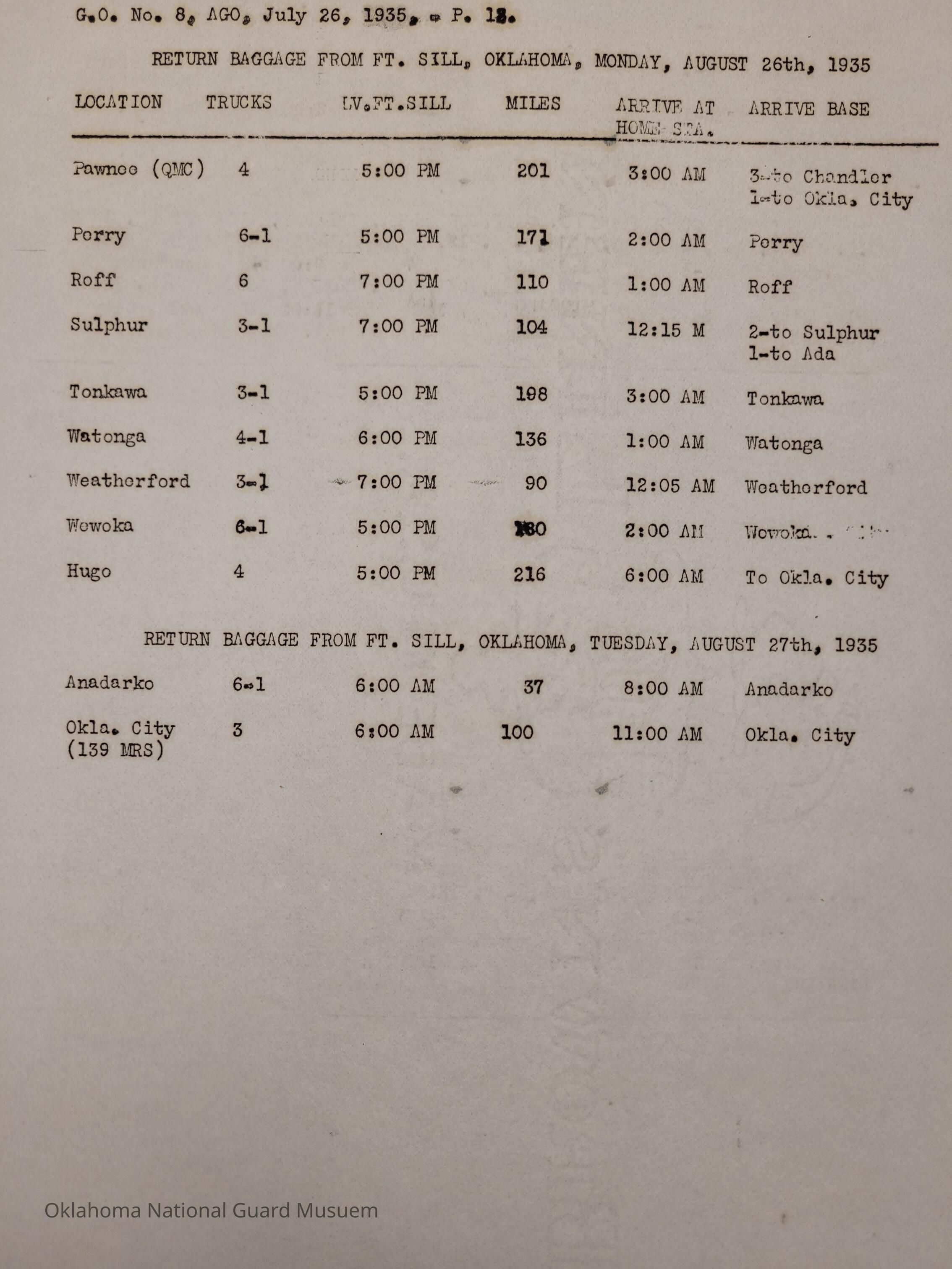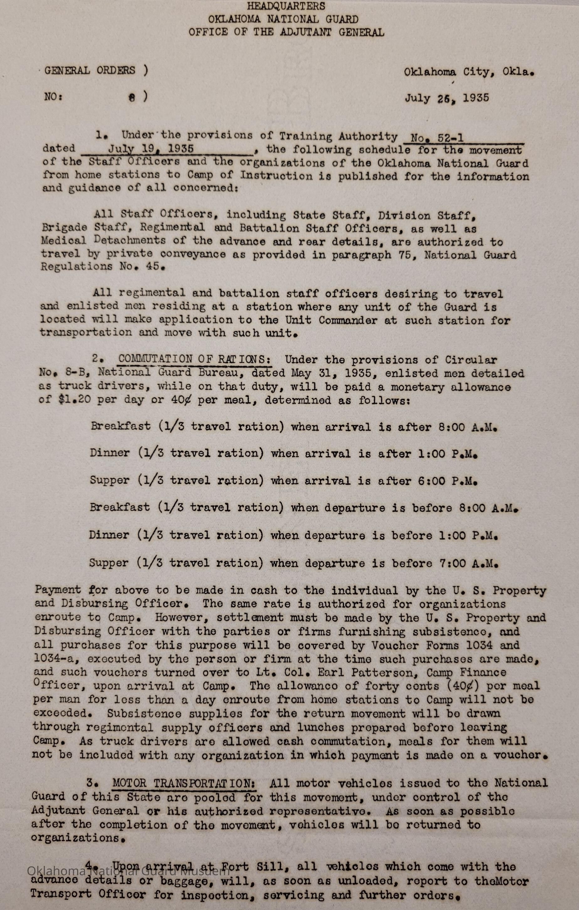 General Order #8 from Headquarters Adjutant General's Office in Oklahoma City. The order details the transportation schedule and itinerary from home stations to Fort Sill for the Annual Camp of InstructionDate(s) of Creation