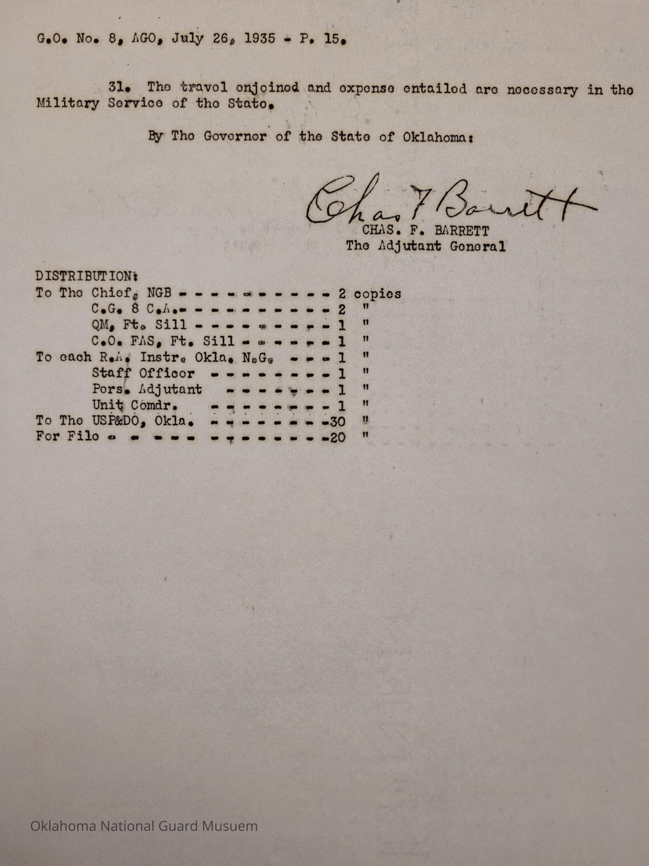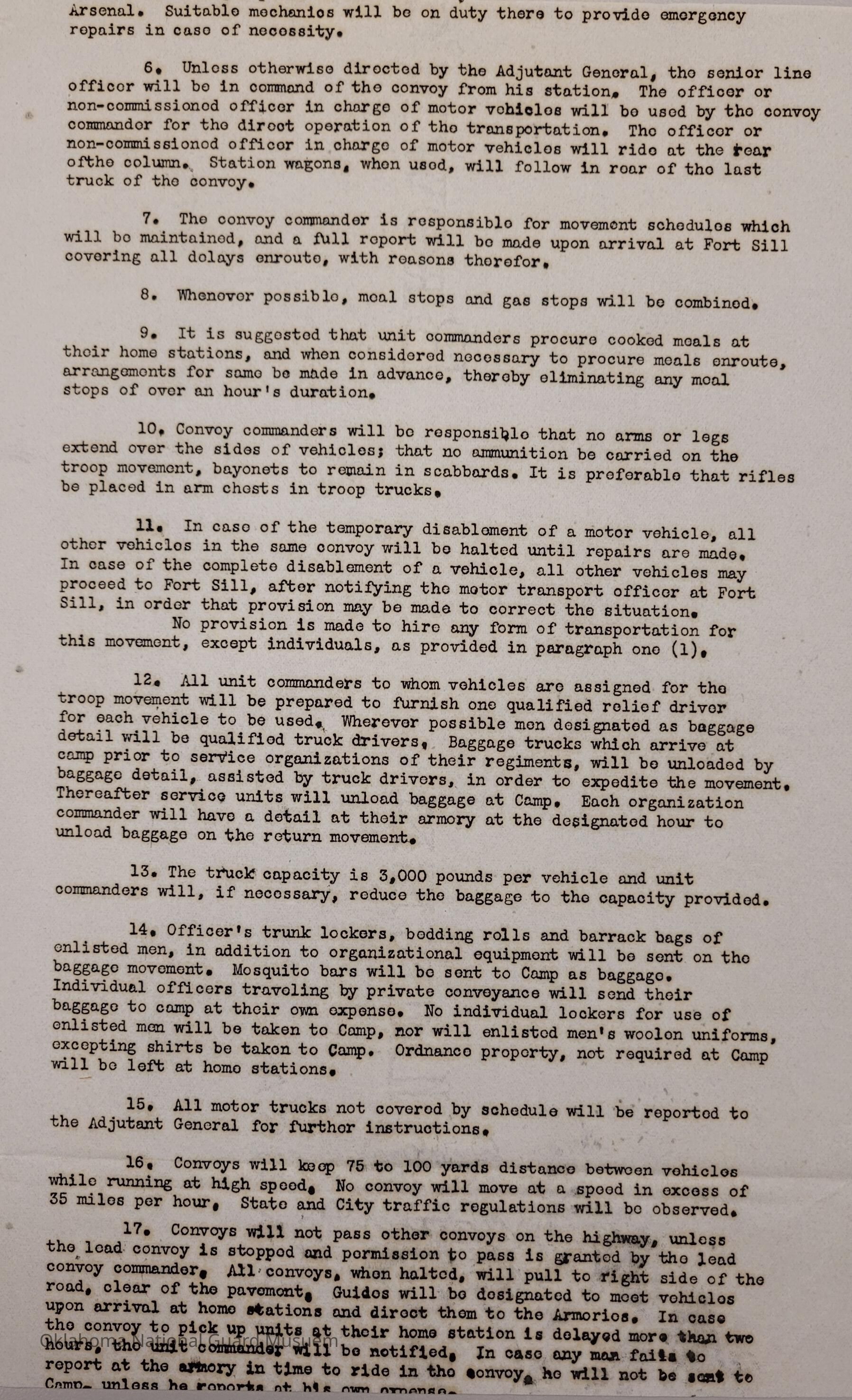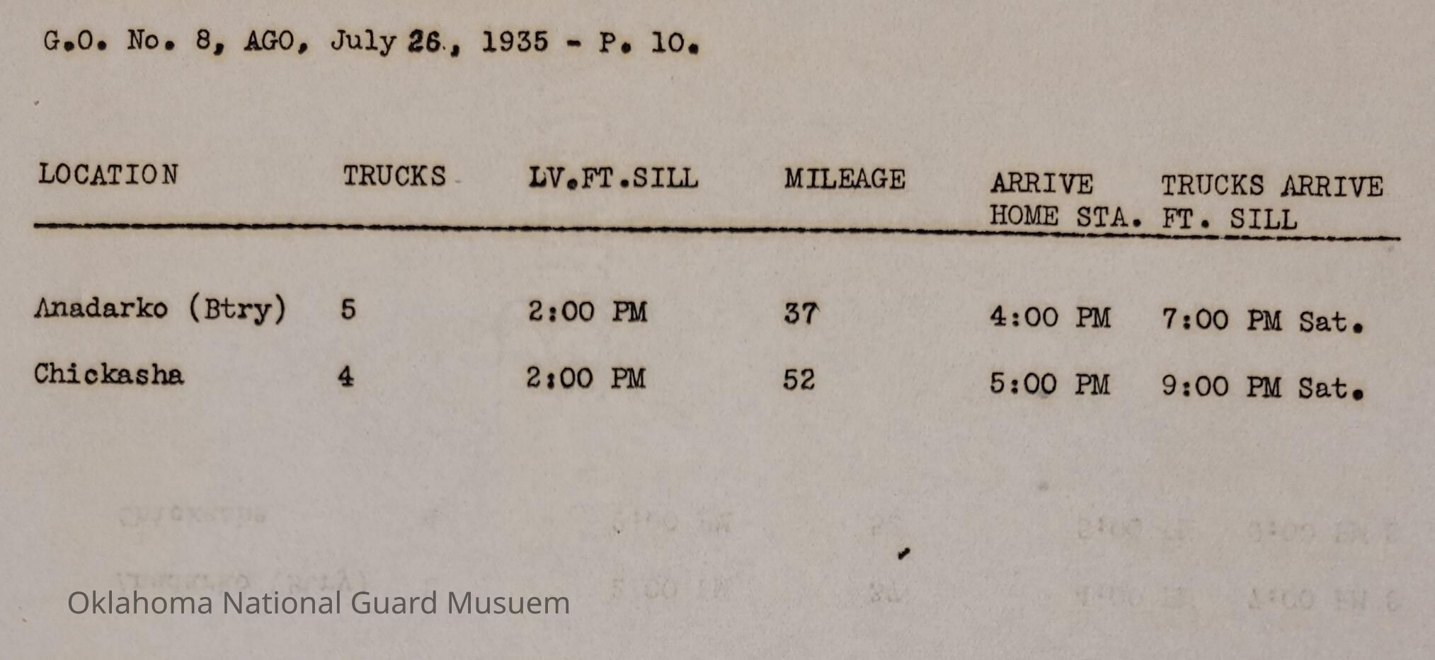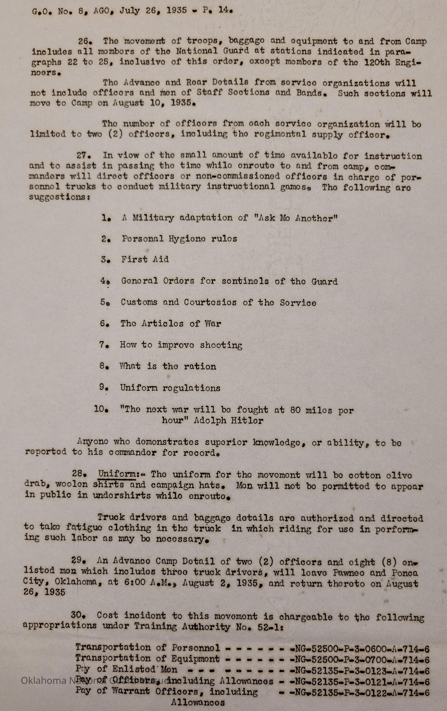 General Order #8 from Headquarters Adjutant General's Office in Oklahoma City. The order details the transportation schedule and itinerary from home stations to Fort Sill for the Annual Camp of InstructionDate(s) of Creation
