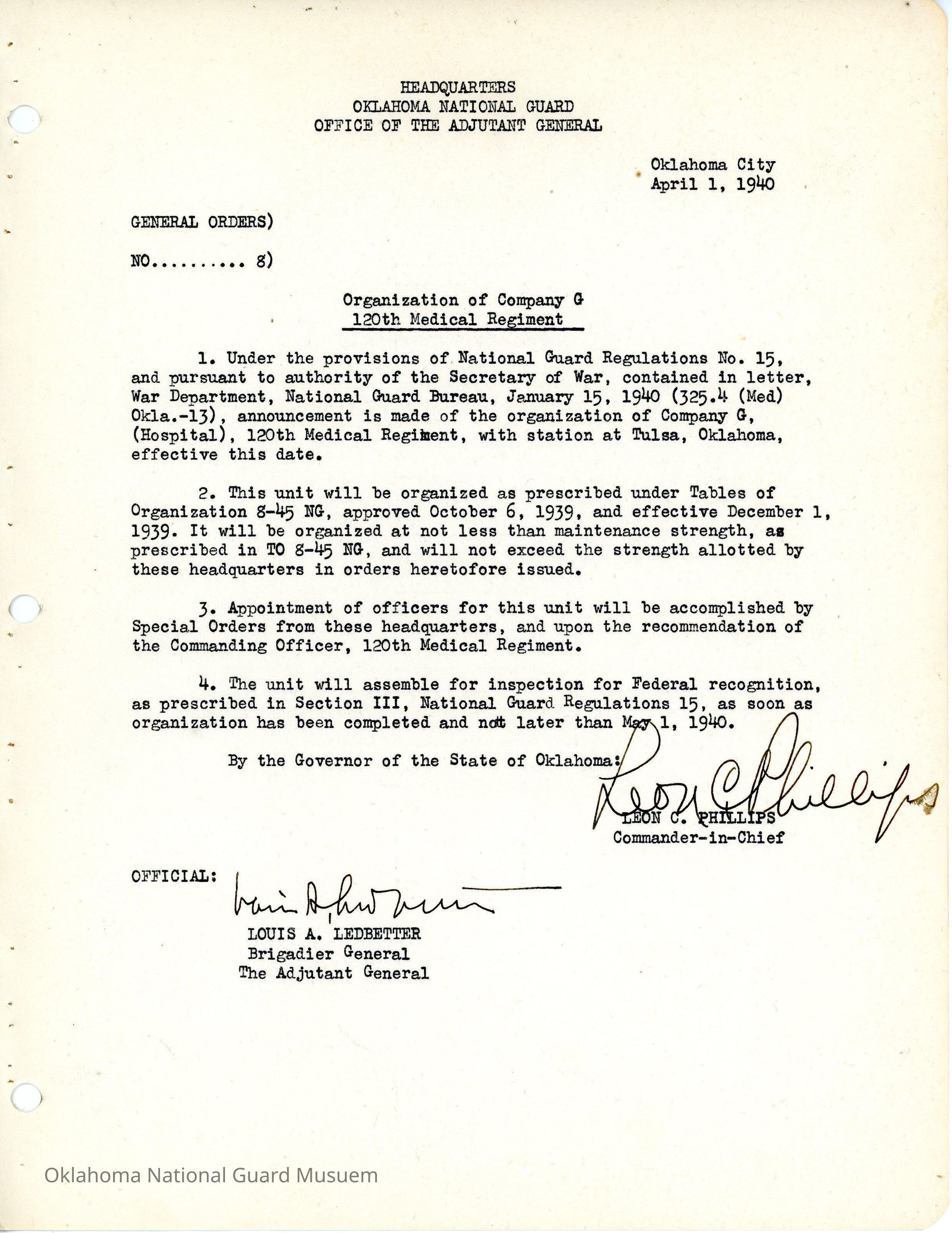 Adjutant General, Oklahoma City, Leon C. Phillips, Louis Ledbetter, Tulsa, Organize, 120th Medical Regiment, Inspection