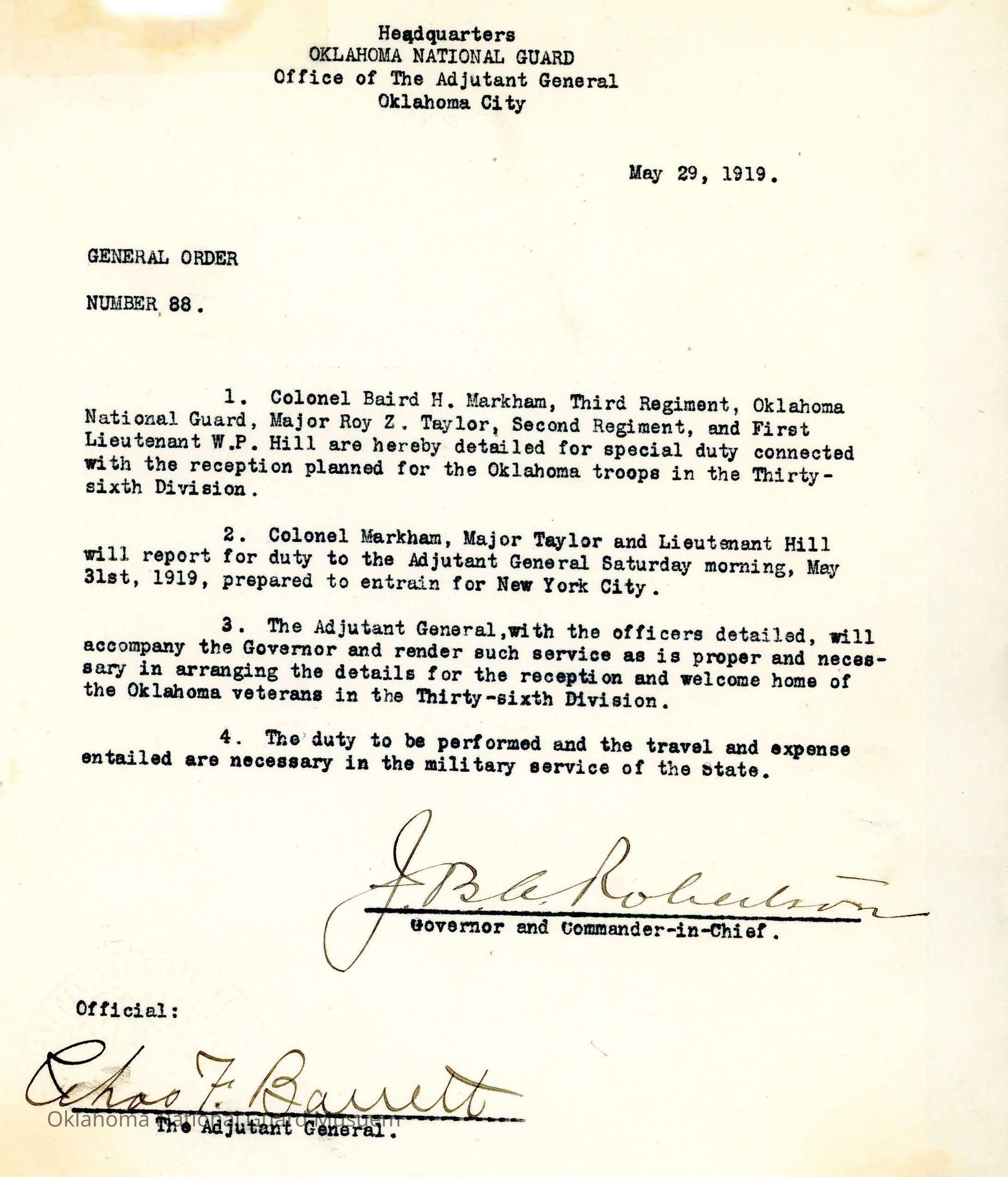 General Order #88 from Headquarters Adjutant General's Office in Oklahoma City. The order assigns Baird H. Markham, Roy Z. Taylor, and W.P. Hill to special duty connected with the reception planned for the retuning veterans of the Thirty Sixth Division.Date(s) of Creation