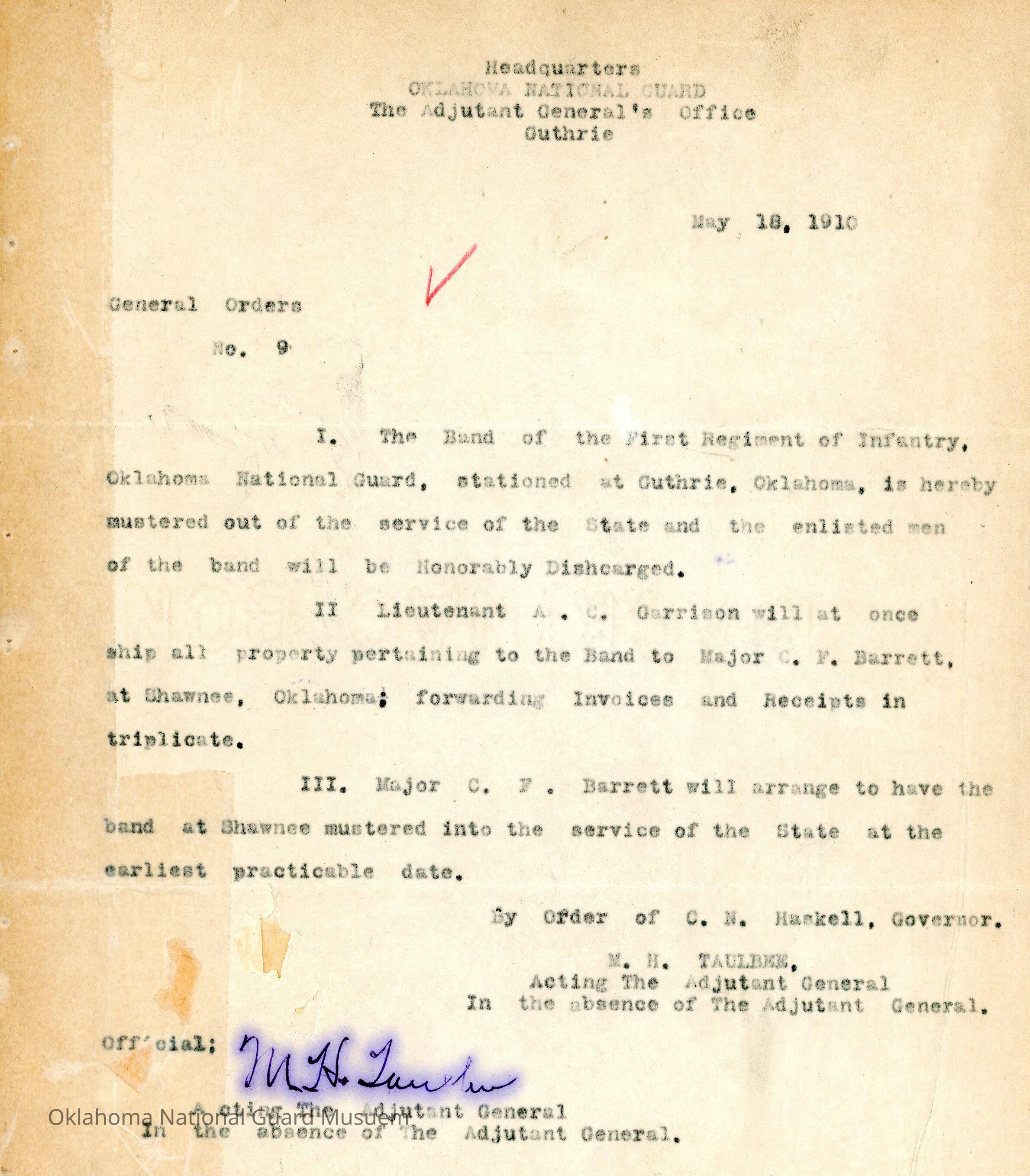Adjutant General, Guthrie, M.H. Taulbee, Charles N. Haskell, Band, Disband, First Infantry, Shawnee, Charles F. Barrett, A.C. Garrison