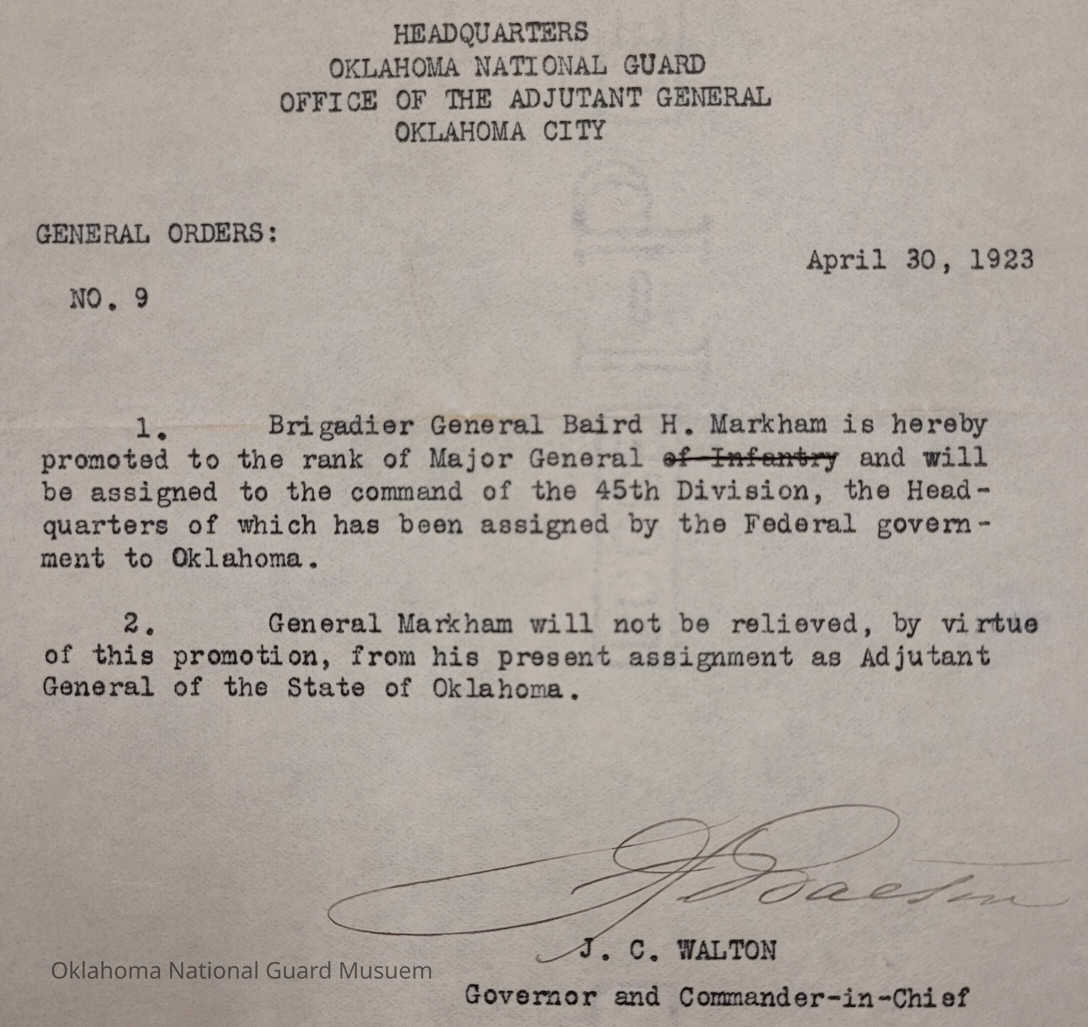 General Order #9 from Headquarters Adjutant General's Office in Oklahoma City. The order promotes Baird H. Markham to Major General and assigned to command the 45th Division Headquarters. Still retain the position of the Adjutant GeneralDate(s) of Creation