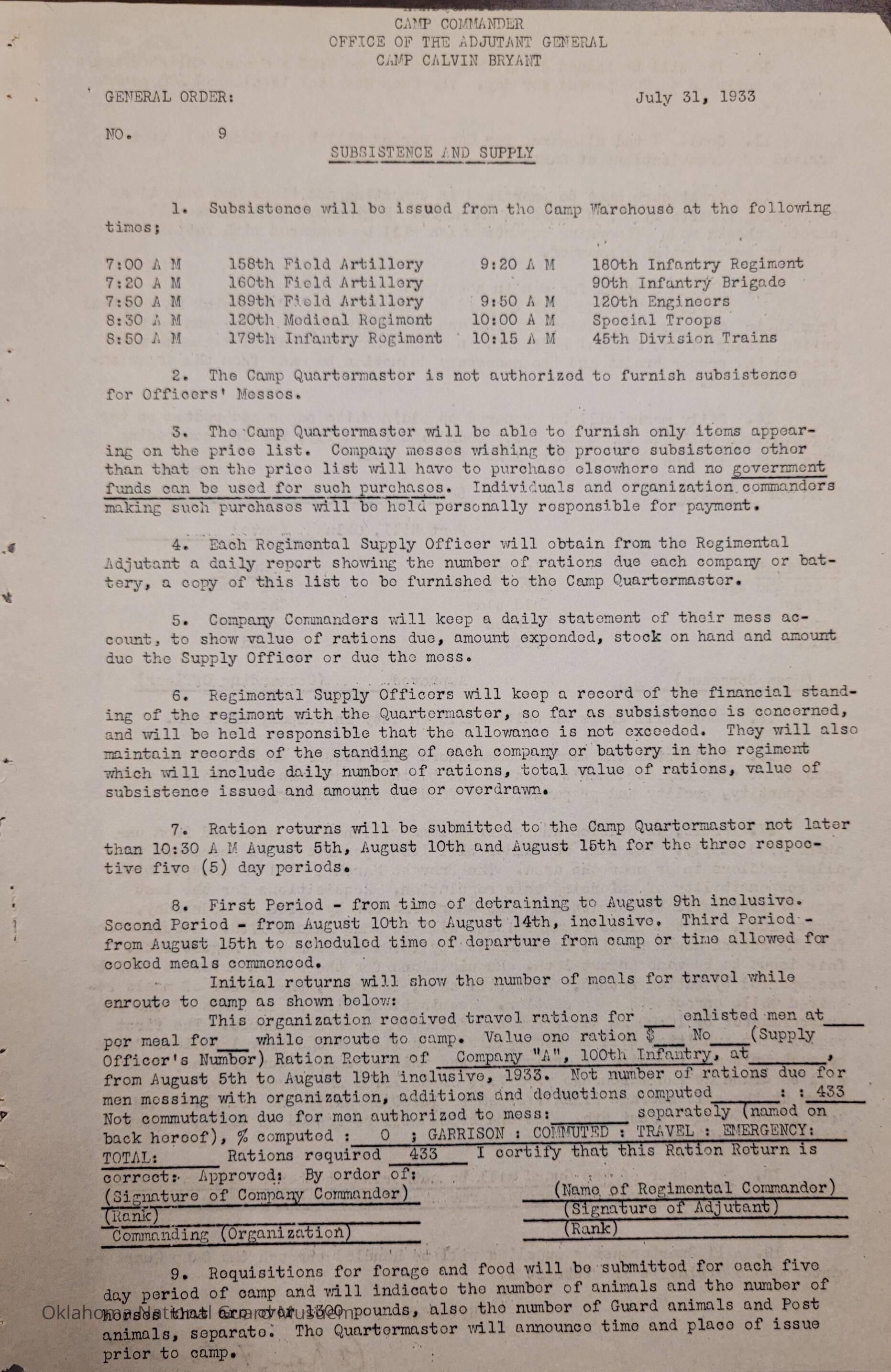 General Order #9 from Headquarters Adjutant General's Office in Oklahoma City. The order details supply and subsistence provided at the Annual Encampment at Fort SillDate(s) of Creation