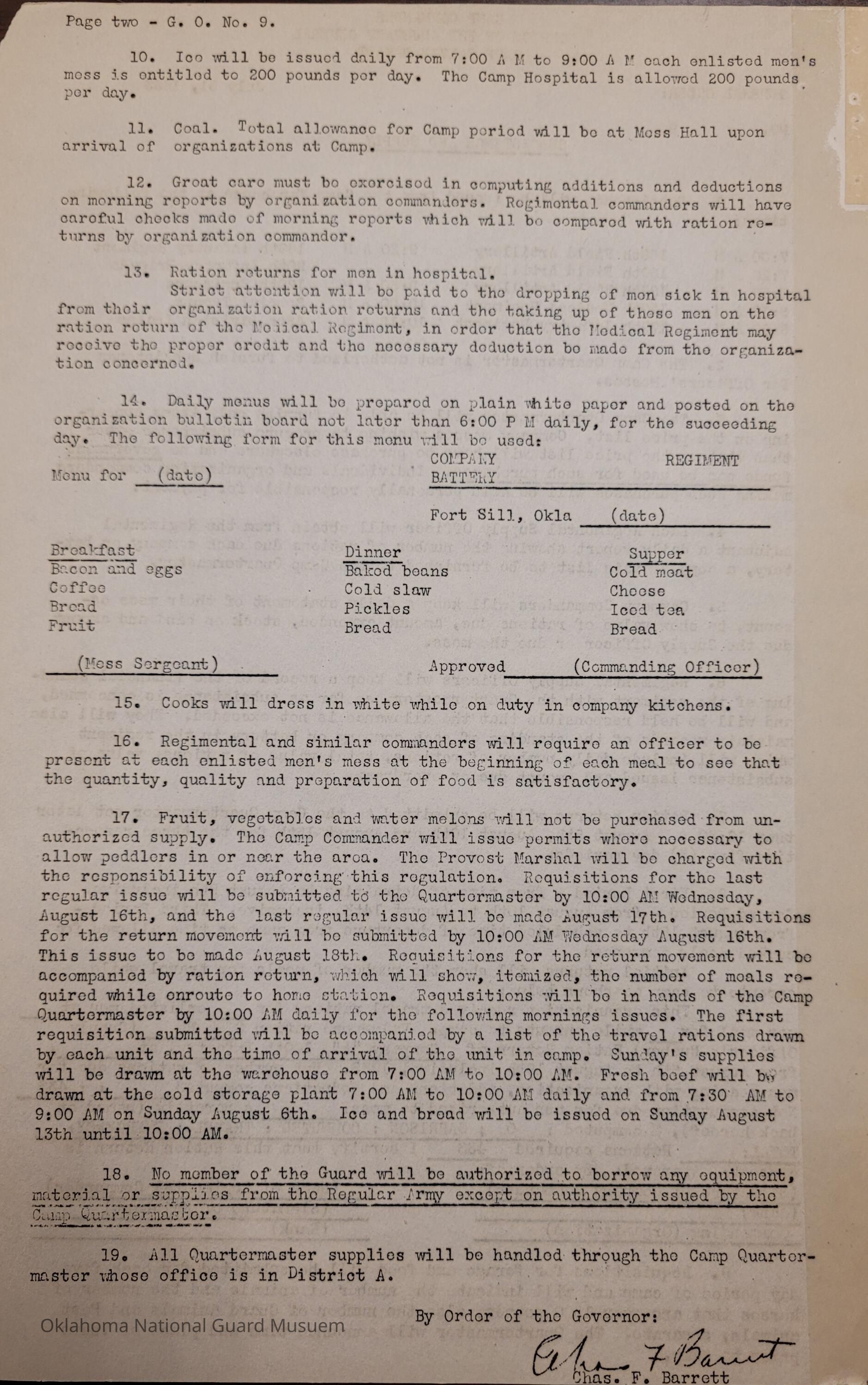 Adjutant General, Oklahoma City, Charles F. Barrett, Camp of Instruction, Fort Sill, Camp Calvin Bryant, Supply, Subsistence, Mess, Food, Menu, 158th Field Artillery, 160th Field Artillery, 189th Field Artillery, 120th Medical Regiment, 179th Infantry, 180th Infantry, 90th Infantry Brigade, 120th Engineers, Special Troops, 45th Division Trains, Cooks