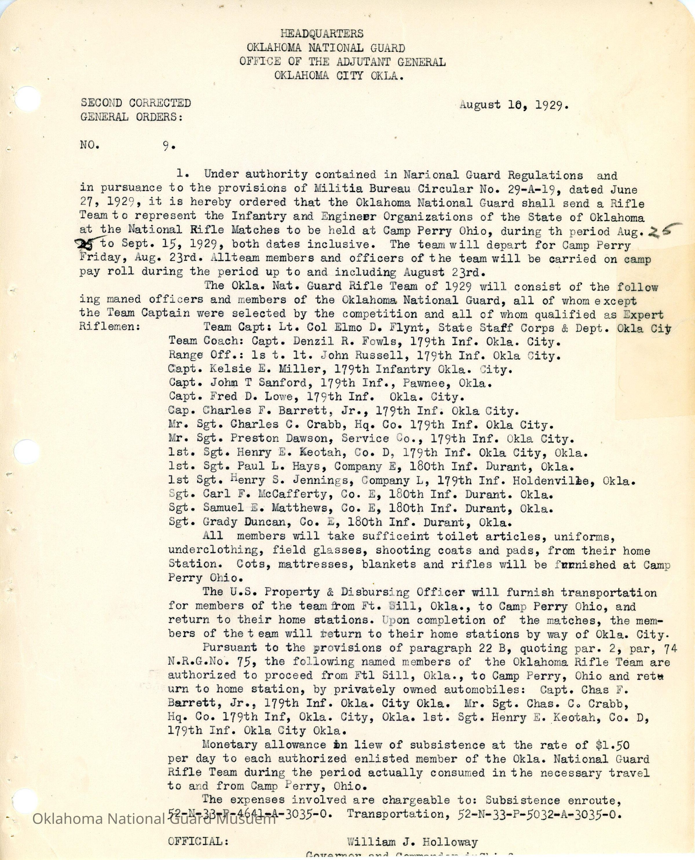 General Order #9 Second Corrected Copy from Headquarters Adjutant General's Office in Oklahoma City. The order denotes the men who will serve on the Rifle Team and represent Oklahoma at the National Rifle Matches in Camp Perry, OhioDate(s) of Creation