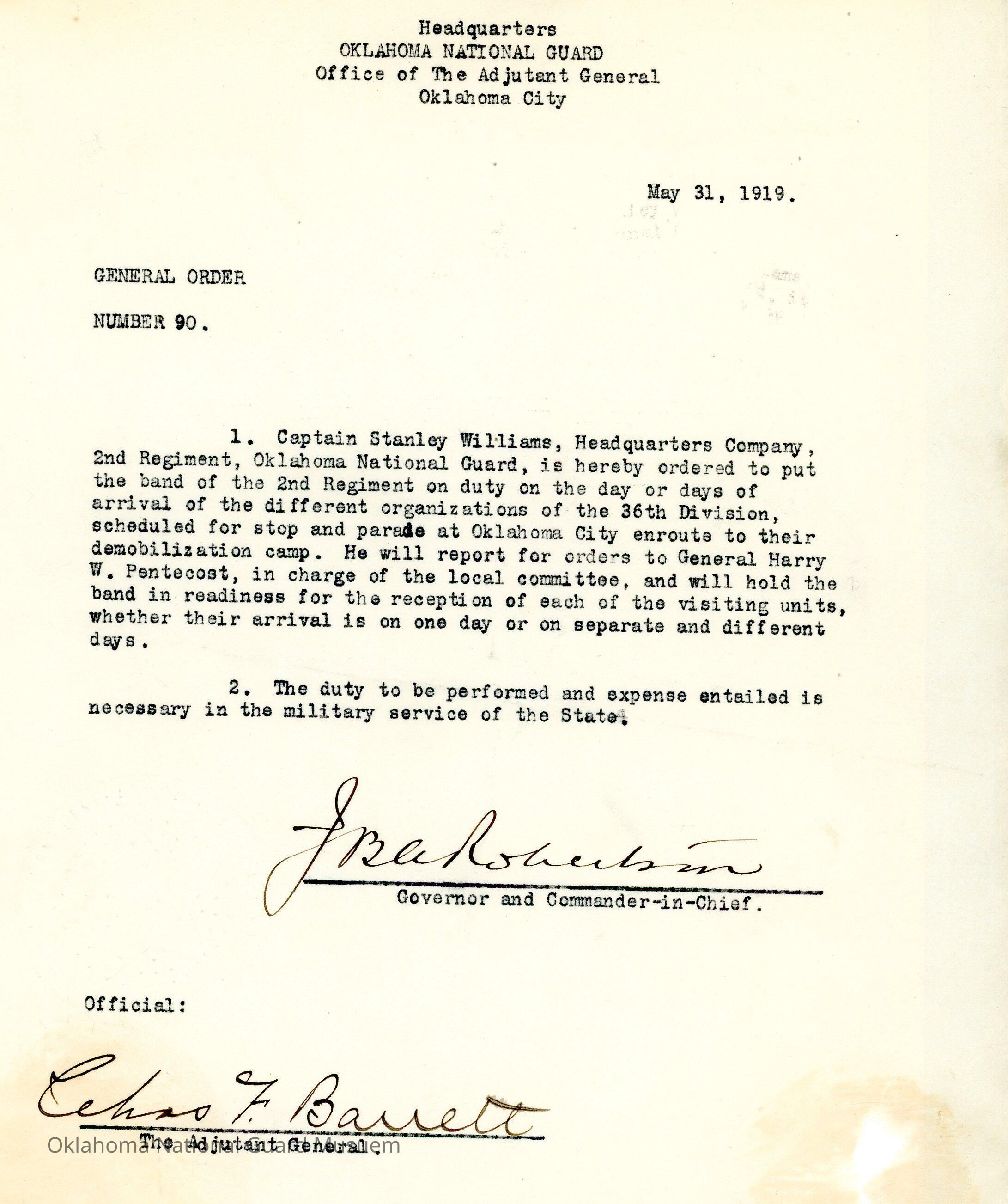 General Order #90 from Headquarters Adjutant General's Office in Oklahoma City. The order instructs Stanley Williams to put the band on duty when the veterans in the Thirty Sixth Division arrive for the parade in Oklahoma City.Date(s) of Creation