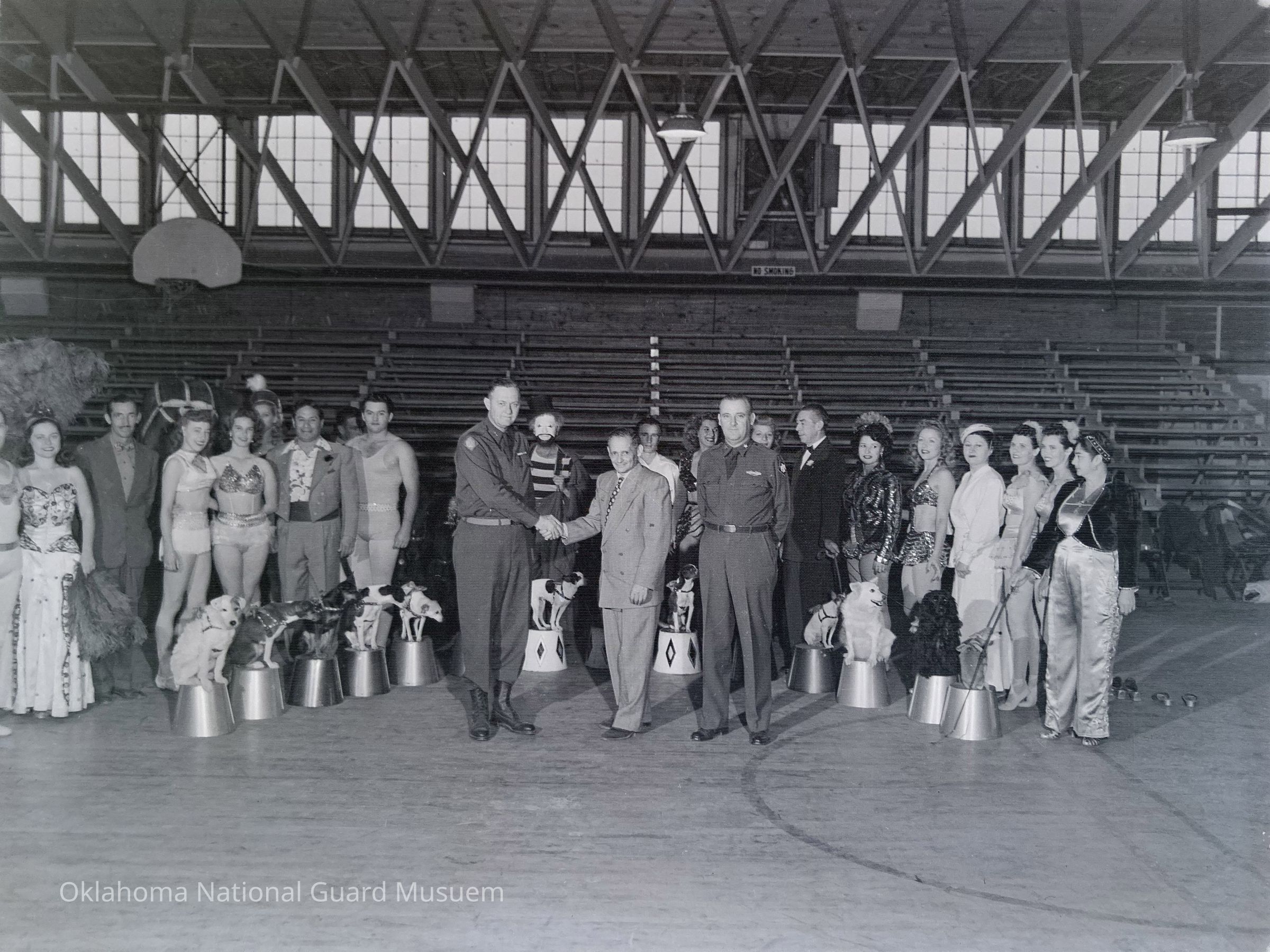 General Styron greeting a circus troupe inside a gymnasium