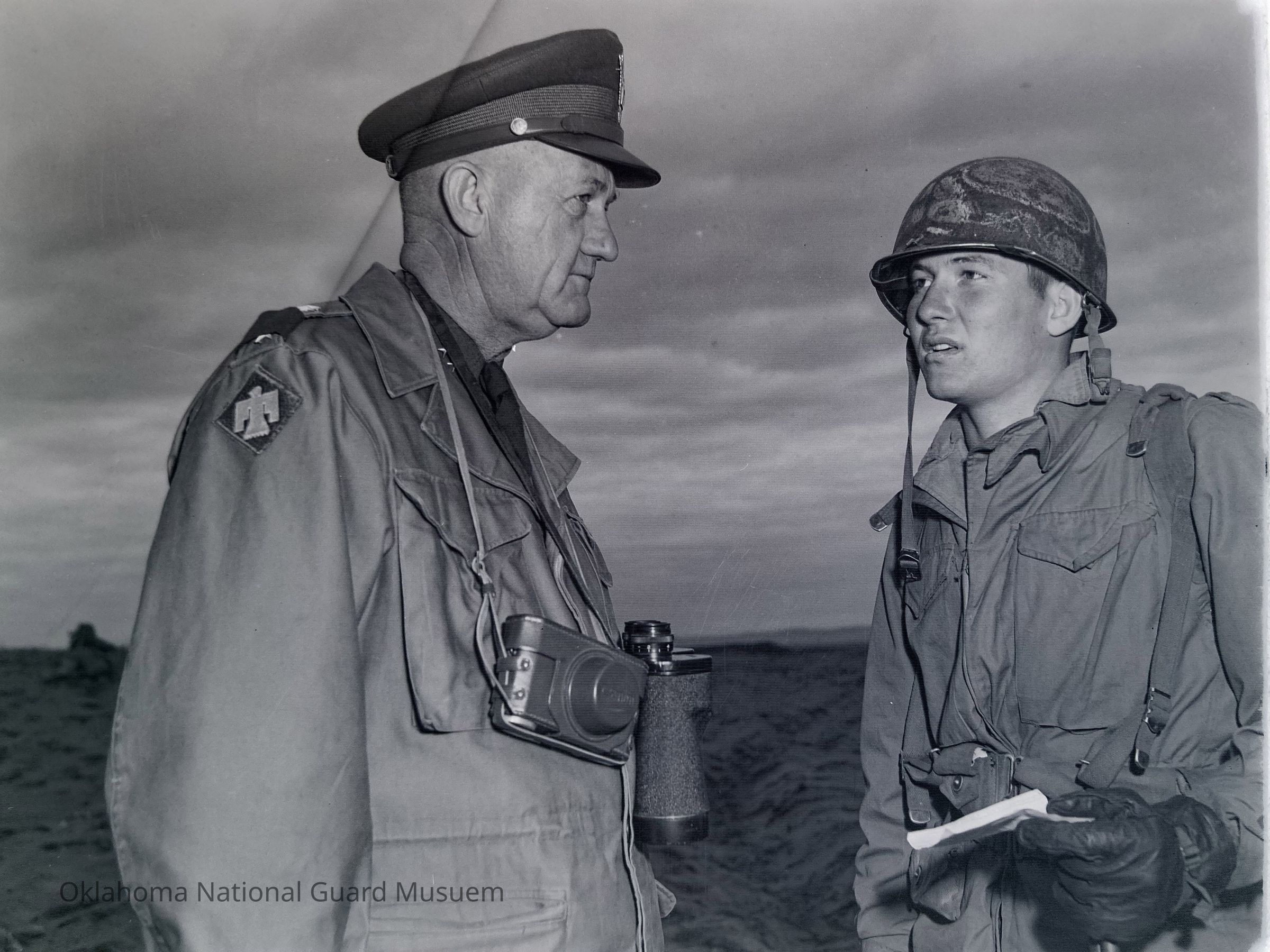 Negative of General Styron talking with soldier during beach landing practice on Hokkaido, Japan