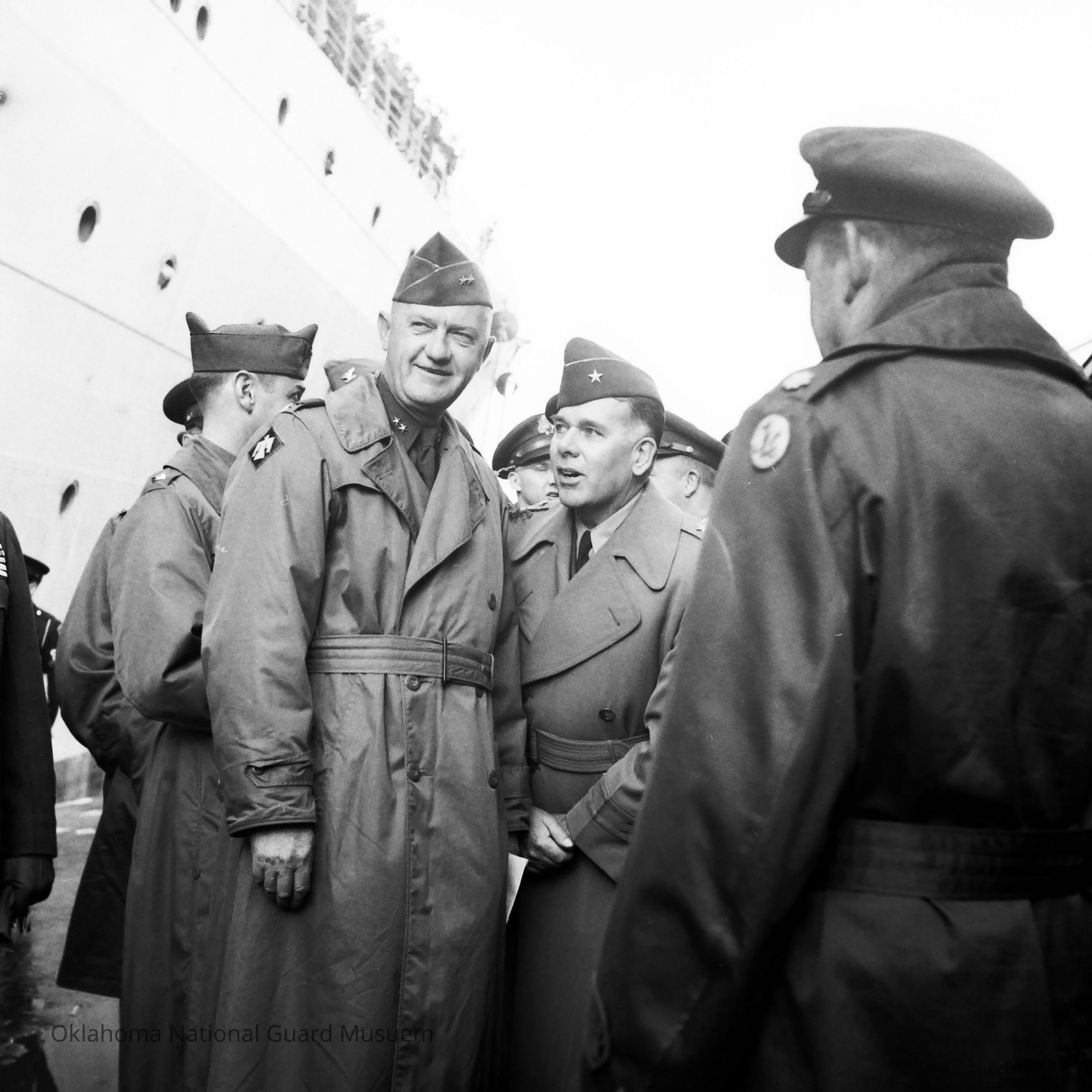Negative of General Styron with another General on a dock