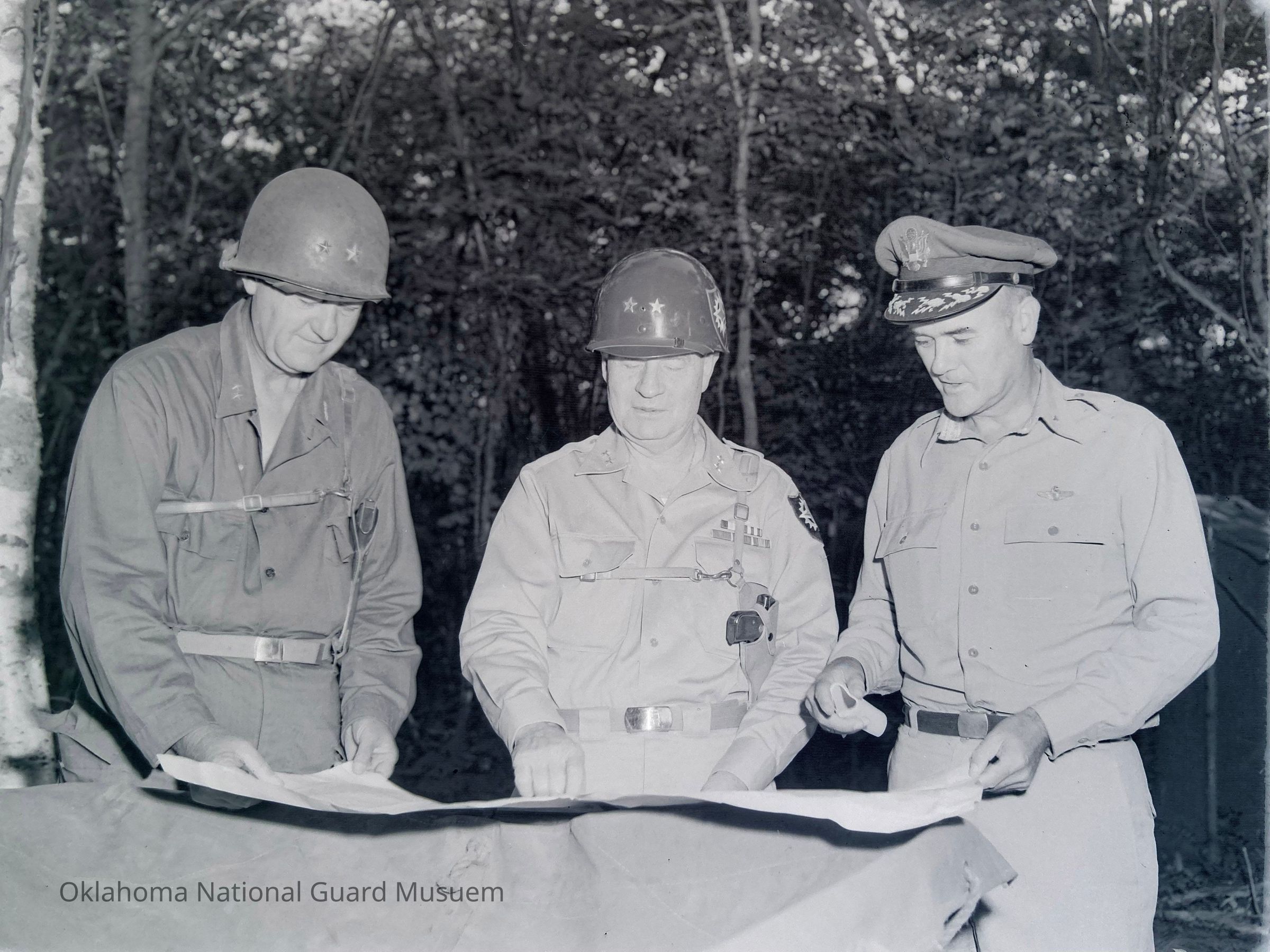 Generals Styron and Allen study a map with another unknown general