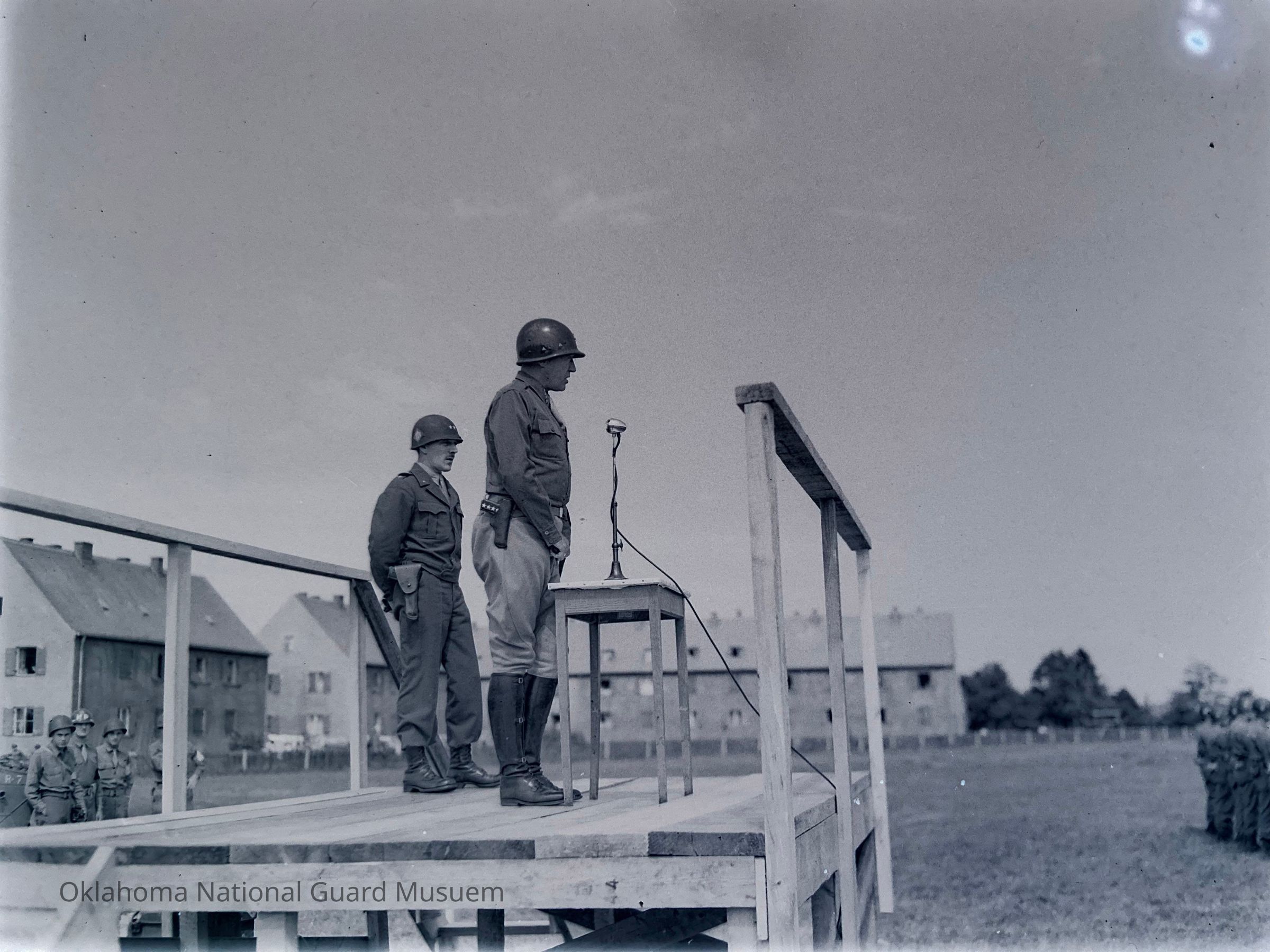 Negative of General George Patton reviewing the 45th Division with General Frederick