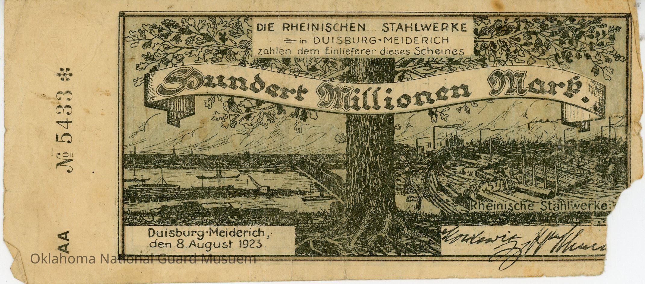 Notgeld refers to money issued by an institution in a time of economic or political crisis. The issuing institution is usually one without official sanction from the central government. This occurs usually when sufficient state-produced money is not available from the central bank. Most notably, notgeld generally refers to money produced in Germany and Austria during World War I and the Interbellum. Issuing institutions could be a town's savings banks, municipality and private or state-owned firms. Nearly all issues contained an expiry date, after which time they were invalid. Issues without dates ordinarily had an expiry announced in a newspaper or at the place of issuance.Collection