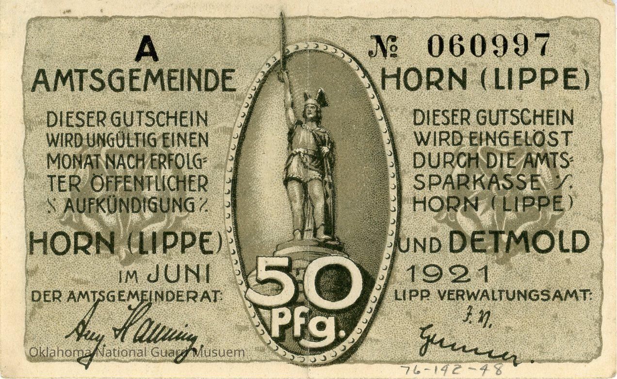 German City of Horn Fifty Pfennig Notgeld/ Accession number written on obverse in lower right corner.Context