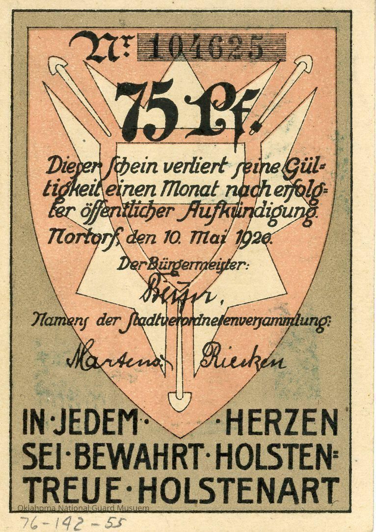 German City of Nortorf Seventy-Five Pfennig Notgeld. Accession number on obverse in lower left corner.Context