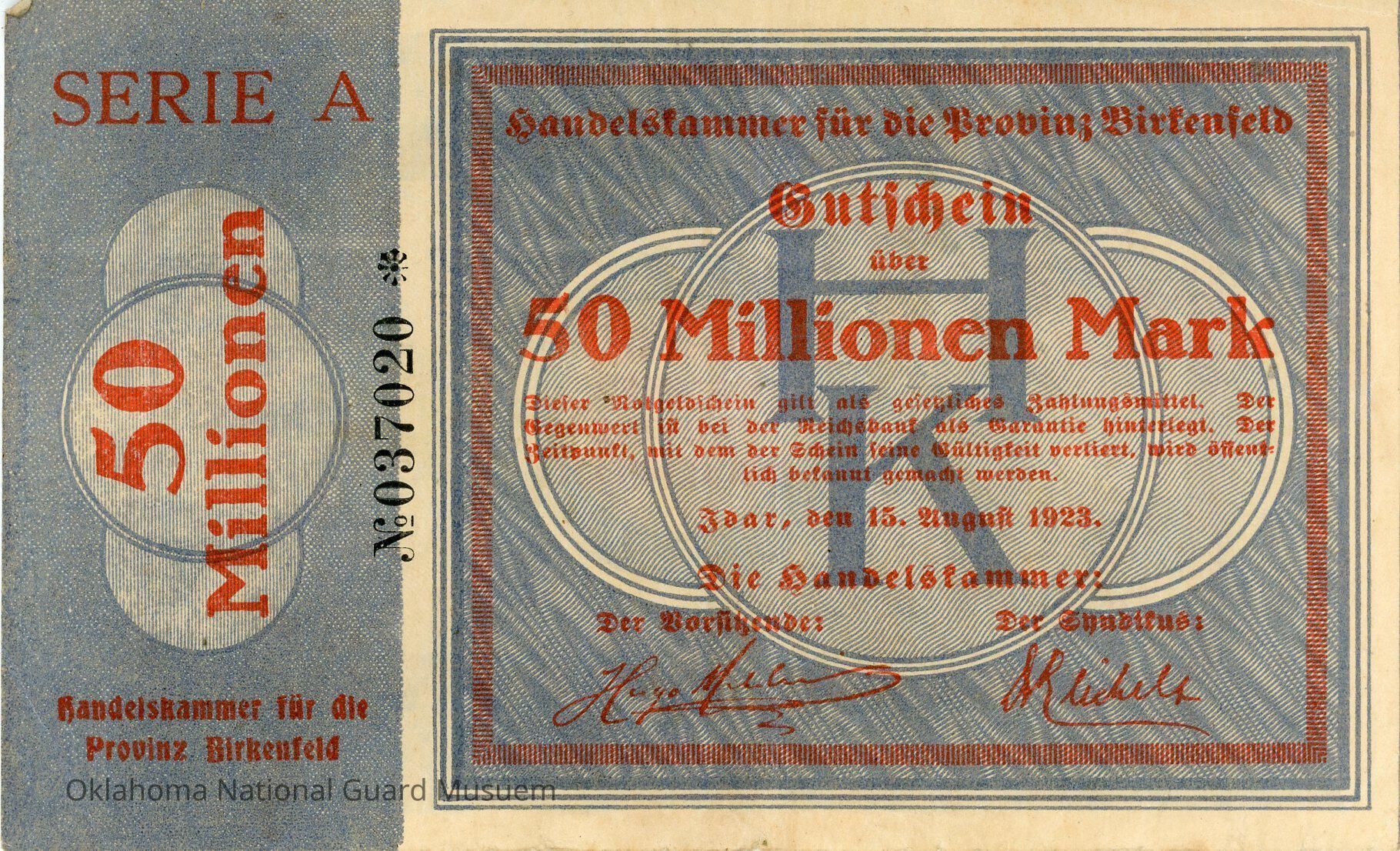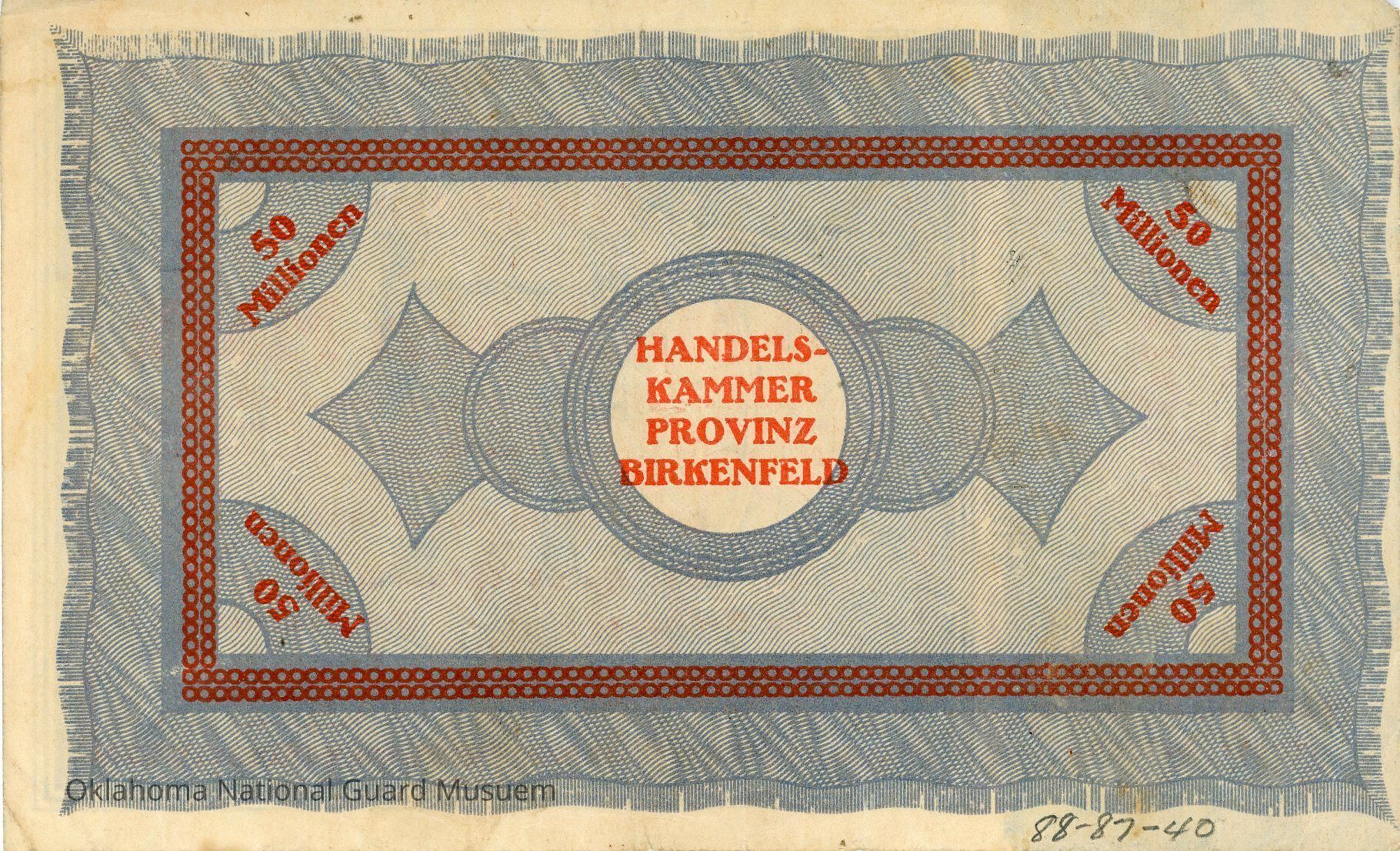 German District of Birkenfeld Fifty Million Mark Notgeld. Accession number written on reverse in lower right corner.Context