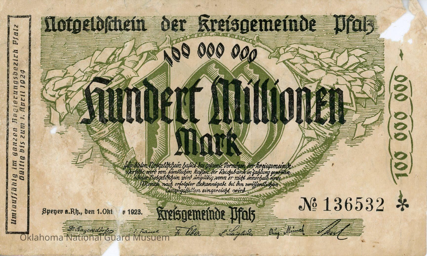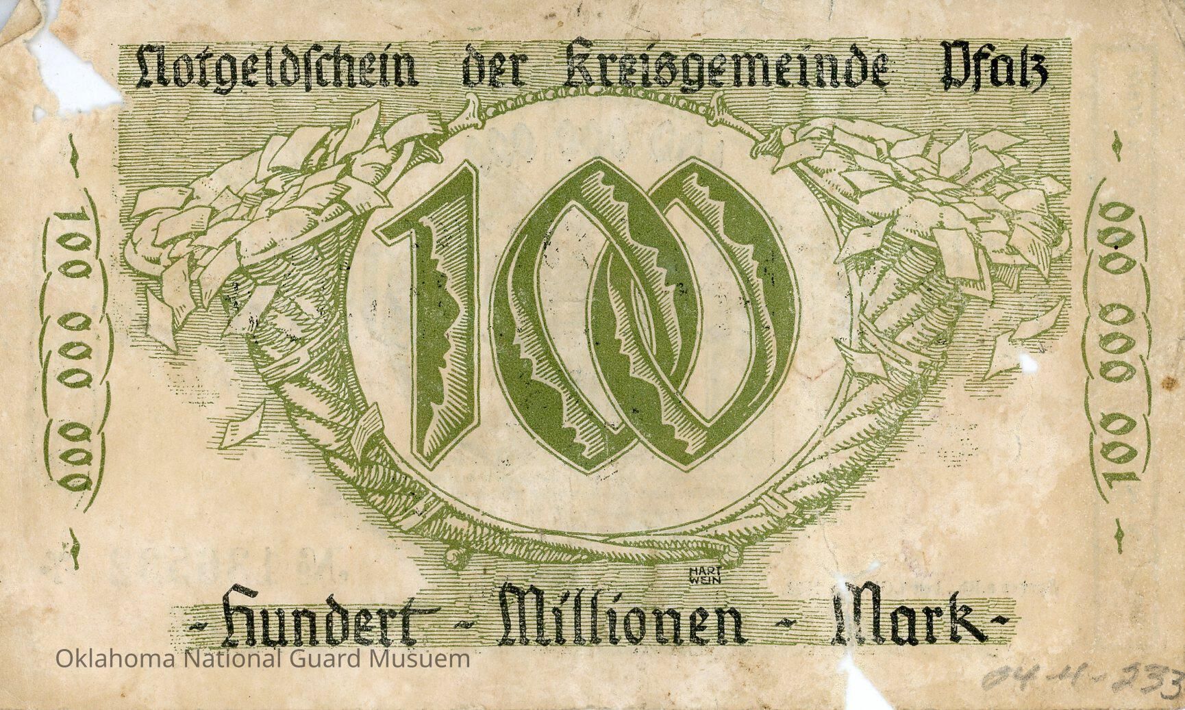 German District of Palatinate One Hundred Million Mark Notgeld. Accession number on reverse in lower right corner.Context