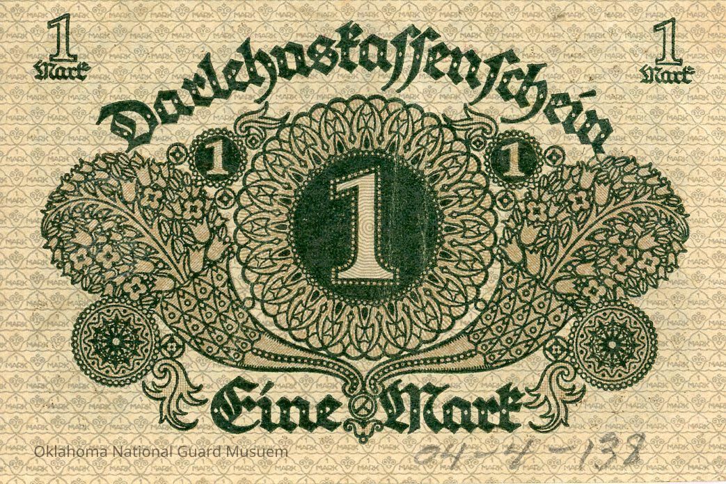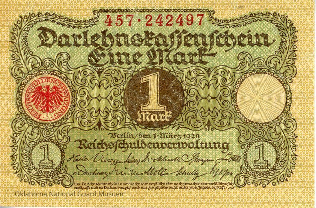 German One Mark Type 1920. State loan note. Dated March 1, 1920. Accession number written on reverse at the bottom.Context