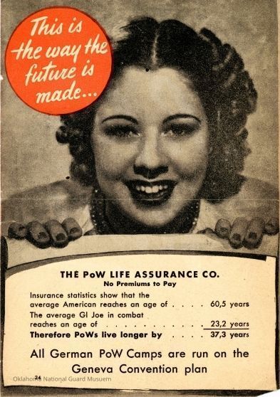 German propaganda showing a woman showing US soldiers that giving up and being a prisoner of war has a longer life expectancy than staying a fighting soldier. "Safety First" on the reverse sideContext