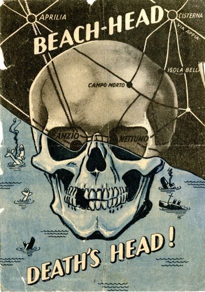 German propaganda showing a skull over a map of the Italian coast near Anzio. The reverse talks about the slow progress the Allies have made after landing and the deadly price being paid on the beachContext