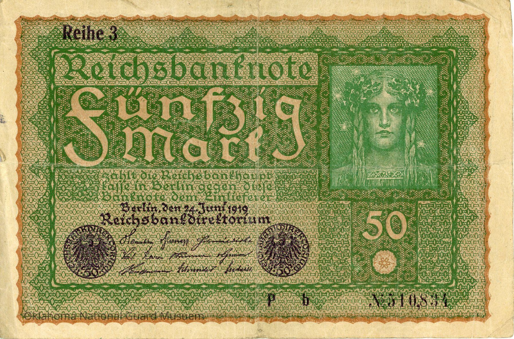An allegory of Germania represented by a young girl with long plaits and wearing tiara of oak leaves against a background of the starry sky. Signatures of the chairman of the board members. Two seals of the Reichsbank in purple.Transcription