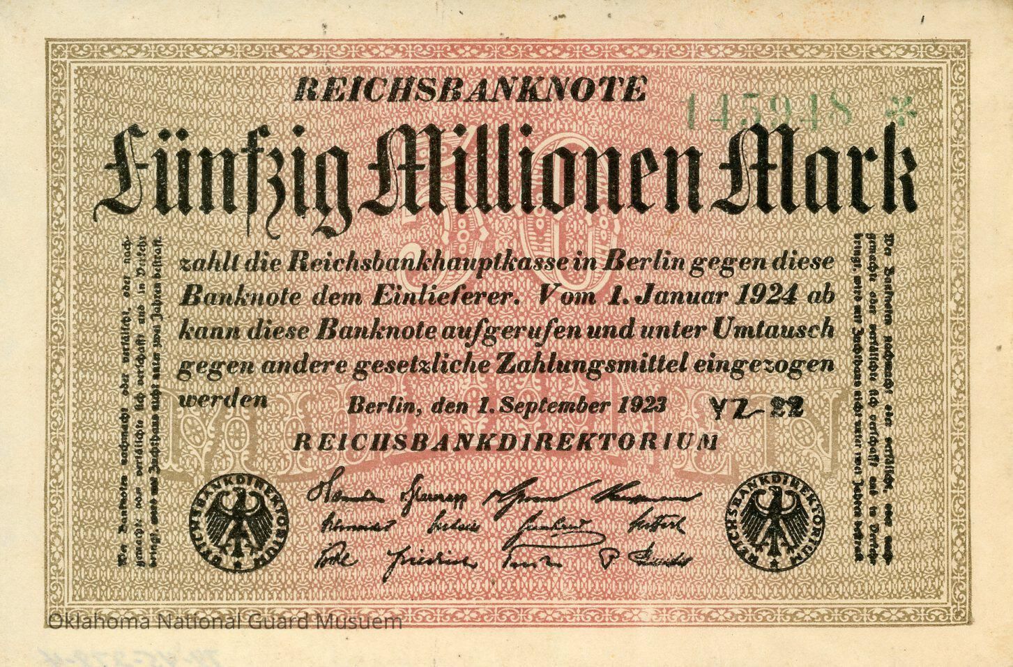 REICHSBANKNOTE Fifty million marks is paid by the Reichsbank hauptkasse in Berlin to the consignor in return for this banknote. From 1 January 1924, this banknote may be called up and confiscated in exchange for other legal tender. Berlin, 1 September 1923 REICHSBANKDIREKTORIUM