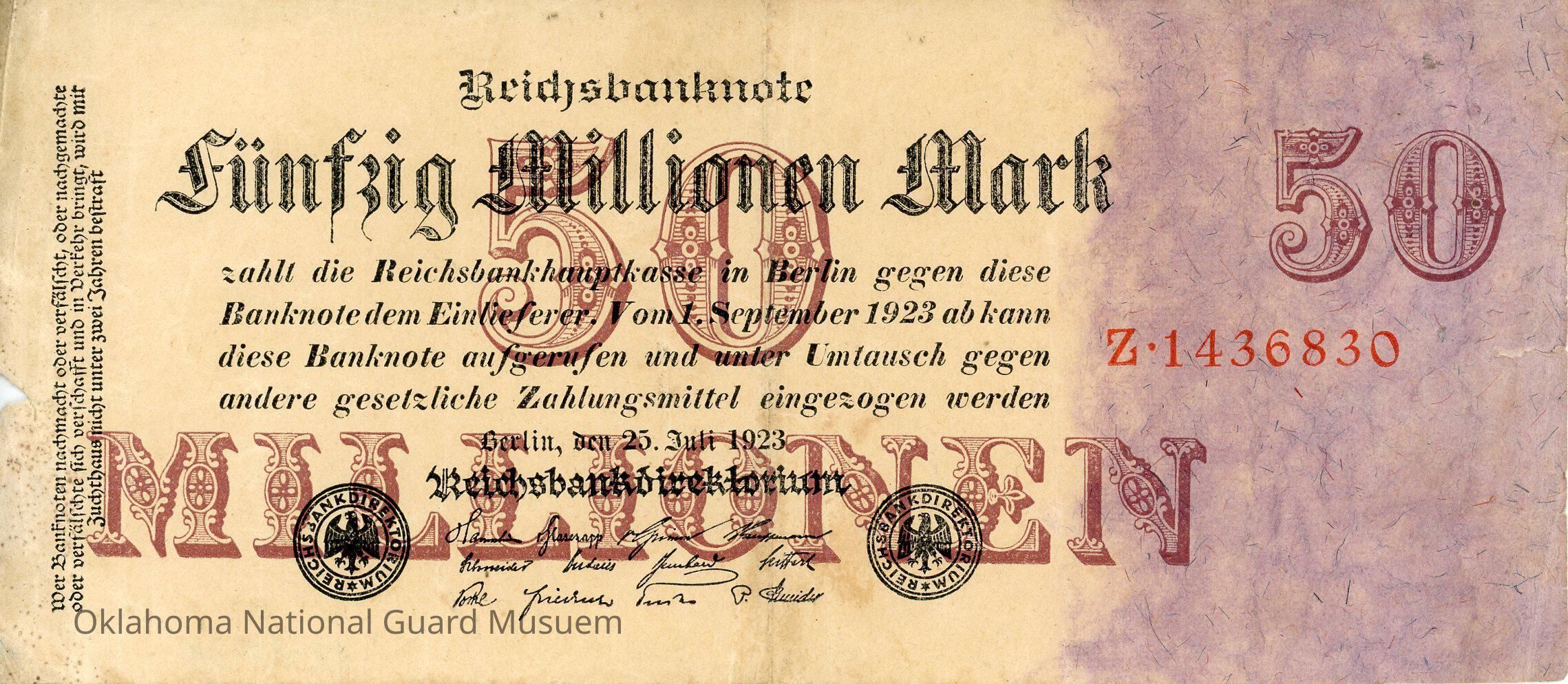 Banknote dem Einlieferer. Vom 1. September 1923 ab kann