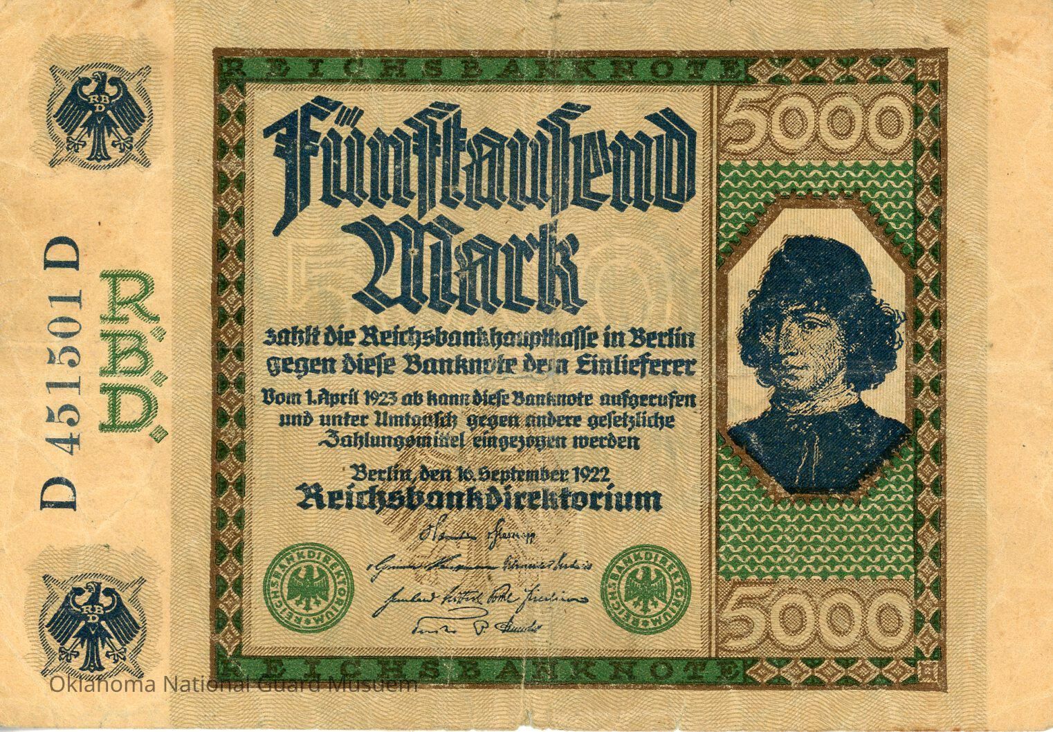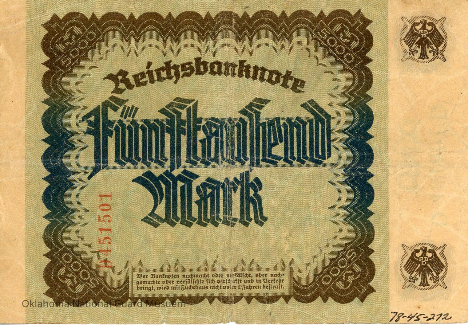 German Reichsbanknote Five Thousand Mark. Type 1922. Dated September 16, 1922. Accession number written on reverse at bottom. Inflation currency
