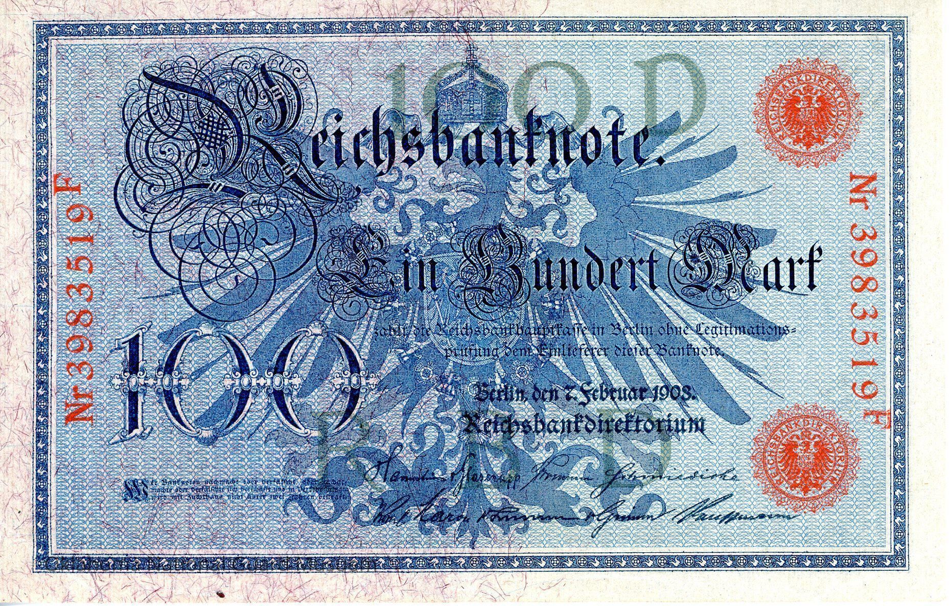 German Reichsbanknote One Hundred Mark Type 1908 "Blauer Hunderter" Red seal note. Dated February 7, 1908. Imperial banknote