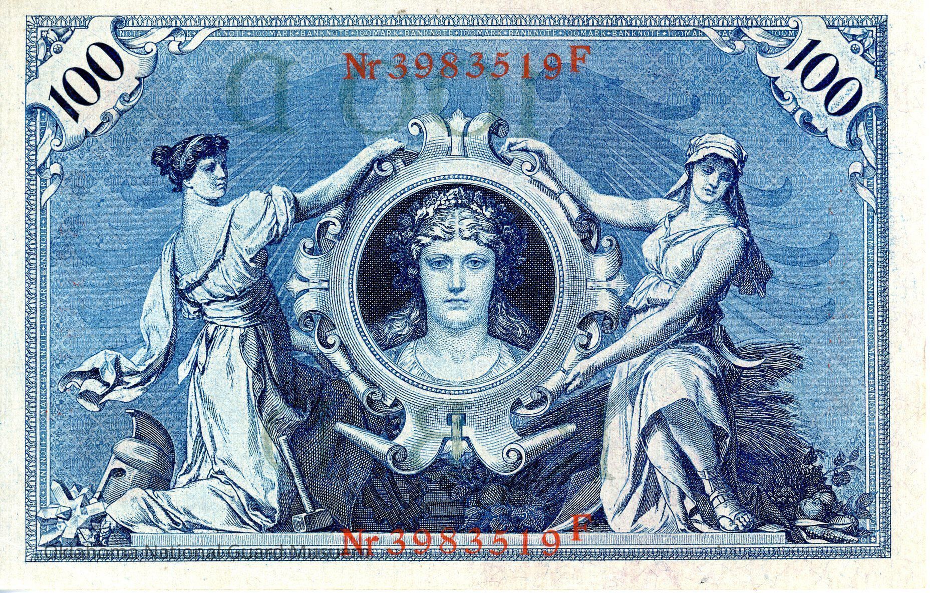 In the center, a woman's head (allegory of Germania) in a medallion supported by two young women (allegories of Industry and Agriculture). Horizontal prefix and numbering in red.