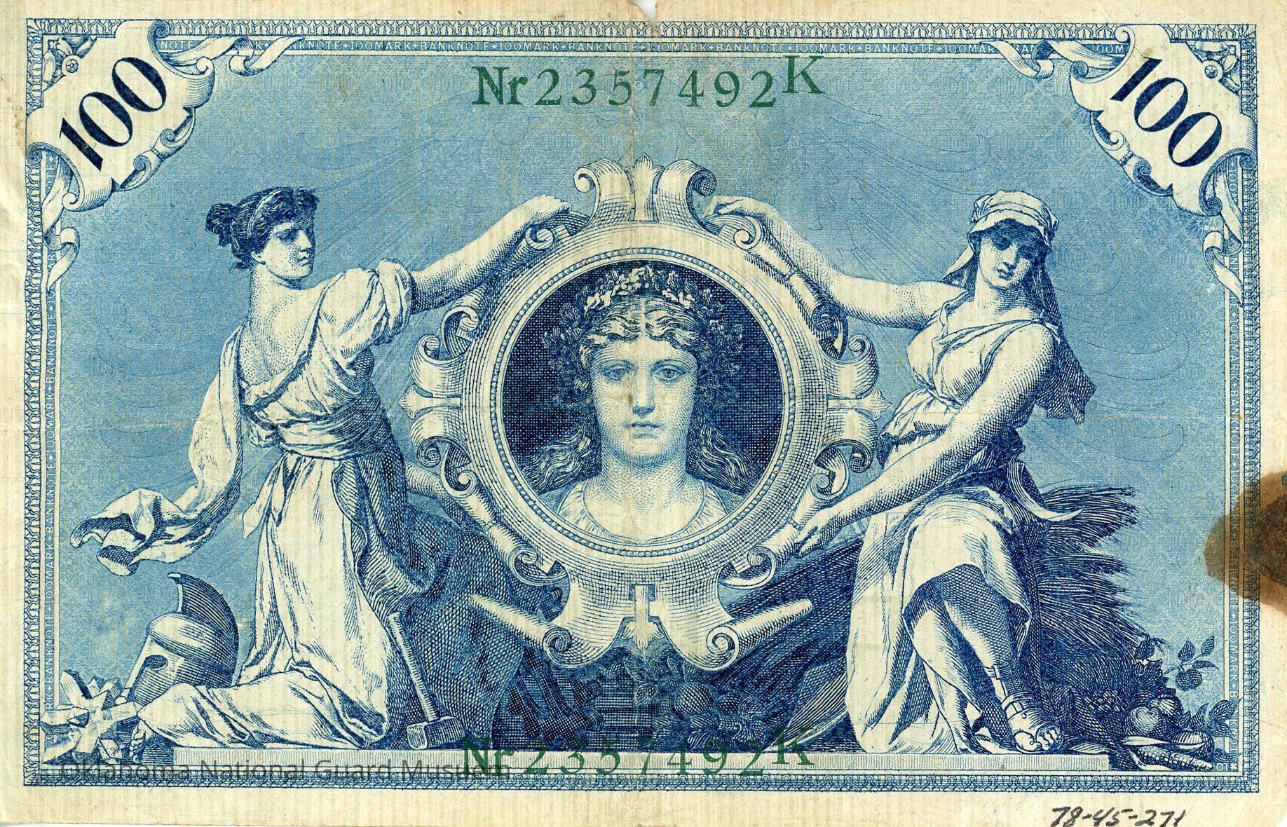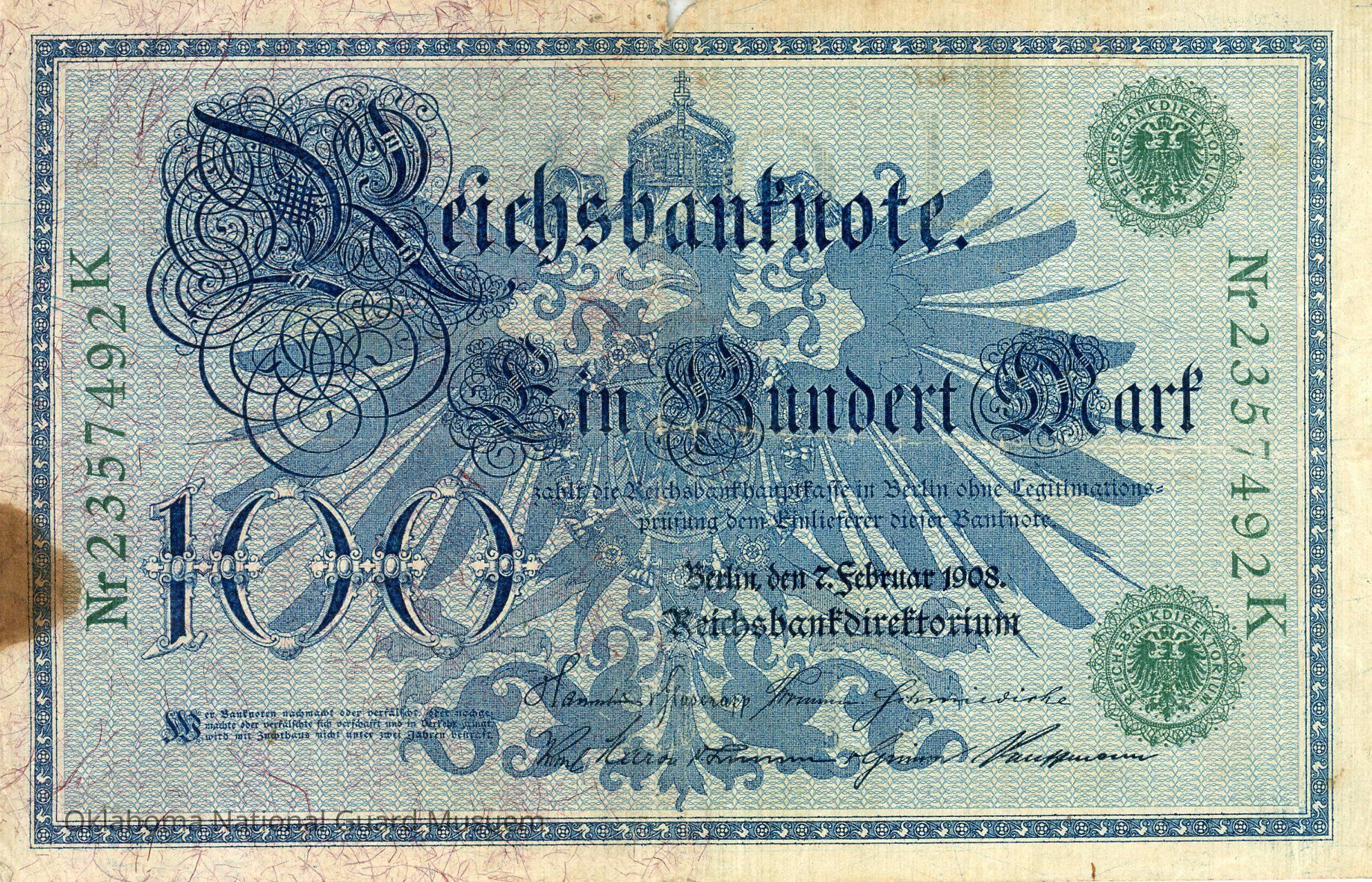 Top center is a faint grey numerical denomination 100. Across the center is a large, deep blue eagle with outstretched wings, crown & a shield breastplate. Superimposed over the eagle is German fraktur text in black and blue ink, including the denomination Ein Hundert Mark, and on the lower left, the denomination 100. Serial number is printed vertically on each side in green ink. On the upper and lower right is the bank seal with the Imperial eagle in green ink.Transcription